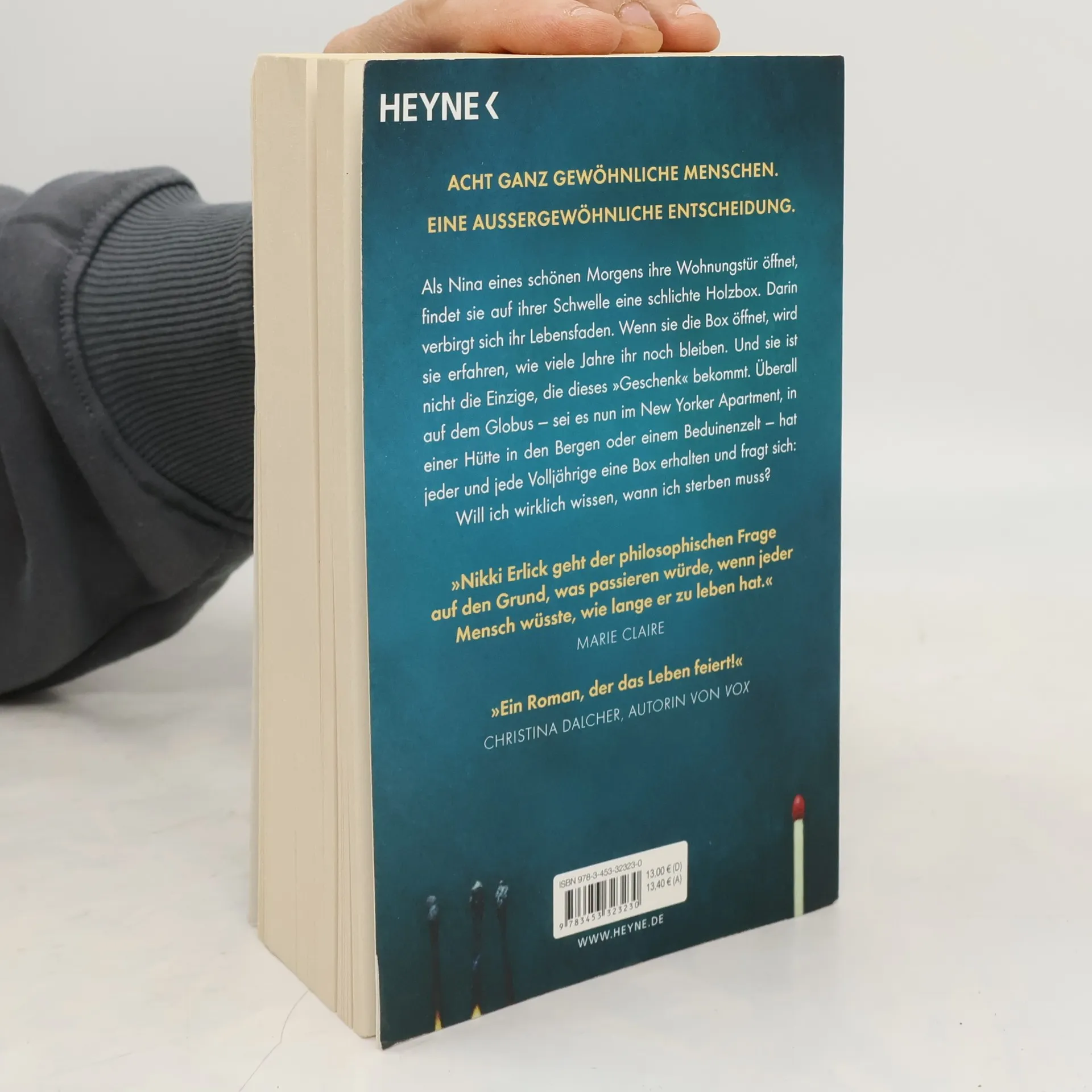 Als Nina eines schönen Morgens ihre Wohnungstür öffnet, findet sie auf ihrer Schwelle eine schlichte Holzbox. Darin verbirgt sich ihr Lebensfaden. Wenn sie die Box öffnet, wird sie erfahren, wie viele Jahre ihr noch bleiben. Und sie ist nicht die Einzige, die dieses »Geschenk« bekommt. Überall auf dem Globus – sei es nun im New Yorker Apartment, in einer Hütte in den Bergen oder einem Beduinenzelt – hat jeder Volljährige eine Box erhalten und fragt sich: Will ich wirklich wissen, wann ich sterben muss? Einfühlsam und klug erzählt Nikki Erlick, was mit der Gesellschaft, mit Beziehungen und mit jedem einzelnen Individuum passiert, wenn uns die eigene Sterblichkeit drastisch vor Augen geführt wird. »Die Vorhersage« ist ein berührender Roman über das Leben und das Sterben, über Freundschaft und Liebe und über das Menschsein selbst.
