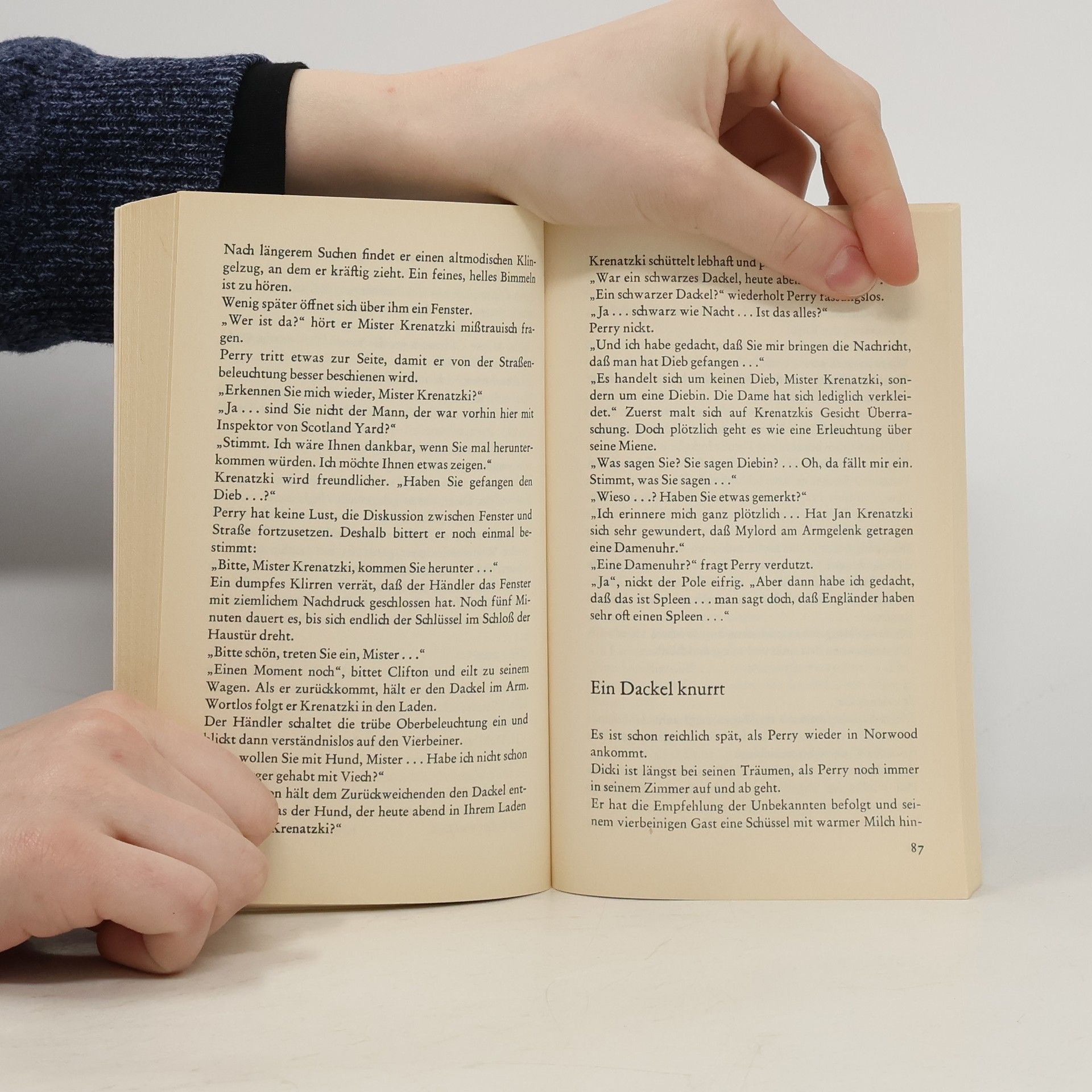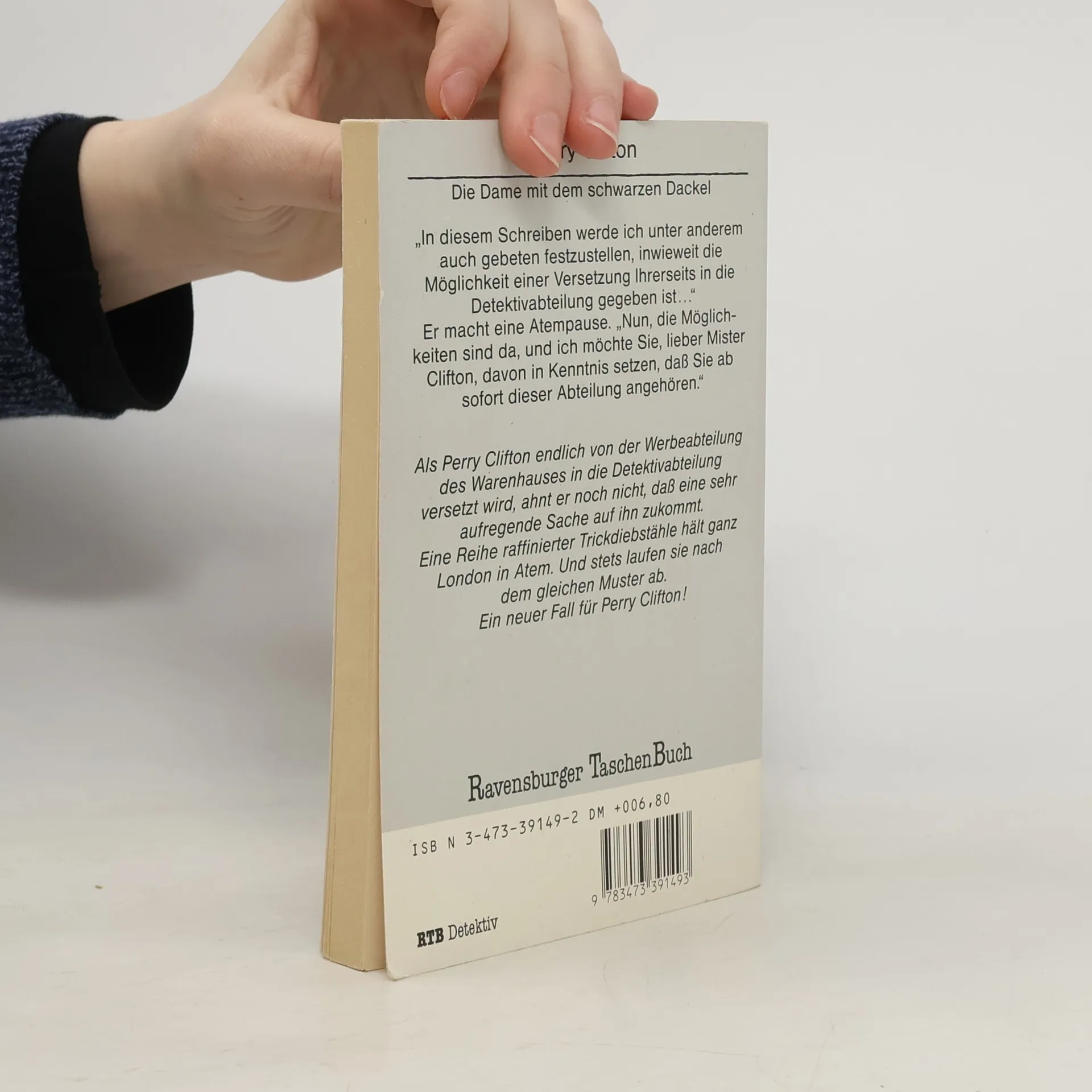Als Perry Clifton endlich von der Werbeabteilung des Warenhauses in die Detektivabteilung versetzt wird, ahnt er noch nicht, daß eine sehr aufregende Sache auf ihn zukommt. Eine Reihe raffinierter Trickdiebstähle hält ganz London in Atem. Stets wiederholt sich der gleiche Vorgang: In einem Kaufhaus oder Juweliergeschäft läßt sich eine Kundin wertvollen Schmuck zeigen – eins der Stücke fällt versehentlich zu Boden und ist spurlos verschwunden! Ein neuer Fall für Perry Clifton! Zusammen mit dem 12-jährigen Dicki Miller verfolgt er die Spuren dieser rätselhaften Diebstähle. Wer versteckt sich hinter der Maske jener Frau, die in immer neuen Verkleidungen als Käuferin auftritt? Und ist es nur Zufall, daß fast immer ein schwarzer Dackel in der Nähe des Tatorts beobachtet wird? Diesmal ist es Dicki, der seinem Freund einen wertvollen Hinweis zur Lösung des Falles geben kann.