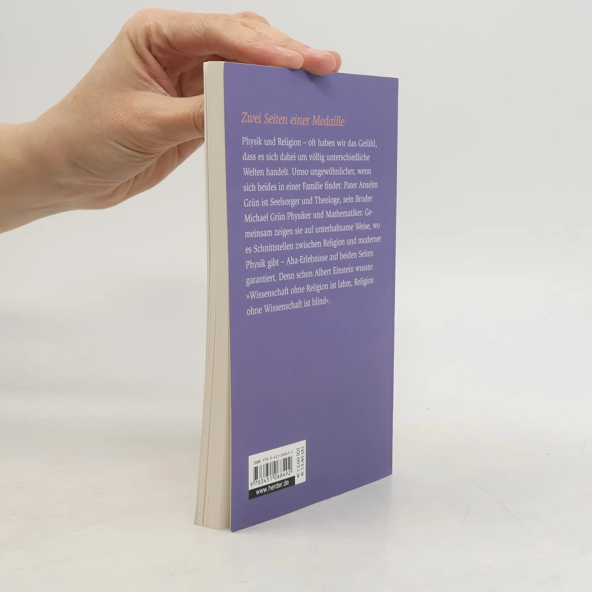 Physik und Religion gelten zu Unrecht als zwei völlig getrennte Welten. Anselm Grün und sein Bruder Michael Grün, ehemaliger Physik- und Mathematiklehrer, zeigen in diesem Buch, dass der Dialog zwischen Quantenphysik und Religion nicht nur sinnvoll, sondern auch fruchtbar sein kann. Verständlich und unterhaltsam beschreiben beide die Schnittstellen und zeigen, dass Religion und Wissenschaft oft nur zwei Seiten einer Medaille sind. Dieses Buch zeigt, dass beide – Physik und Religion – den Menschen Wege zur Lebensbewältigung und verschiedene Zugänge zur Erkenntnis der Wahrheit bieten können.