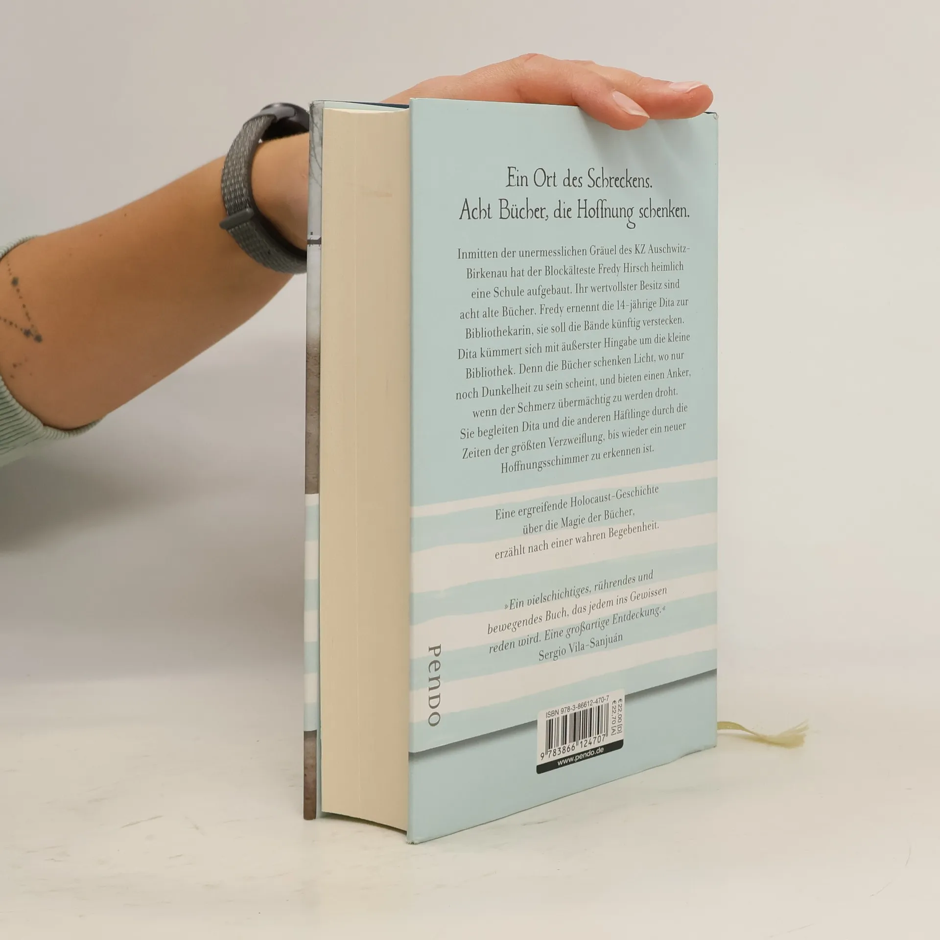Ein Ort des Schreckens. Acht Bücher, die alles ändern. Im alles verschlingenden Morast des Konzentrationslagers Auschwitz-Birkenau hat der Blockälteste Fredy Hirsch heimlich eine Schule aufgebaut. Ihr wertvollster Besitz sind acht alte, zerfallene Bücher. Fredy ernennt die 14-jährige Dita zur Bibliothekarin, sie soll die verbotenen Bände künftig verstecken und schützen. Dita, die schon früher Trost in Büchern gefunden hat, kümmert sich mit äußerster Hingabe um „ihre“ kleine Bibliothek. Und die Bücher geben zurück: Sie schenken Licht, wo nur noch Dunkelheit zu sein scheint, und bieten einen Anker, wo der Schmerz zu übermannen droht. Die Bücher begleiten Dita und die anderen Häftlinge durch die Zeiten der größten Verzweiflung, bis wieder ein neuer Hoffnungsschimmer zu erkennen ist. Eine ergreifende Auschwitz-Geschichte über die Magie der Bücher, erzählt nach einer wahren Begebenheit. »Ein vielschichtiges, rührendes und bewegendes Buch, das jedem ins Gewissen reden wird. Eine großartige Entdeckung.« Sergio Vila-Sanjuán »Ein mitreißendes und ergreifendes Werk« El Cultural »Ein unvergesslicher, herzzerreißender Roman« Publishers Weekly »Mit viel Fingerspitzengefühl, aber gnadenloser Ehrlichkeit erzählt Antonio Iturbe die Geschichte über das Familienlager und deren Insassen.« belletristik-couch. de