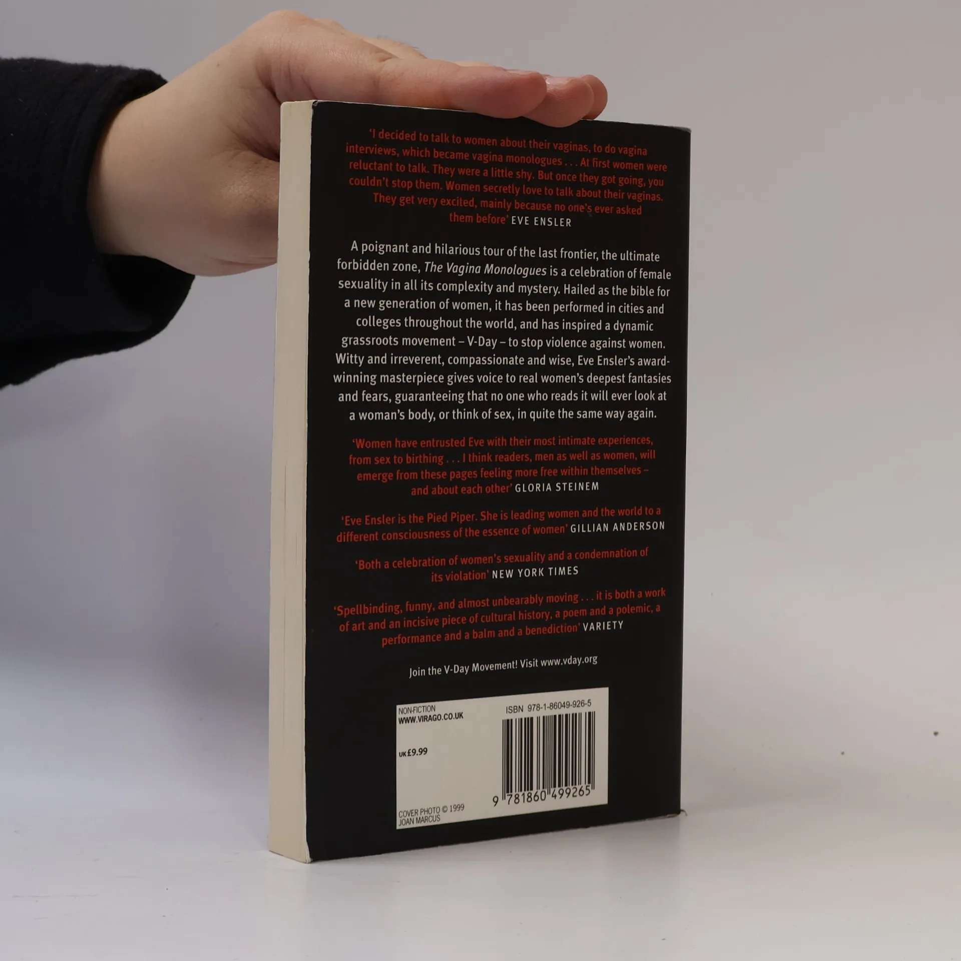 I decided to talk to women about their vaginas, to do vagina interviews, which became vagina monologues ...At first women were reluctant to talk. They were a little shy. But once they got going, you couldn't stop them. Women secretly love to talk about their vaginas. They get very excited, mainly because no one's ever asked them before.' Eve Ensler A poignant and hilarious tour of the last frontier, the ultimate forbidden zone, THE VAGINA MONOLOGUES is a celebration of female sexuality in all its complexity and mystery. Hailed as the bible for a new generation of women, it has been performed in cities and colleges throughout the world, and has inspired a dynamic grassroots movement -- V-Day -- to stop violence against women. Witty and irreverent, compassionate and wise, Eve Ensler's award-winning masterpiece gives voice to real women's deepest fantasies and fears, guaranteeing that no one who reads it will ever look at a woman's body, or think of sex, in quite the same way again.