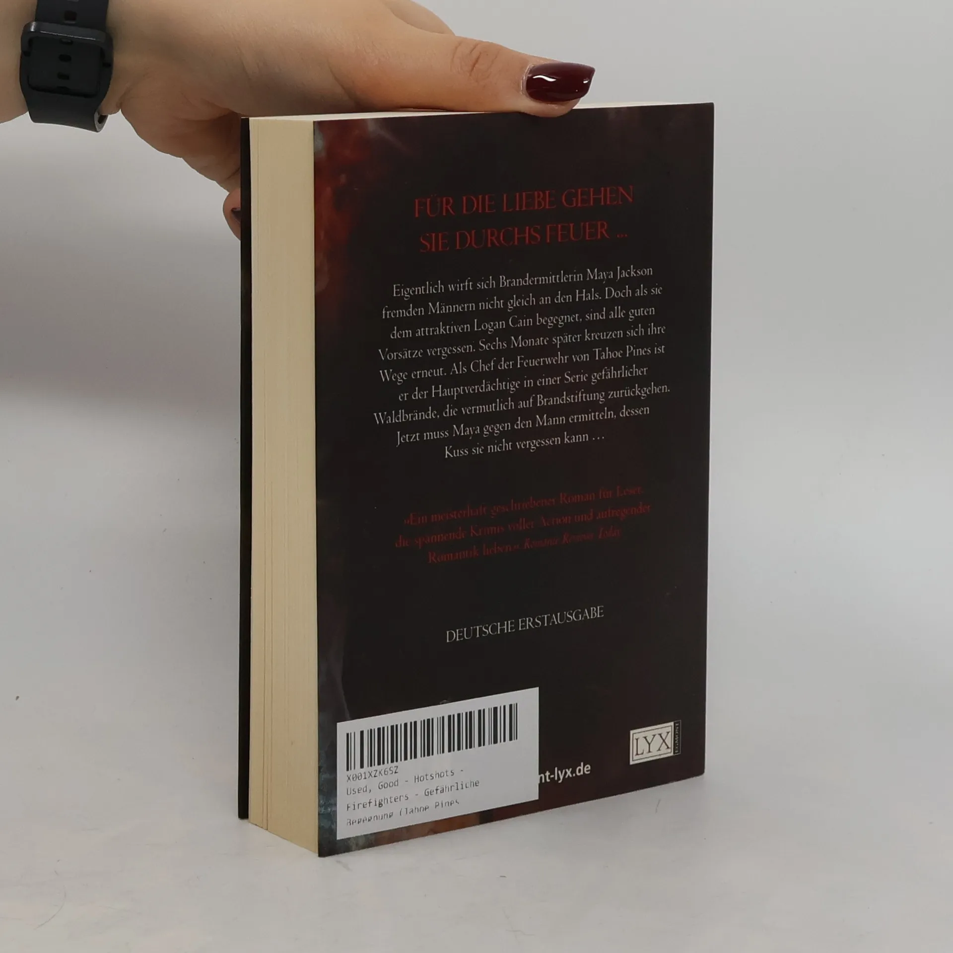 Für gewöhnlich wirft sich die Brandermittlerin Maya Jackson fremden Männern nicht gleich an den Hals. Doch als sie dem gut aussehenden Logan Cain begegnet, ändert sich das schlagartig – und sein Kuss geht ihr durch und durch. Sechs Monate später läuft ihr Logan erneut über den Weg. Als Chef der Feuerwehr von Tahoe Pines ist er der Hauptverdächtige in einer Serie gefährlicher Waldbrände, die vermutlich auf Brandstiftung zurückgehen. Doch Maya will nicht recht an Logans Schuld glauben. Gemeinsam machen sie sich auf die Suche nach dem wahren Brandstifter.