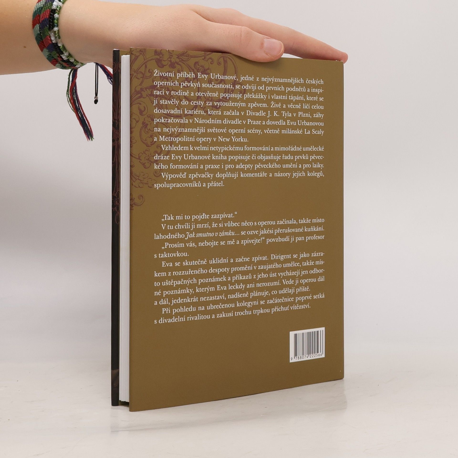 Životní příběh Evy Urbanové, jedné z nejvýznamnějších českých operních pěvkyň současnosti, se odvíjí od prvních podnětů a inspiraci v rodině a otevřeně popisuje překážky i vlastní tápání, které se jí stavělo do cesty za vytouženým zpěvem. Živě a věcně líčí celou dosavadní kariéru, která začala v Divadle J.K. Tyla v Plzni, záhy pokračovala v Národním divadle v Praze a dovedla Evu Urbanovou na nejvýznamnější světové operní scény, včetně milánské La Scaly a Metropolitní opery v New Yorku. Vzhledem k velmi netypickému formování a mimořádné umělecké dráze Evy Urbanové kniha popisuje či objasňuje řadu prvků pěveckého umění a pro laiky. Výpověď zpěvačky doplňují komentáře a názory jejich kolegů, spolupracovníků a přátel.