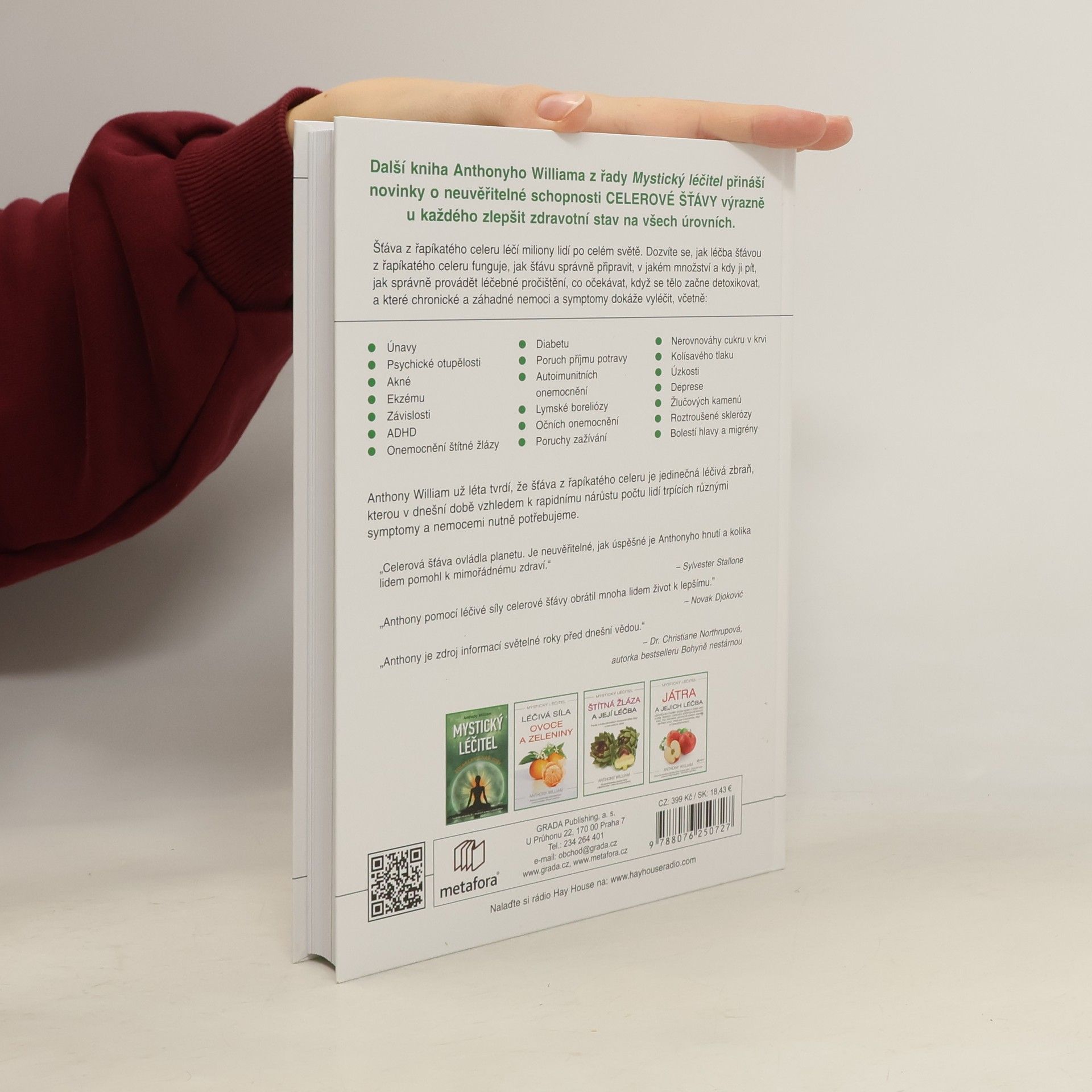 Další kniha Anthonyho Williama z řady Mystický léčitel seznamuje s neuvěřitelnou schopností celerové šťávy výrazně zlepšit zdravotní stav na všech úrovních. Šťáva z řapíkatého celeru léčí miliony lidí po celém světě. Dozvíte se, jak šťáva z řapíkatého celeru funguje, jak šťávu udělat, v jakém množství a kdy ji pít, jak správně provádět léčebné pročištění, co očekávat, když se tělo začne detoxikovat, a které chronické a záhadné nemoci a symptomy dokáže vyléčit, včetně: - Únavy - Psychické otupělosti - Akné - Ekzému - Závislosti - ADHD - Onemocnění štítné žlázy - Diabetu - Poruch příjmu potravy - Autoimunitních onemocnění - Lymské boreliózy - Očních nemocnění - Poruchy zažívání - Nerovnováhy cukru v krvi - Kolísavého tlaku Anthony William roky tvrdí, že šťáva z řapíkatého celeru je jedinečná léčivá zbraň, kterou v dnešní době vzhledem k rapidnímu nárůstu počtu lidí trpících různými symptomy a nemocemi nutně potřebujeme.