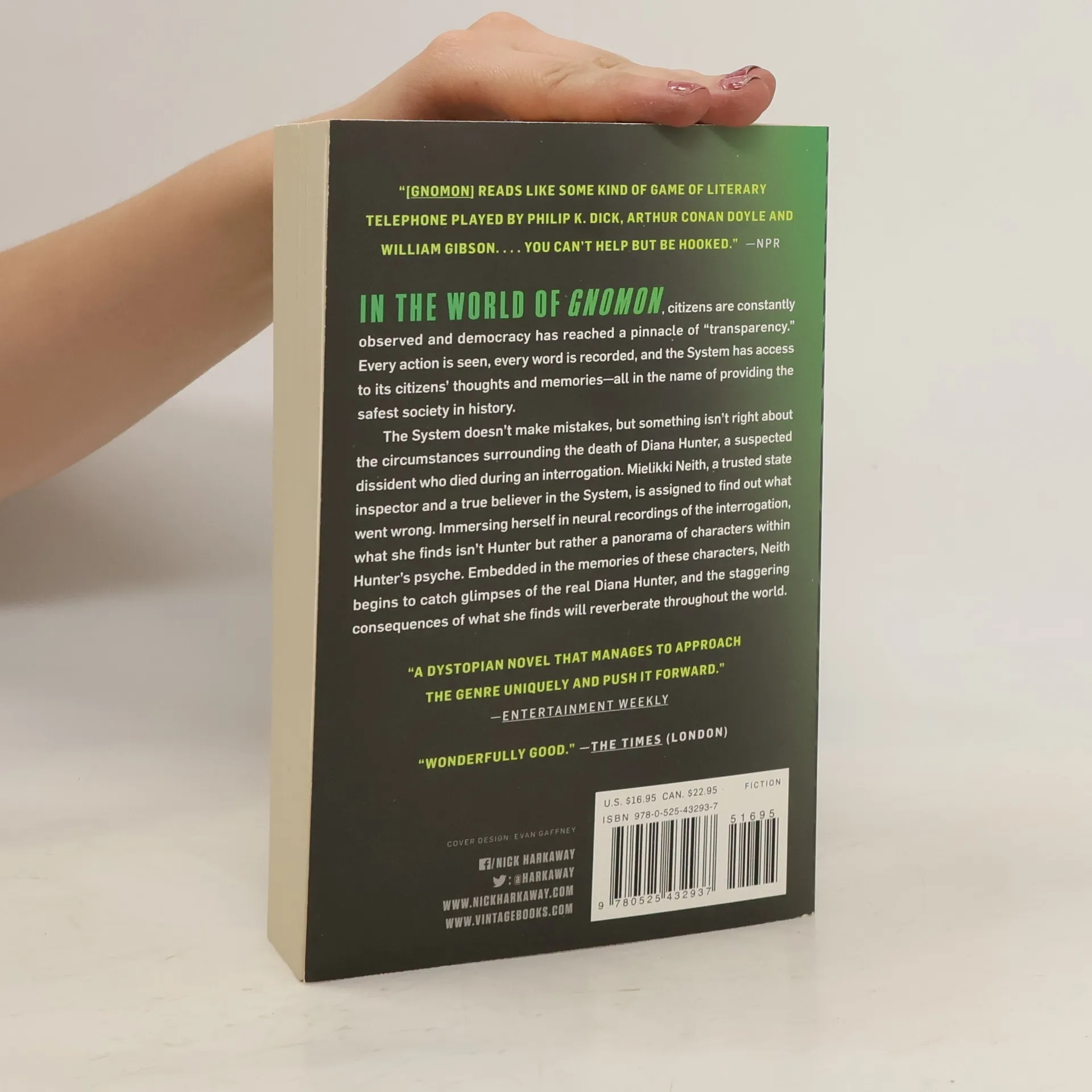 A Best Science Fiction Book of 2017 -- The Guardian From the widely acclaimed author of The Gone-Away World and Tigerman, comes a virtuosic new novel set in a near-future, high-tech surveillance state, that is equal parts dark comedy, gripping detective story, and mind-bending philosophical puzzle.In the world of Gnomon, citizens are constantly observed and democracy has reached a pinnacle of 'transparency.' Every action is seen, every word is recorded, and the System has access to its citizens' thoughts and memories--all in the name of providing the safest society in history.When suspected dissident Diana Hunter dies in government custody, it marks the first time a citizen has been killed during an interrogation. The System doesn't make mistakes, but something isn't right about the circumstances surrounding Hunter's death. Mielikki Neith, a trusted state inspector and a true believer in the System, is assigned to find out what went wrong. Immersing herself in neural recordings of the interrogation, what she finds isn't Hunter but rather a panorama of characters within Hunter's psyche: a lovelorn financier in Athens who has a mystical experience with a shark; a brilliant alchemist in ancient Carthage confronting the unexpected outcome of her invention; an expat Ethiopian painter in London designing a controversial new video game, and a sociopathic disembodied intelligence from the distant future.Embedded in the memories of these impossible lives lies a code which Neith must decipher to find out what Hunter is hiding. In the static between these stories, Neith begins to catch glimpses of the real Diana Hunter--and, alarmingly, of herself. The staggering consequences of what she finds will reverberate throughout the world.A dazzling, panoramic achievement, and Nick Harkaway's most brilliant work to date, Gnomon is peerless and profound, captivating and irreverent, as it pierces through strata of reality and consciousness, and illuminates how to set a mind free. It is a truly accomplished novel from a mind possessing a matchless wit infused with a deep humanity.