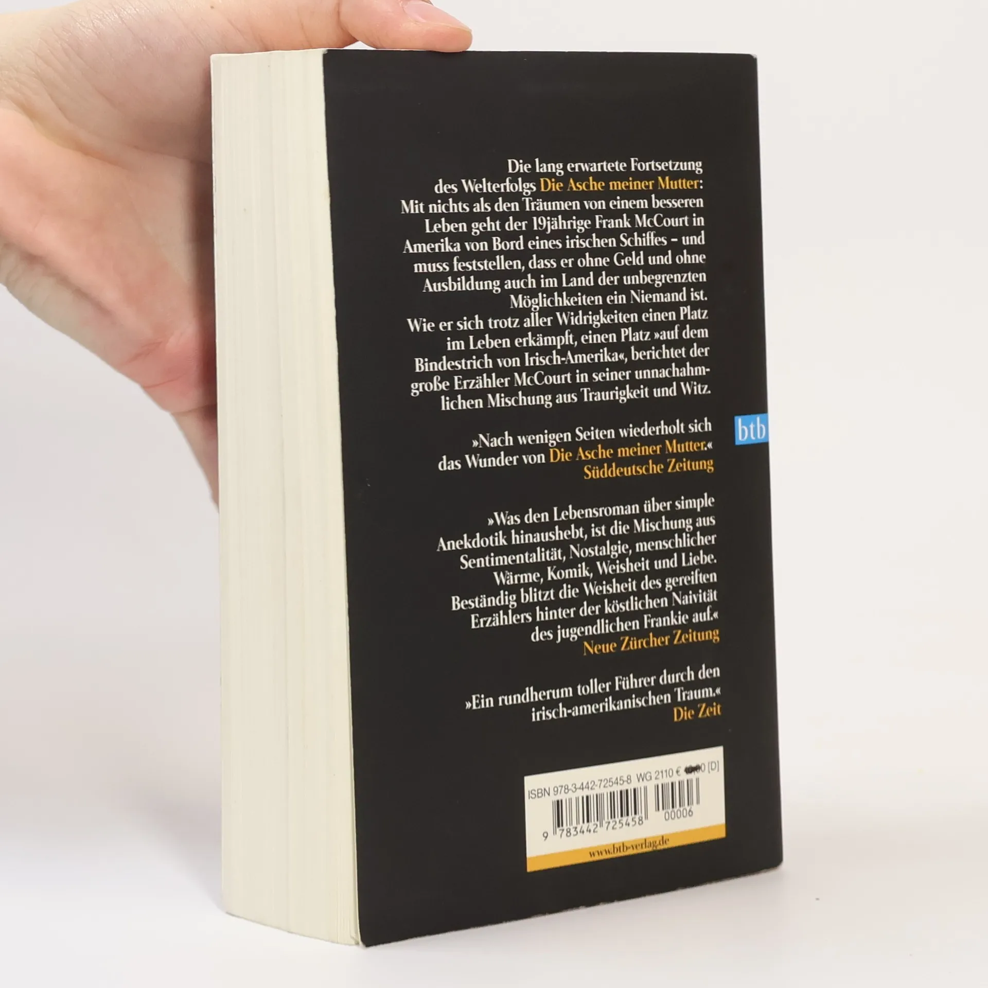 „‘Die Asche meiner Mutter‘ ist so gut – sie verdient eine Fortsetzung.“ So schrieb die New York Times über Frank McCourts Bestseller. Mit dem vorliegenden Buch erfüllte der Autor nicht nur den Wunsch seines Rezensenten, sondern auch die Hoffnungen der Millionen von begeisterten Lesern und schrieb seine Geschichte fort. „Ein rundherum tolles Land“ beginnt dort, wo der erste Teil endet: als Frank McCourt mit 19 Jahren an Bord eines irischen Schiffes nach Amerika kommt und nichts hat als die Hoffnung auf eine bessere Zukunft. Arm, mit schlechten Zähnen und entzündeten Augen, ohne jede nennenswerte Ausbildung, erreicht er das Land seiner Träume – und muss feststellen, dass er mit seinem Aussehen und seinem irischen Akzent ein Nichts ist. Wie er sich trotz aller Widrigkeiten einen Platz im Leben erkämpft, einen Platz „auf dem Bindestrich von Irisch-Amerika“, berichtet der große Erzähler McCourt in seiner unnachahmlichen Mischung aus Traurigkeit und Witz. Seine unglaublichen Geschichten über Priester und Jungfrauen, über irische Kneipen, bayrische Bierkeller und die merkwürdigen Sitten der Amerikaner im Allgemeinen verbinden sich zu einer augenzwinkernden Hommage an das Land der unbegrenzten Möglichkeiten, in der „toll“ nicht nur „großartig“ bedeutet.