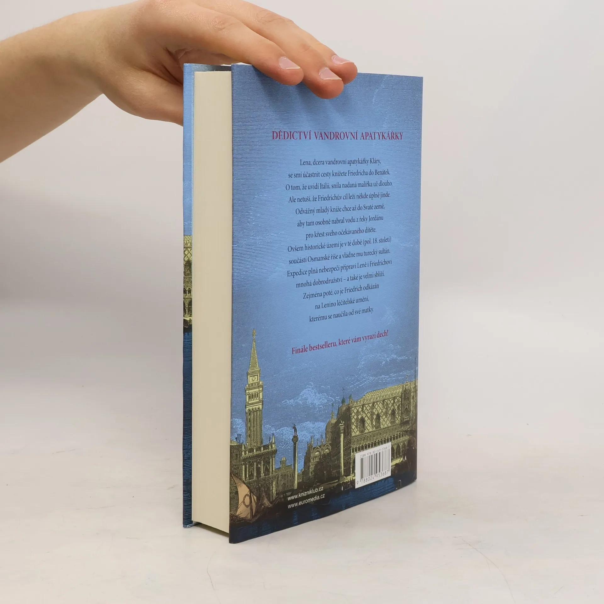 Finále tetralogie o vandrovní apatykářce nás zavede do Benátek a posléze i do Svaté země, která je v pol. 18. století součástí Osmanské říše a vládne jí turecký sultán. Expedice plná nebezpečí připraví Leně, dceři vandrovní apatykářky, i knížeti Friedrichovi četná dobrodružství a také je velmi sblíží. Zejména poté, co je Friedrich odkázán na Lenino léčitelské umění, kterému se naučila od své matky Kláry.