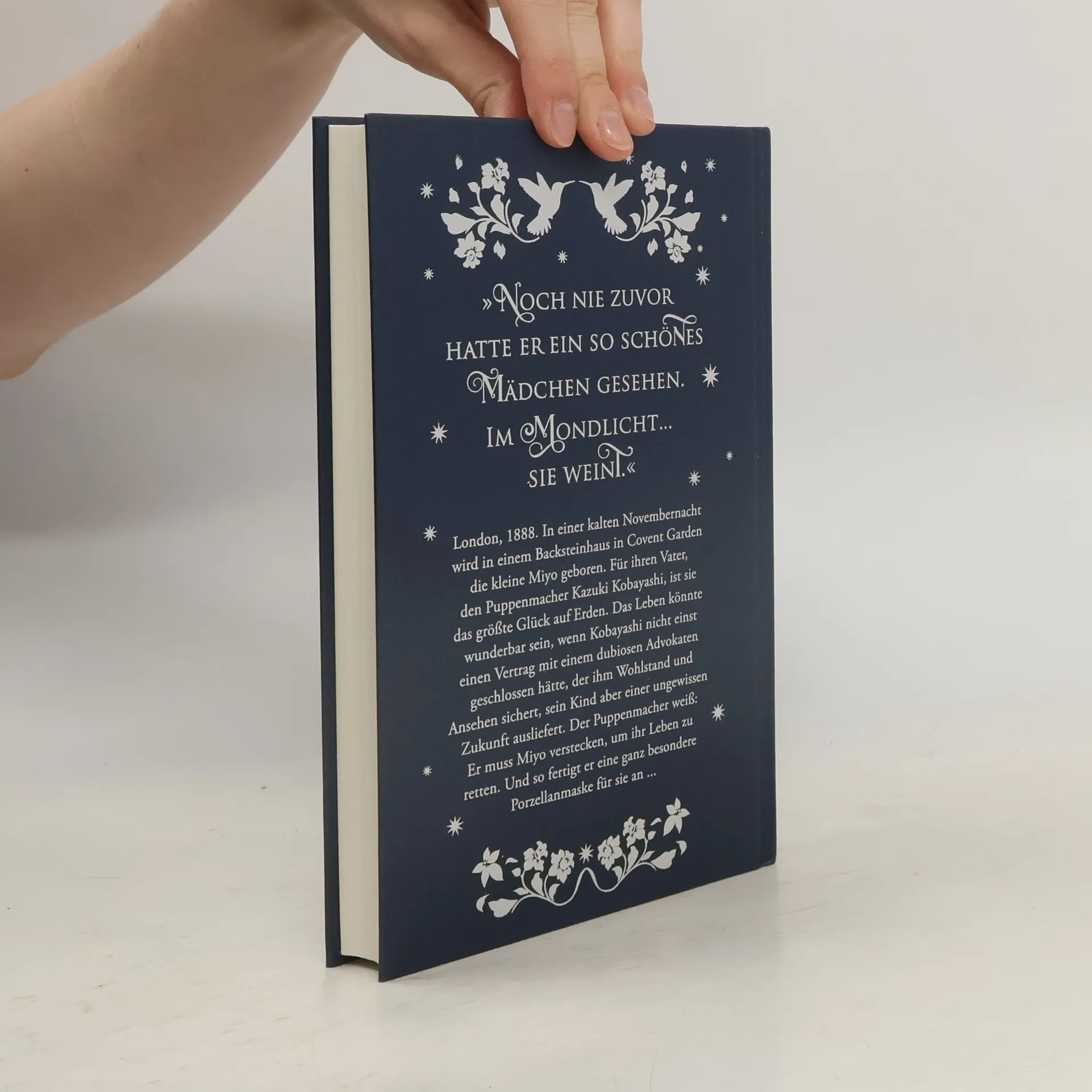 »Noch nie zuvor hat er ein so schönes Mädchen gesehen. Im Mondlicht. Und sie weint...« London, 1888. In einer kalten Novembernacht wird in einem Backsteinhaus in Covent Garden die kleine Miyo geboren. Für ihren Vater, den Puppenmacher Kazuki Kobayashi, ist sie das größte Glück auf Erden. Das Leben könnte wunderbar sein, wenn Kobayashi nicht einst einen Vertrag mit einem dubiosen Advokaten geschlossen hätte, der ihm Wohlstand und Ansehen sichert, sein Kind aber einer ungewissen Zukunft ausliefert... Der Puppenmacher kommt zu dem einzig logischen Schluss: Er muss Miyo verstecken, um ihr Leben zu retten. Dazu fertigt er eine ganz besondere Porzellanmaske an, ein feines, aber regungsloses Gesicht, das er sonst für seine Puppen entwirft. Die Maske soll seine Tochter vor dem Advokaten verbergen. Doch die Ausdruckslosigkeit verdammt Miyo zu einem Leben in Isolation – nur wenige machen sich die Mühe, hinter die kalte Fassade der Porzellanmaske zu blicken. Aber in anderen Außenseitern findet Miyo treue Freunde, die sie auf ihrer abenteuerlichen Flucht vor dem teuflischen Advokaten begleiten. Und endlich findet sie auch die Liebe, nach der sie sich schon immer gesehnt hat.