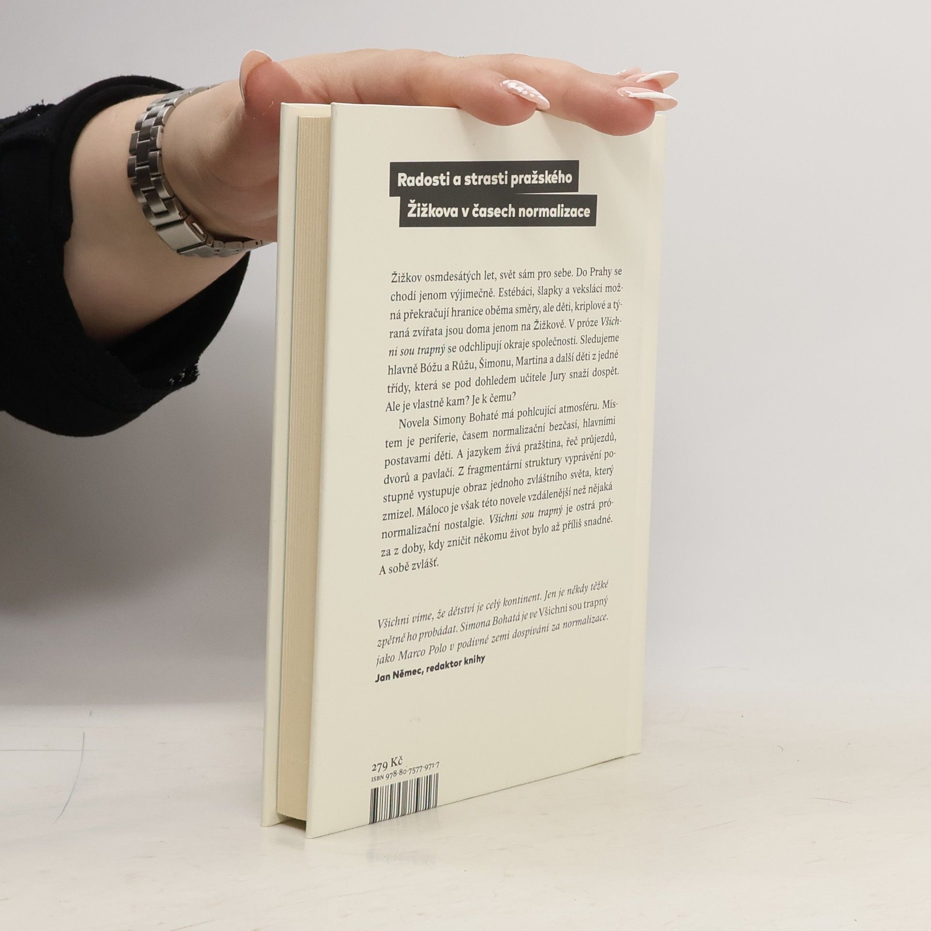 Puberťáci Bóža a Růža bez sebe nedají ani ránu. Martin s nikým nemluví a je tajemný jako hrad v Karpatech. Holky se pošťuchují a soutěží v trapnosti — myslí si kluci. Až na to, že by s holkama taky chtěli něco mít. Třeba Šimona — ta má doma dokonce video! Všichni jsou z jedné třídy a pod dohledem učitele Jury se tak nějak snaží dospět. V kulisách Žižkova osmdesátých let. Do Prahy se chodí jenom výjimečně — Žižkov je svět sám pro sebe, Praha je velký svět. Estébáci, šlapky a veksláci možná překračují hranice oběma směry, ale děti, kriplové a týraná zvířata jsou doma jenom na Žižkově. Simona Bohatá přichází s novelou, která má výraznou atmosféru. Místem je periferie, časem normalizační bezčasí, hlavními postavami děti. A jazykem živá pražština, řeč průjezdů, dvorů a pavlačí. Z fragmentární struktury vyprávění postupně vystupuje obraz jednoho zvláštního světa, který dnes už téměř zmizel. Máloco je však této novele vzdálenější než nějaká normalizační nostalgie. Román Všichni sou trapný je ostrá próza z doby, kdy zničit někomu život bylo až příliš snadné. A sobě zvlášť.