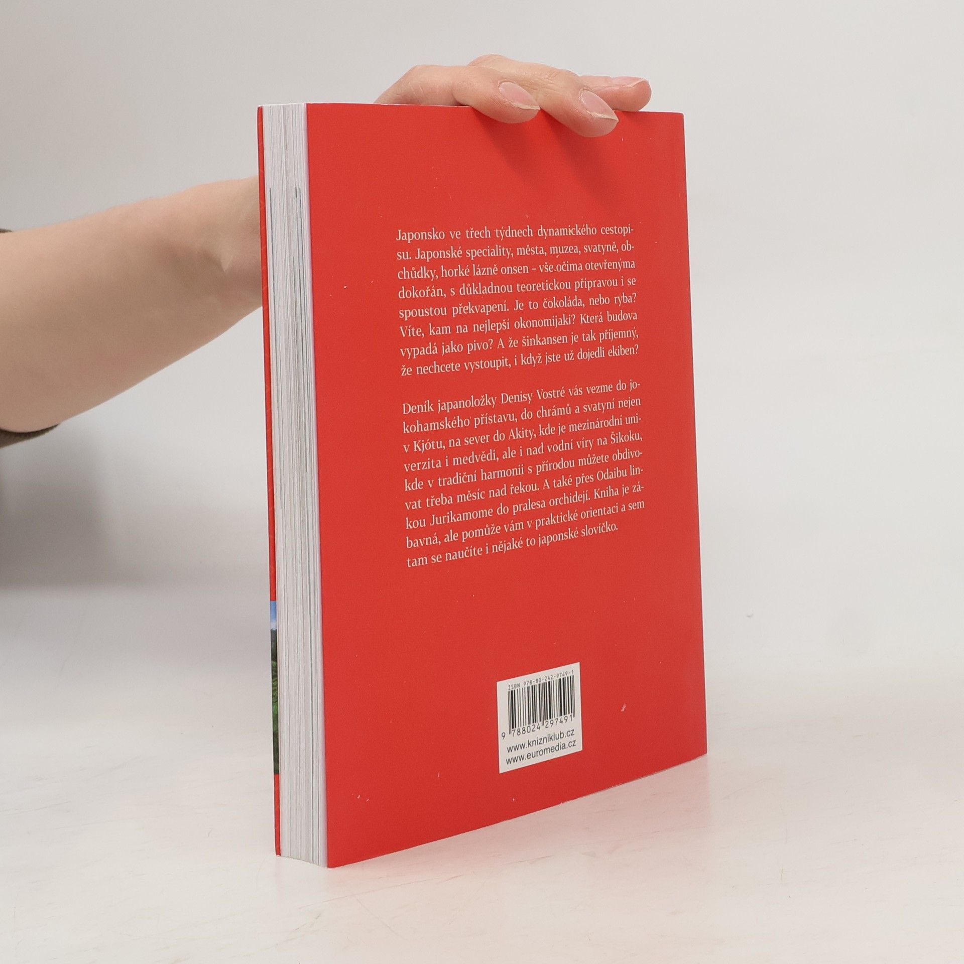 Japonsko ve třech týdnech dynamického cestopisu. Japonské speciality, města, muzea, svatyně, obchůdky, horké lázně onsen – vše očima otevřenýma dokořán, s důkladnou teoretickou přípravou i se spoustou překvapení. Je to čokoláda, nebo ryba? Víte, kam na nejlepší okonomijaki? Která budova vypadá jako pivo? A že šinkansen je tak příjemný, že nechcete vystoupit, i když jste už dojedli ekiben? Deník japanoložky Denisy Vostré vás vezme do jokohamského přístavu, do chrámů a svatyní nejen v Kjótu, na sever do Akity, kde je mezinárodní univerzita i medvědi, či nad vodní víry na Šikoku, kde v tradiční harmonii s přírodou můžete obdivovat třeba měsíc nad řekou. A také přes Odaibu linkou Jurikamome do pralesa orchidejí. Kniha je zábavná, ale pomůže vám v praktické orientaci a sem tam se naučíte i nějaké to japonské slovíčko.