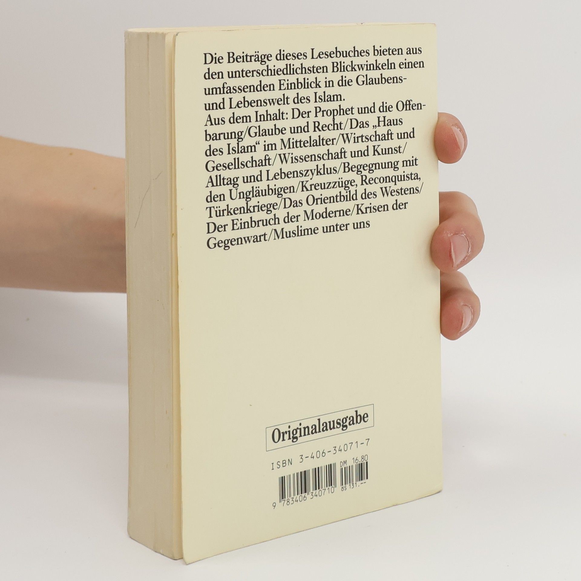 Die Beiträge dieses Lesebuches geben aus den unterschiedlichsten Blickwinkeln einen umfassenden Einblick in die Glaubens- und Lebenswelt des Islam. Ausgehend von Mohammed, dem "Verkünder des Islam", zeigt der Band, wie die islamischen Gesellschaften des Vorderen Orients, Afrikas und Asiens aus der Verschmelzung lokaler Traditionen mit der neuen Religion entstanden sind. Bis heute wird von den Muslimen nostalgisch die glanzvolle arabisch-islamische Kultur des frühen Mittelalters beschworen. Sie lebte in einem spannungsreichen Verhältnis zum Abendland, wobei Phasen fruchtbaren Austauschs und kriegerischer Konfrontation ineinander übergingen. Das "Feindbild Islam" hat lange Tradition, wie Texte aus der Zeit der Kreuzzüge und der Türkenkriege belegen. Europa entpuppte sich mehr und mehr als konkrete Bedrohung der eigenen Unabhängigkeit und der in der islamischen Tradition verwurzelten Identität - Ursache für die bis heute anhaltenden Auseinandersetzungen zwischen den beiden Kulturen.Aus dem Inhalt: Der Prophet und die Offenbarung/Glaube und Recht/Das "Haus des Islam" im Mittelalter/Wirtschaft und Gesellschaft/Wissenschaft und Kunst/Alltag und Lebenszyklus/Begegnungen mit Ungläubigen/Kreuzzüge, Reconquista, Türkenkriege/Das Orientbild des Westens/Der Einbruch der Moderne/Krisen der Gegenwart/Muslime unter uns
