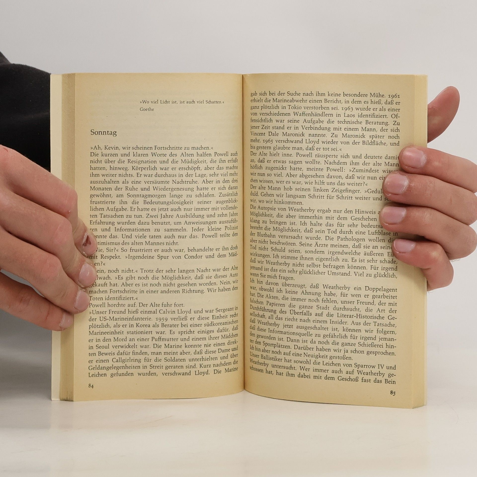 Malcolms Job ist die Analyse von Spionage- und Kriminalromanen für die »Amerikanische Literaturgeschichtliche Gesellschaft« in Washington, alias »Sektion 9, Abteilung 17« der CIA. Doch plötzlich wird aus geruhsamer Lektüre Wirklichkeit. Während Malcolm gerade Sandwiches für seine Kollegen aus einer benachbarten Snackbar holt, werden das Gebäude der Gesellschaft überfallen und seine Kollegen ermordet. Er ist sicher, daß die Auftraggeber für diesen Coup irgendwo in der CIA selbst sitzen müssen, und bald wird ihm klar, daß auch er gesucht und gejagt wird. Malcolm taucht unter, und eine Menschenjagd großen Stils beginnt. CIA, FBI, die Polizei der Stadt Washington und Agenten eines fremden Geheimdienstes sind ihm auf den Fersen. Sechs Tage lang kommt er nicht zur Ruhe, und nur um Haaresbreite entwischt er den bezahlten Killern der anderen Seite und seinen eigenen Leuten, die ihn wegen Mordes suchen.