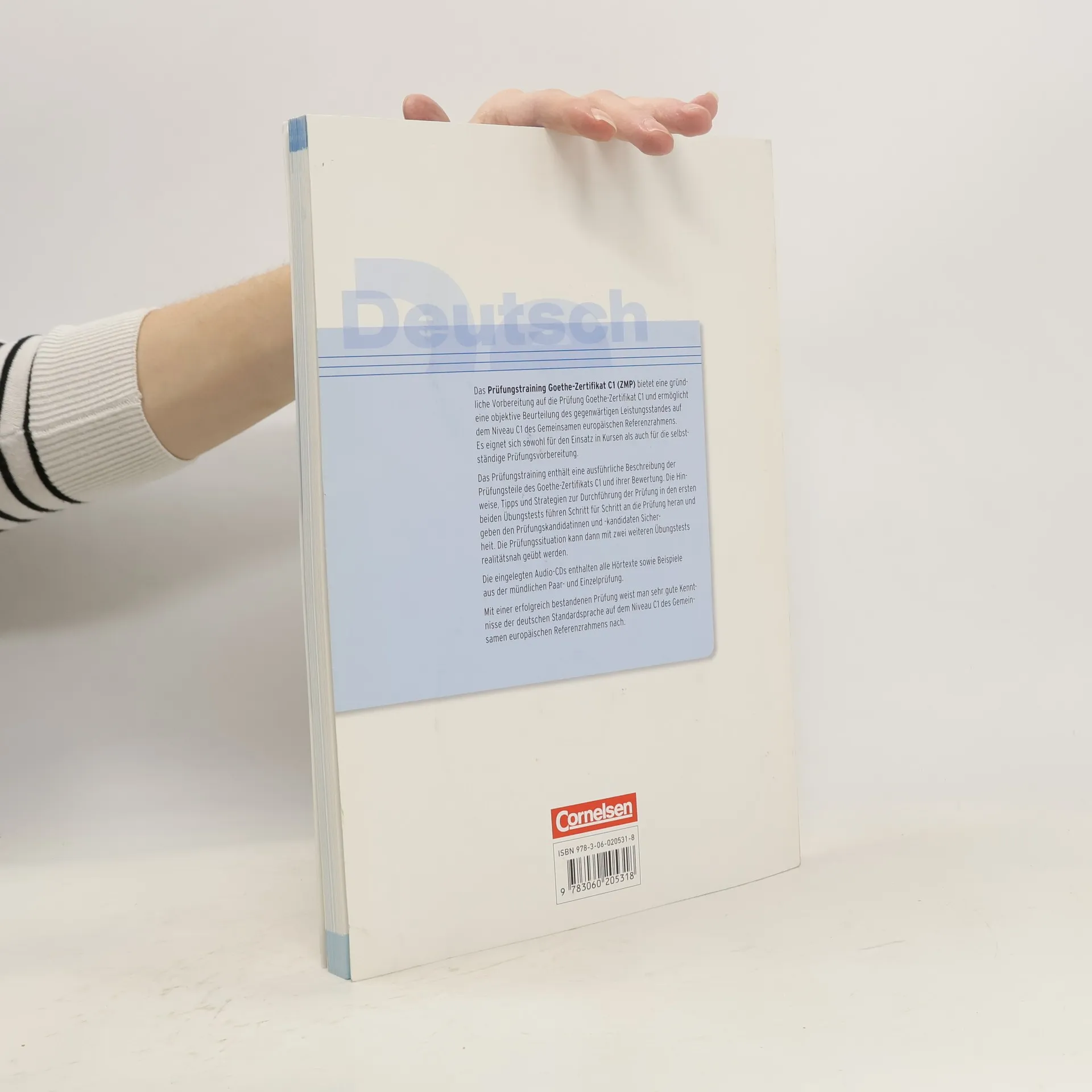 Das Prüfungstraining Goethe-Zertifikat C1 (ZMP) bietet eine gründliche Vorbereitung auf die Prüfung Goethe-Zertifikat C1 und ermöglicht eine objektive Beurteilung des gegenwärtigen Leistungsstandes auf dem Niveau C1 des Gemeinsamen europäischen Referenzrahmens. Es eignet sich sowohl für den Einsatz in Kursen als auch für die selbstständige Prüfungsvorbereitung. Das Prüfungstraining enthält eine ausführliche Beschreibung der Prüfungsteile des Goethe-Zertifikats C1 und ihrer Bewertung. Die Hinweise, Tipps und Strategien zur Durchführung der Prüfung in den ersten beiden Ubungstests führen Schritt für Schritt an die Prüfung heran und geben den Prüfungskandidatinnen und -kandidaten Sicherheit. Die Prüfungssituation kann dann mit zwei weiteren Ubungstests realitätsnah geübt werden. Die eingelegten Audio-CDs enthalten alle Hörtexte sowie Beispiele aus der mündlichen Paar- und Einzelprüfung. Mit einer erfolgreich bestandenen Prüfung weist man sehr gute Kenntnisse der deutschen Standardsprache auf dem Niveau C1 des Gemeinsamen europäischen Referenzrahmens nach.