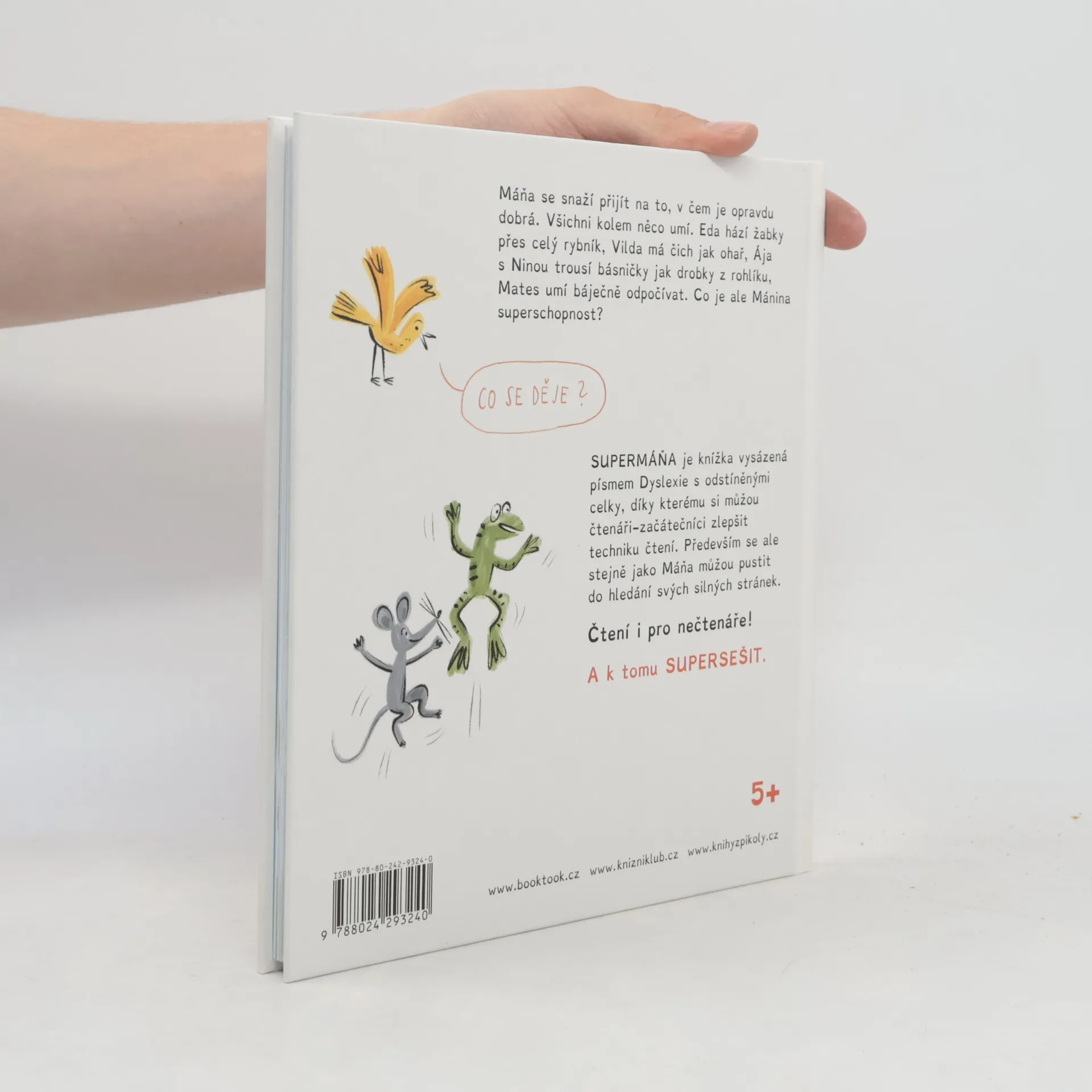 Máňa se snaží přijít na to, v čem je opravdu dobrá. Všichni kolem něco umí. Eda hází žabky přes celý rybník, Vilda má čich jak ohař, Ája s Ninou trousí básničky jak drobky z rohlíku, Mates umí báječně odpočívat. Co je ale Mánina superschopnost? Supermáňa je knížka vysázená písmem Dyslexie s odstíněnými celky. Díky tomu si můžou čtenáři začátečníci zlepšit techniku čtení. Především se ale stejně jako Máňa můžou pustit do hledání svých silných stránek. Čtení i pro nečtenáře!