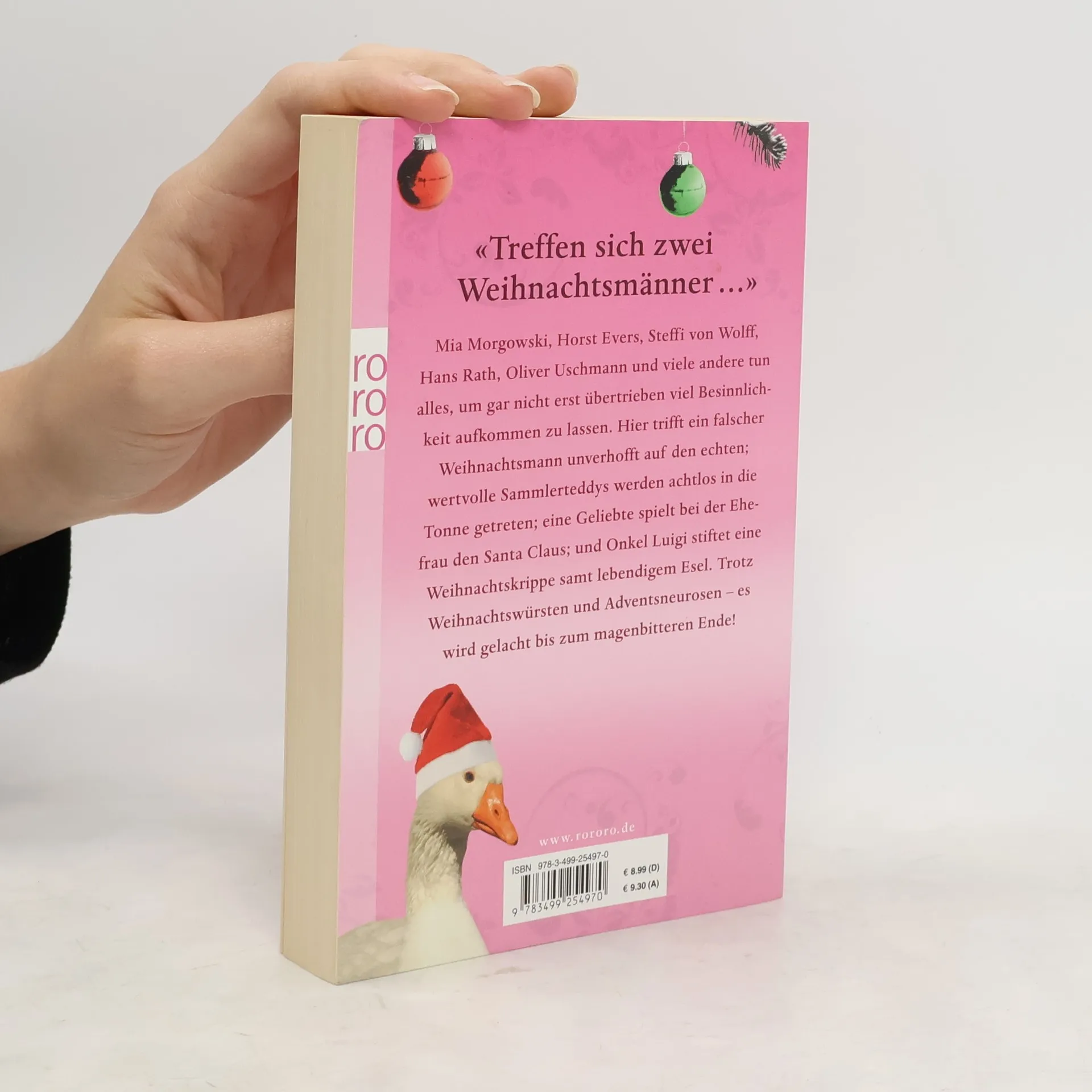 «Treffen sich zwei Weihnachtsmänner …» Mia Morgowski, Horst Evers, Steffi von Wolff, Hans Rath, Oliver Uschmann und viele andere tun alles, um gar nicht erst übertrieben viel Besinnlichkeit aufkommen zu lassen. Hier trifft ein falscher Weihnachtsmann unverhofft auf den echten; wertvolle Sammlerteddys werden achtlos in die Tonne getreten; eine Geliebte spielt bei der Ehefrau den Santa Claus; und Onkel Luigi stiftet eine Weihnachtskrippe samt lebendigem Esel. Trotz Weihnachtswürsten und Adventsneurosen – es wird gelacht bis zum magenbitteren Ende!