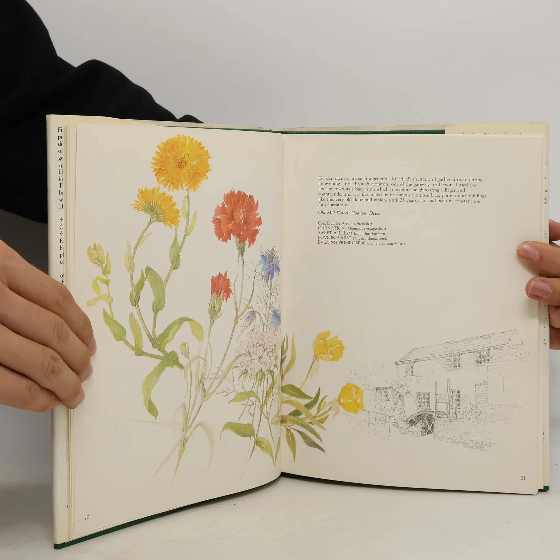 Finely-detailed pencil sketches provide the perfect complement to delicate brushwork in this celebration of England's flowers and gardens.