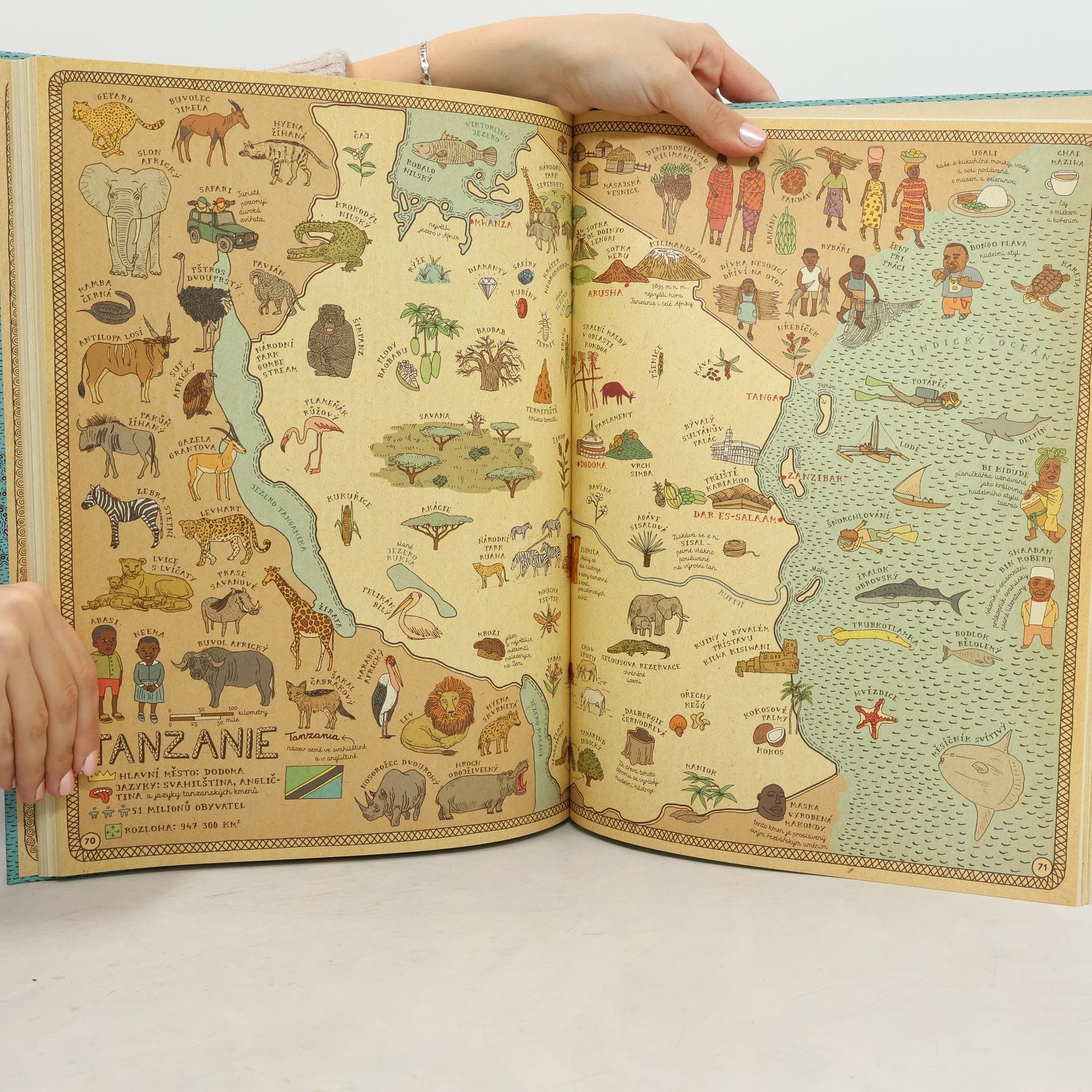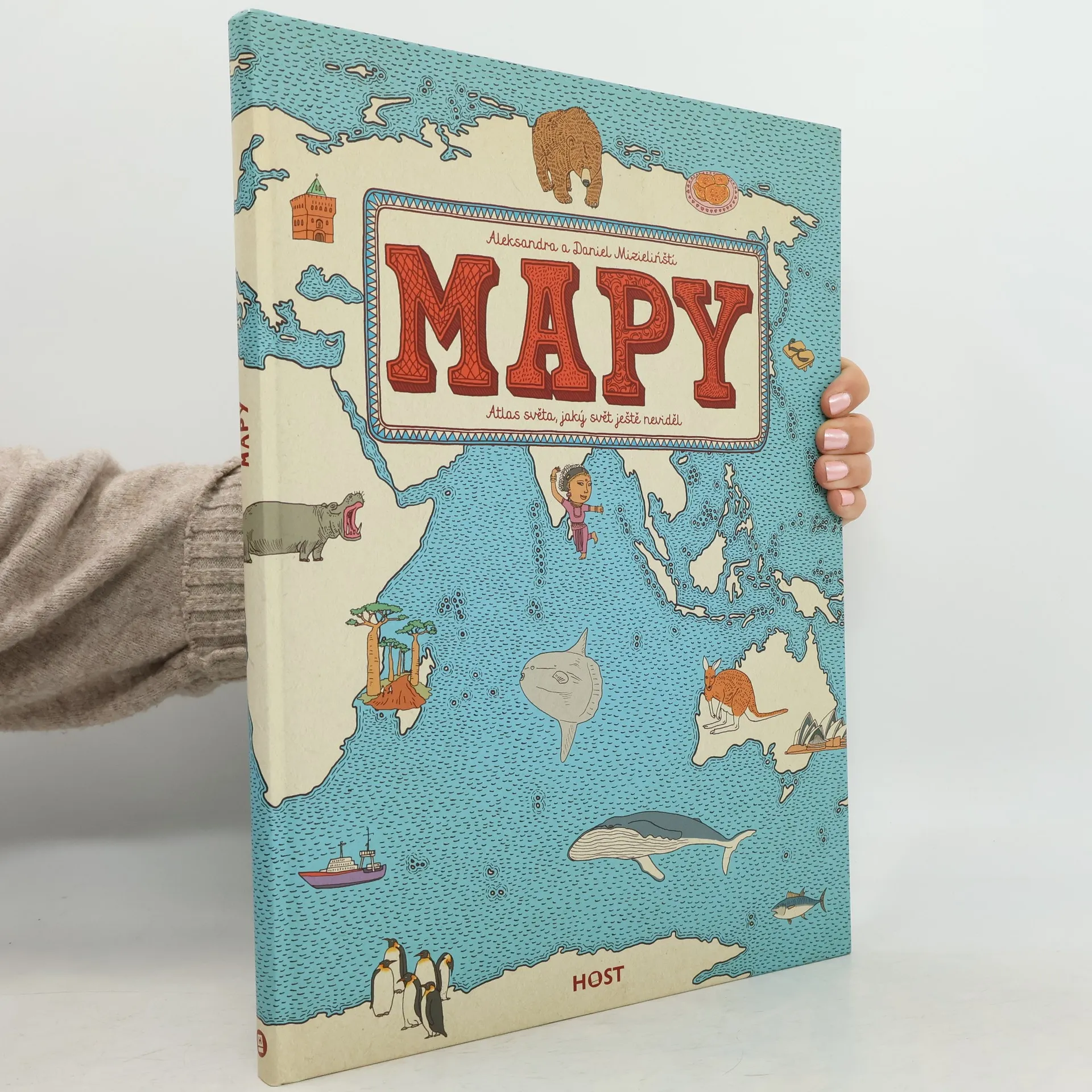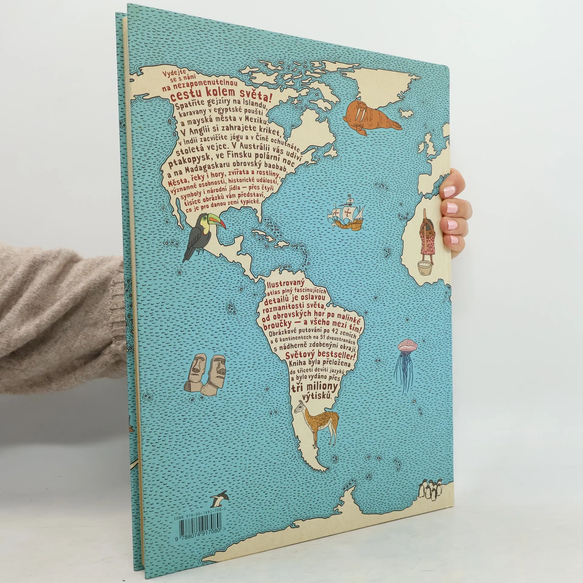 Vydejte se s námi na nezapomenutelnou cestu kolem světa... Spatříte gejzíry na Islandu, karavany v egyptské poušti a mayská města v Mexiku. V Anglii si zahrajete kriket, v Indii zacvičíte jógu a v Číně ochutnáte stoletá vejce. V Austrálii vás udiví ptakopysk, ve Finsku polární noc a na Madagaskaru obrovský baobab. Města, řeky i hory, zvířata a rostliny, významné osobnosti, historické události, symboly i národní jídla — přes čtyři tisíce obrázků vám představí, co je pro danou zemi typické. Obrázkové putování po dvaačtyřiceti zemích a šesti kontinentech na jednapadesáti dvoustranách s nádherně zdobenými okraji, které připomínají mapy dávných objevitelů a mořeplavců. Ilustrovaný atlas plný fascinujících detailů je oslavou rozmanitosti světa, od obrovských hor po malinké broučky — a všeho mezi tím. Atlas světa, jaký svět ještě neviděl!