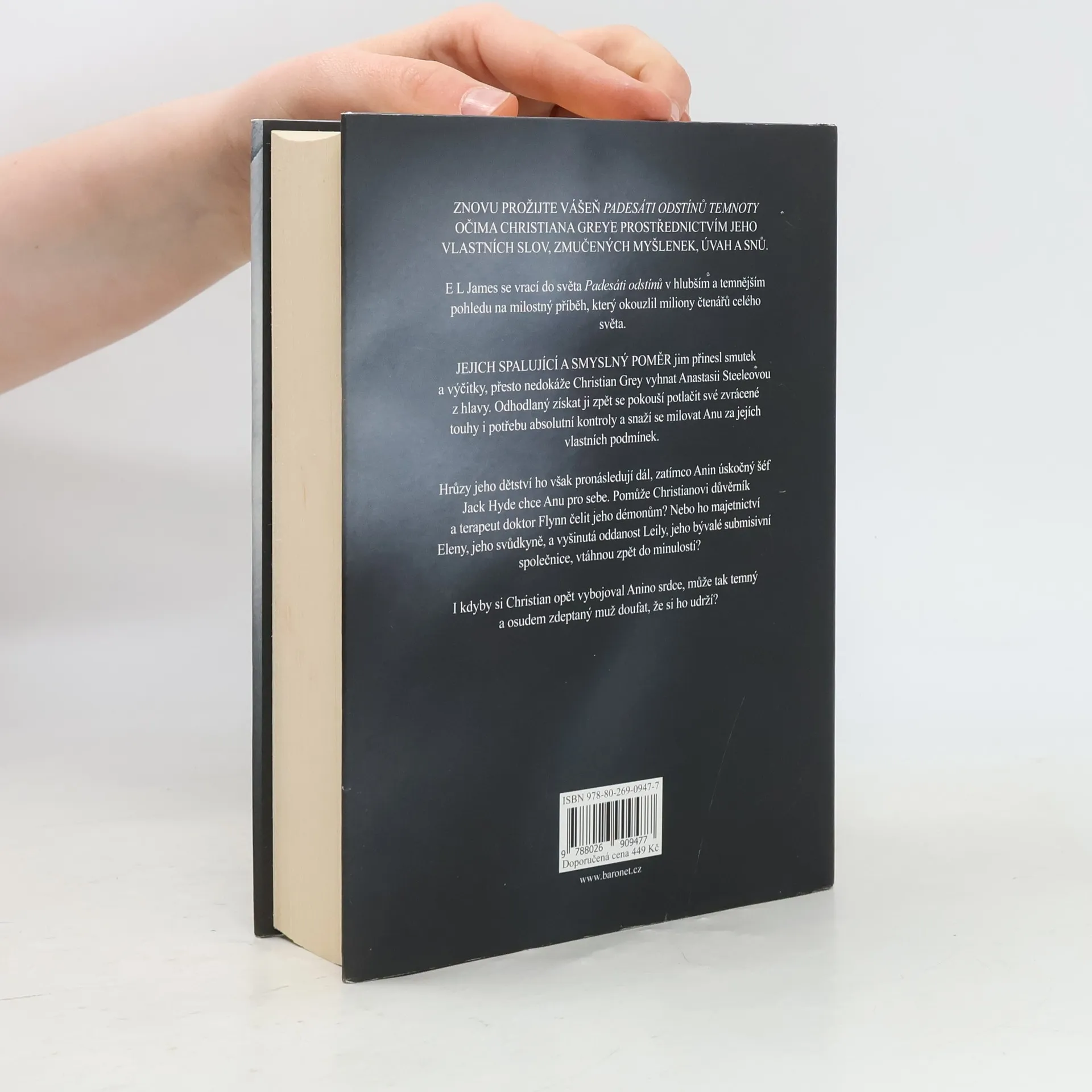 Padesát odstínů temnoty pohledem Christiana Greye. Prožijte znovu vášeň Padesáti odstínů temnoty očima Christiana Greye prostřednictvím jeho vlastních slov, zmučených myšlenek, úvah a snů. E L James se vrací do světa Padesáti odstínů v hlubším a temnějším pohledu na milostný příběh, který okouzlil miliony čtenářů celého světa. Jejich spalující a smyslný poměr vyústil v hluboký žal a výčitky, přesto nedokáže Christian Grey vyhnat Anastasii Steeleovou z hlavy, natož z krve. Odhodlaný získat ji zpět, pokouší se potlačit své zvrácené touhy i potřebu absolutní kontroly a snaží se milovat Anu za jejích vlastních podmínek. Hrůzy jeho dětství ho však pronásledují dál, zatímco Anin úskočný šéf, Jack Hyde, chce zjevně Anu pro sebe. Pomůže Christianovi důvěrník a terapeut, doktor Flynn, čelit jeho démonům? Nebo ho majetnictví Eleny, jeho svůdkyně, a vyšinutá oddanost Leily, jeho bývalé submisivní společnice, vtáhnou zpět do minulosti? I kdyby si Christian opět vybojoval Anino srdce, může tak temný a osudem zdeptaný muž doufat, že si jej udrží?
