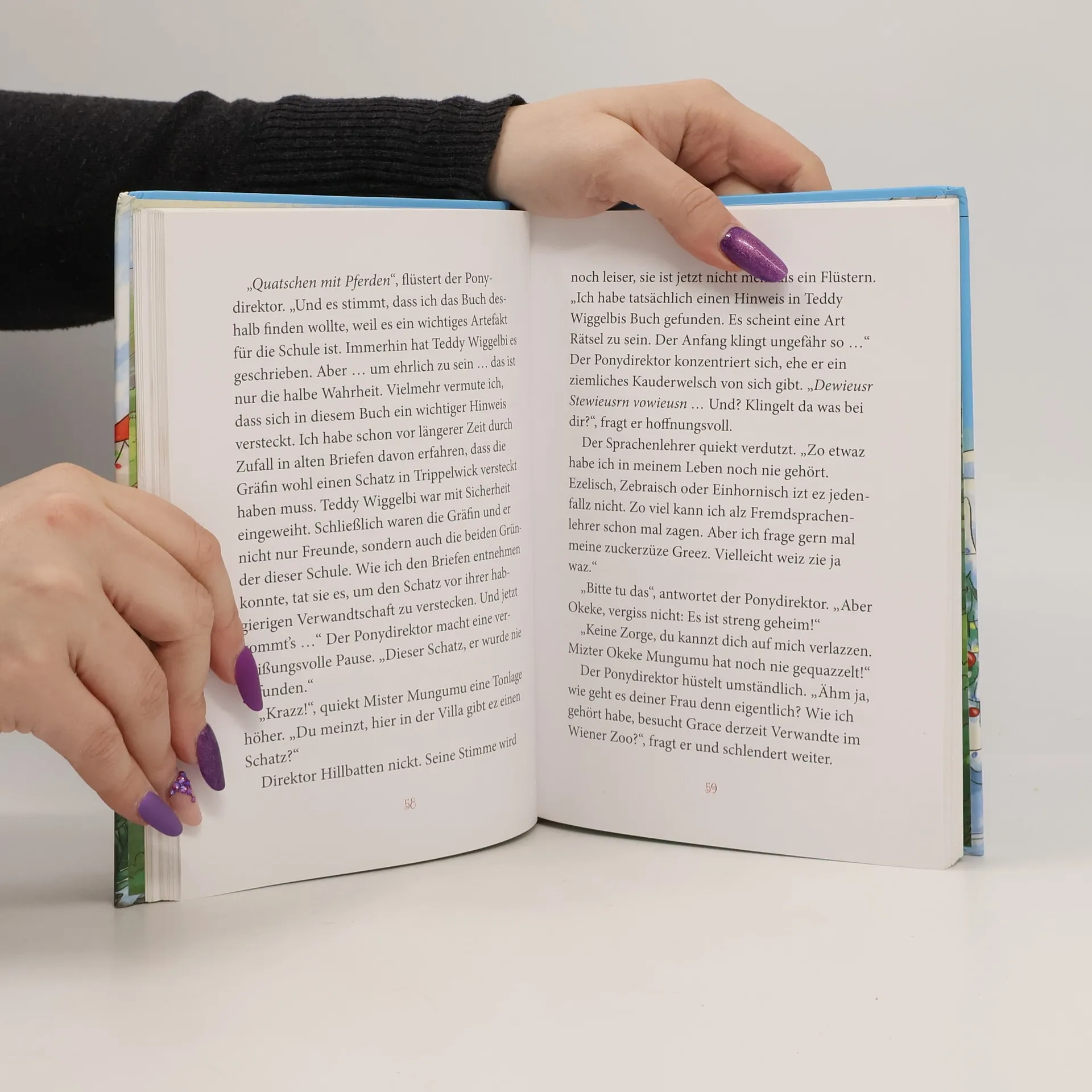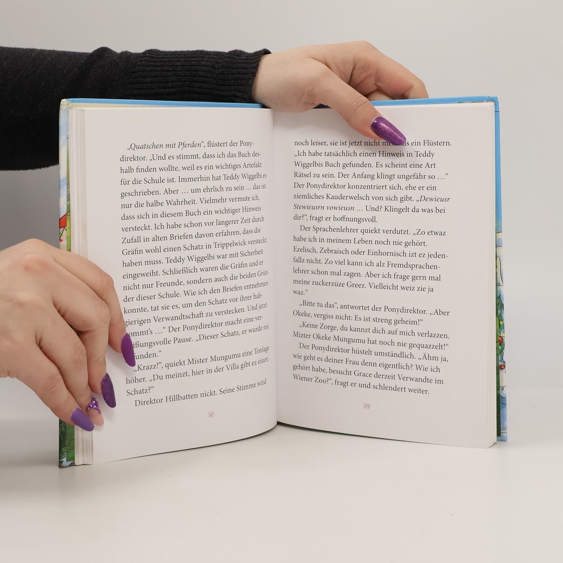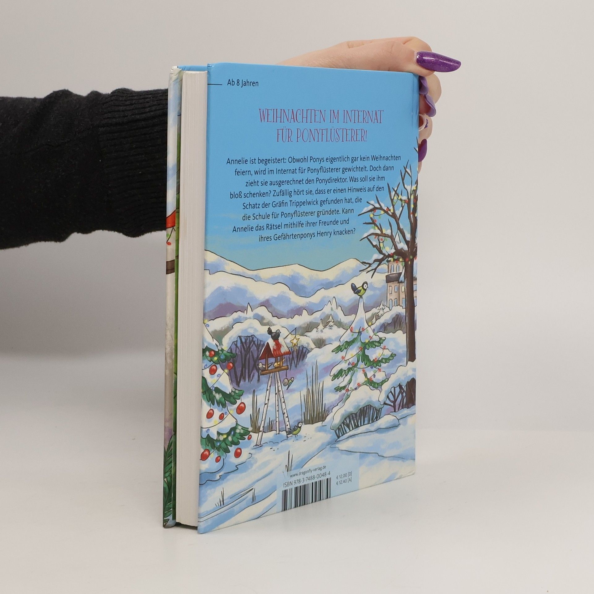Pony-Rodeln, Apfelpunsch und eine winterliche Mitternachtsparty: So schön ist die Weihnachtszeit nur in Trippelwick! Annelie ist begeistert: Obwohl Ponys eigentlich gar kein Weihnachten feiern, wird im Internat für Ponyflüsterer gewichtelt. Doch dann zieht Annelie ausgerechnet den Ponydirektor. Was soll sie ihm bloß schenken? Zufällig hört sie, dass er einen Hinweis auf den Schatz der Gräfin Trippelwick gefunden hat, die die Schule für Ponyflüsterer gründete. Kann Annelie das Rätsel mit Hilfe ihrer Freunde und ihres Gefährtenponys Henry knacken? Üppig ausgestattet mit den zauberhaften farbigen Illustrationen von Larisa Lauber