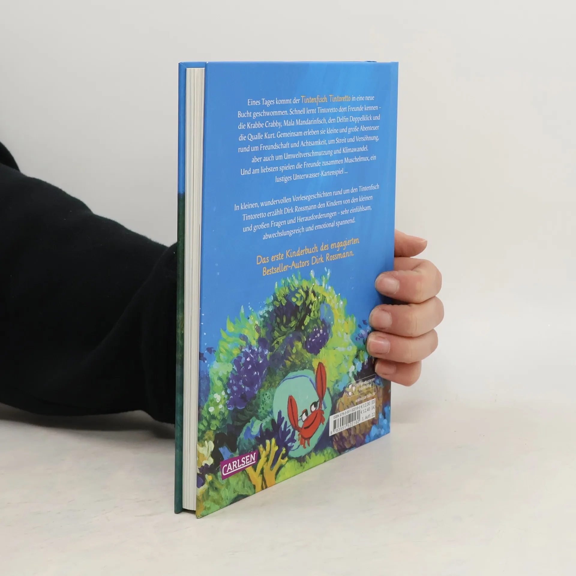 Der Tintenfisch Tintoretto kommt neu in die Bucht und lernt dort Crabby Krabbe, Mala Mandarinfisch, den Delfin Doppelklick und die Qualle Kurt kennen. Gemeinsam macht das Leben im Ozean noch mehr Spaß. Die Freunde erleben Abenteuer, helfen sich aber auch gegenseitig aus der Patsche und kämpfen gegen die Umweltverschmutzung. In Vorlesegeschichten rund um einen Tintenfisch erzählt Dirk Rossmann den Kindern von den kleinen und großen Fragen und Herausforderungen, einfühlsam, abwechslungsreich und emotional spannend. Das erste Kinderbuch des engagierten Bestseller-Autors!