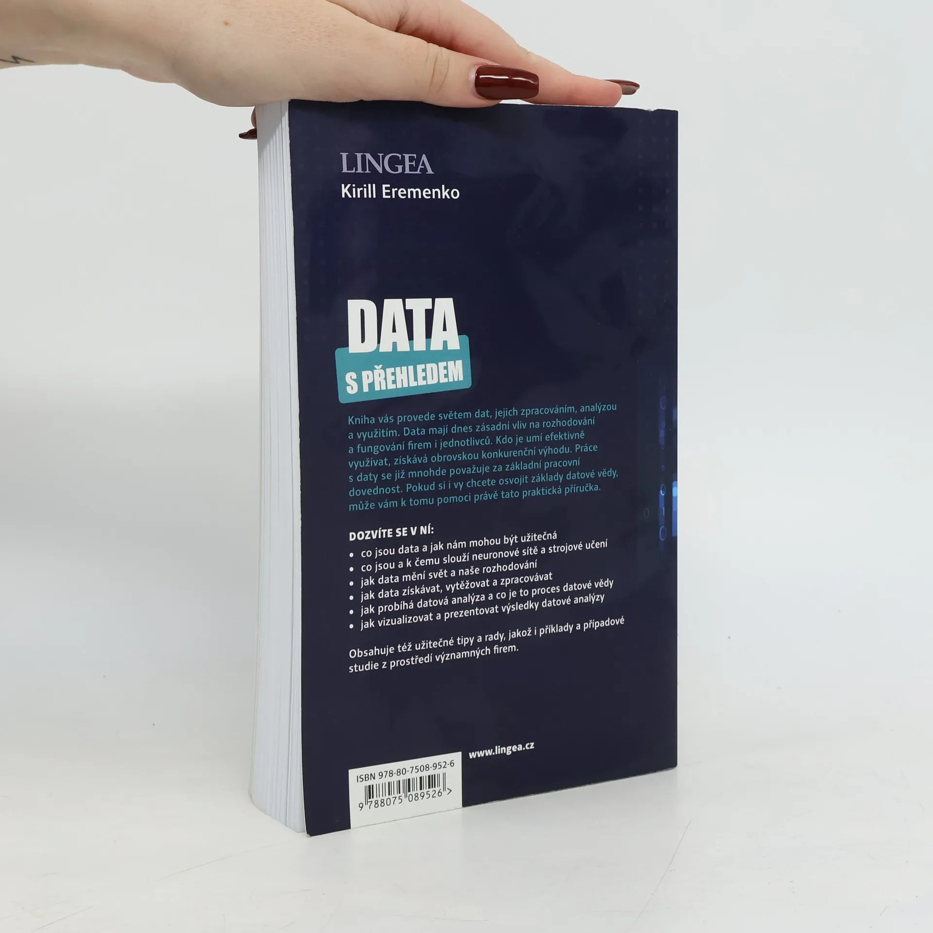 Kniha vás provede světem dat, jejich zpracováním, analýzou a využitím. Obsahuje případové studie. V této knize se dozvíte: - co jsou data a jak nám mohou být užitečná - co jsou a k čemu slouží neuronové sítě a strojové učení - jak data mění svět a naše rozhodování - jak data získávat, vytěžovat a zpracovávat - jak probíhá datová analýza a co je to proces datové vědy - jak vizualizovat a prezentovat výsledky datové analýzy
