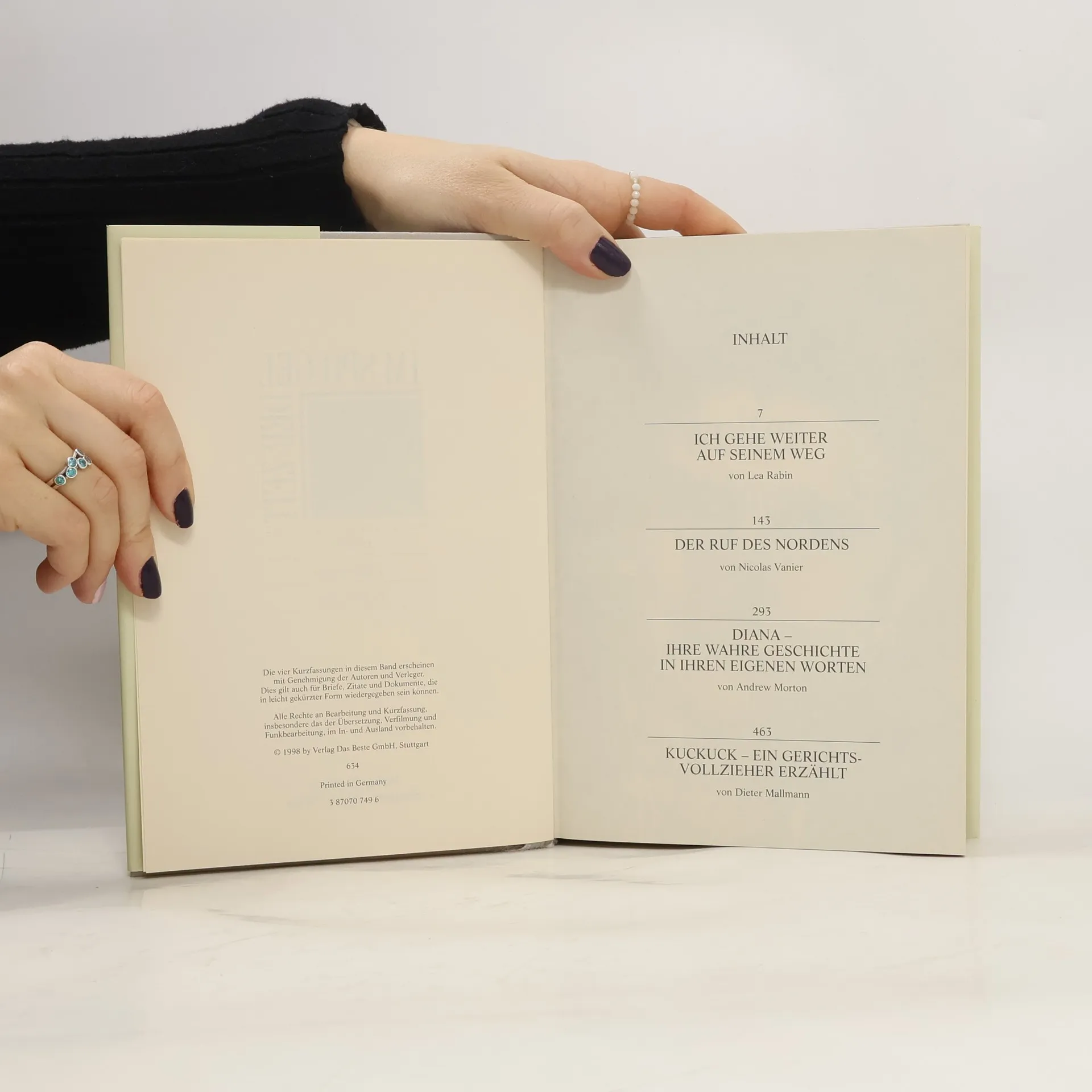 Ich gehe weiter auf seinem Weg/Der Ruf des Nordens/Diana/Kuckuck - ein Gerichtsvollzieher erzählt - Aus der Im Spiegel der Zeit - bk1140; Verlag "Das Beste"; Lea Rabin/Nicolas Vanier/Andrew Morton/Dieter Mallmann; Paperback; 1998