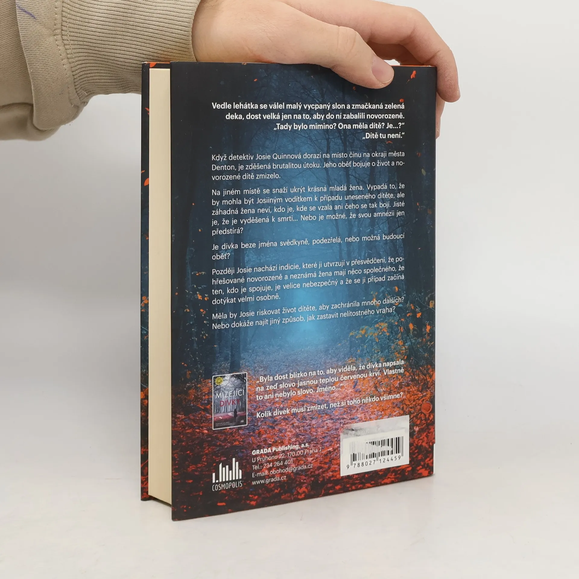 Vedle lehátka se válel malý vycpaný slon a zmačkaná zelená deka, dost velká jen na to, aby do ní zabalili novorozeně. „Tady bylo mimino? Ona měla dítě? Je…?“ „Dítě tu není.“ Když detektiv Josie Quinnová dorazí na místo činu na okraji města Denton, je zděšená brutalitou útoku. Jeho oběť bojuje o život a novorozené dítě zmizelo. Na jiném místě se snaží ukrýt krásná mladá žena. Vypadá to, že by mohla být Josiiným vodítkem k případu uneseného dítěte, ale záhadná žena neví, kdo je, kde se vzala ani čeho se tak bojí. Jisté je, že je vyděšená k smrti… Nebo je možné, že svou amnézii jen předstírá? Je dívka beze jména svědkyně, podezřelá, nebo možná budoucí oběť? Později Josie nachází indicie, které ji utvrzují v přesvědčení, že pohřešované novorozeně a neznámá žena mají něco společného, že ten, kdo je spojuje, je velice nebezpečný a že se jí případ začíná dotýkat velmi osobně. Měla by Josie riskovat život dítěte, aby zachránila mnoho dalších? Nebo dokáže najít jiný způsob, jak zastavit nelítostného vraha?