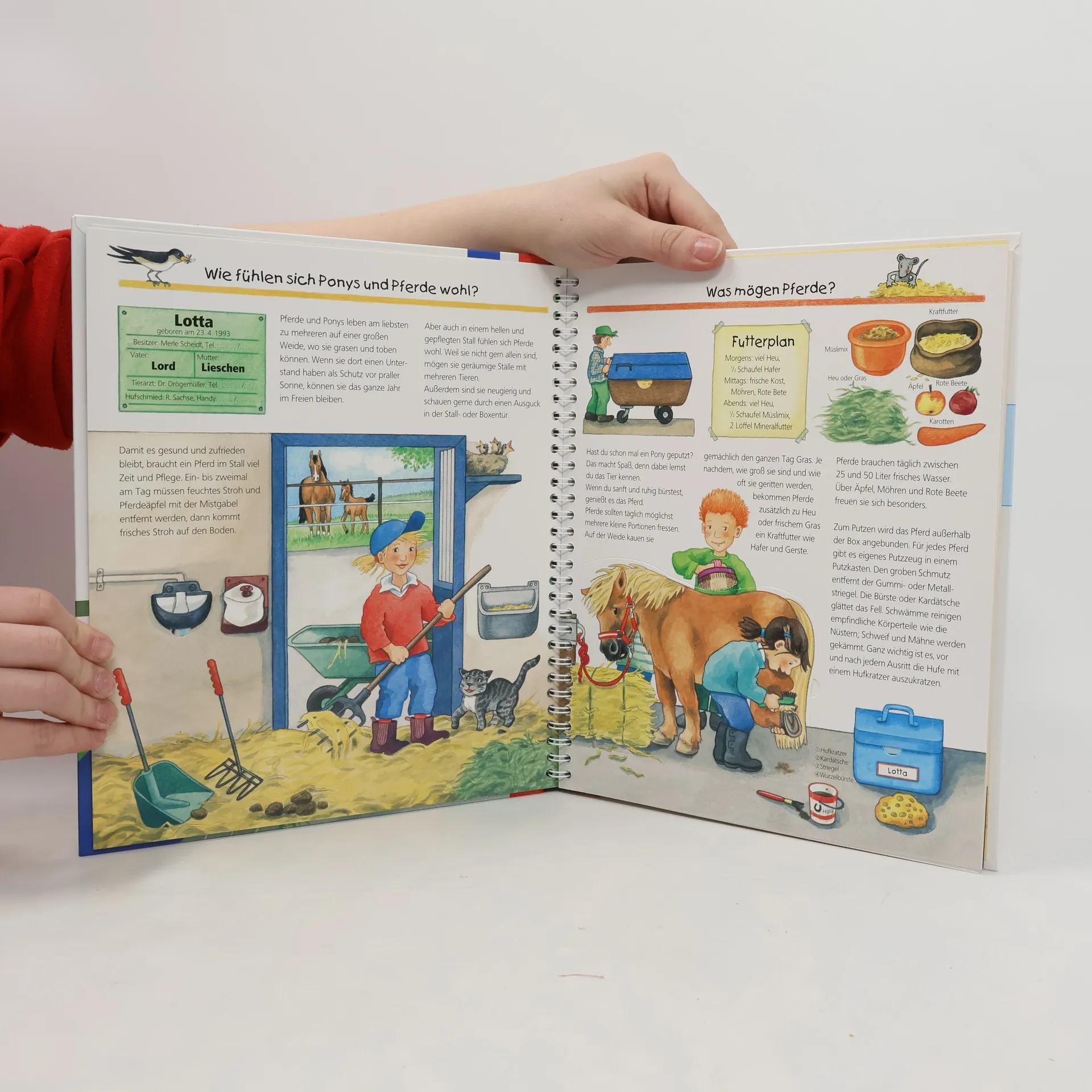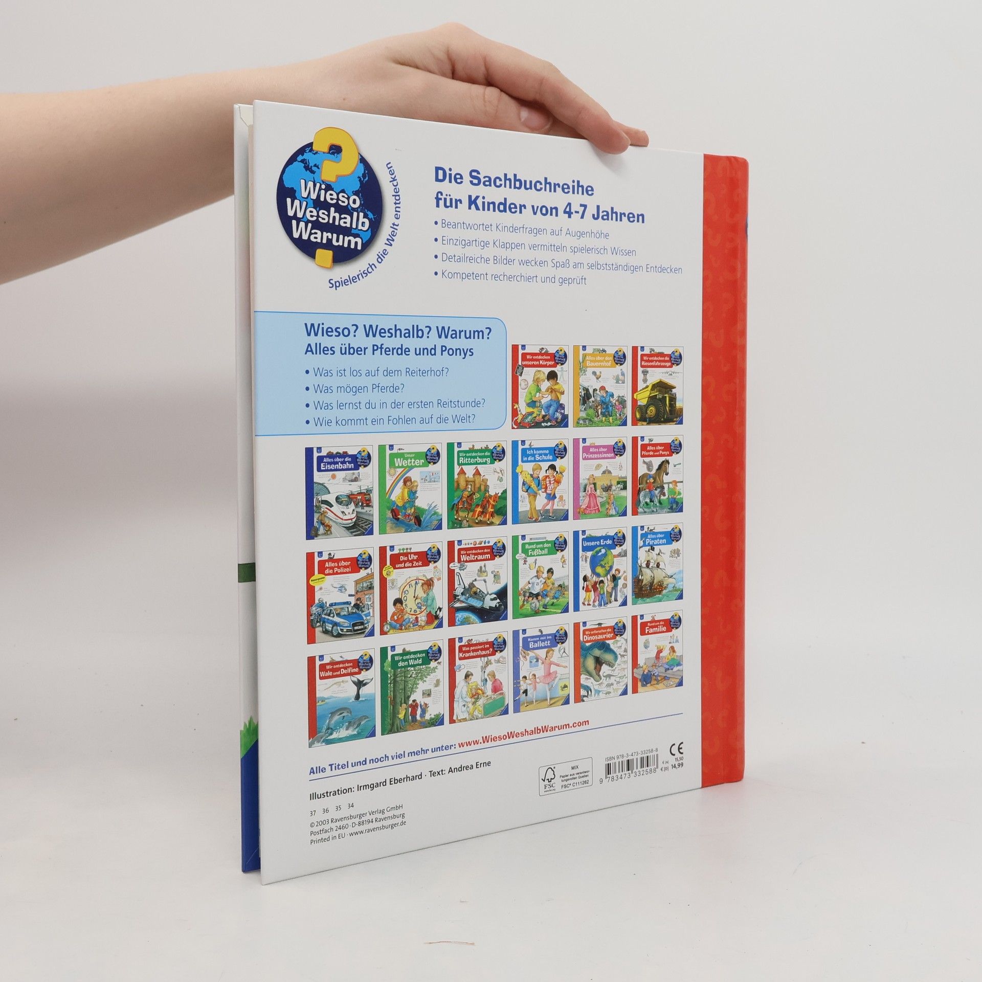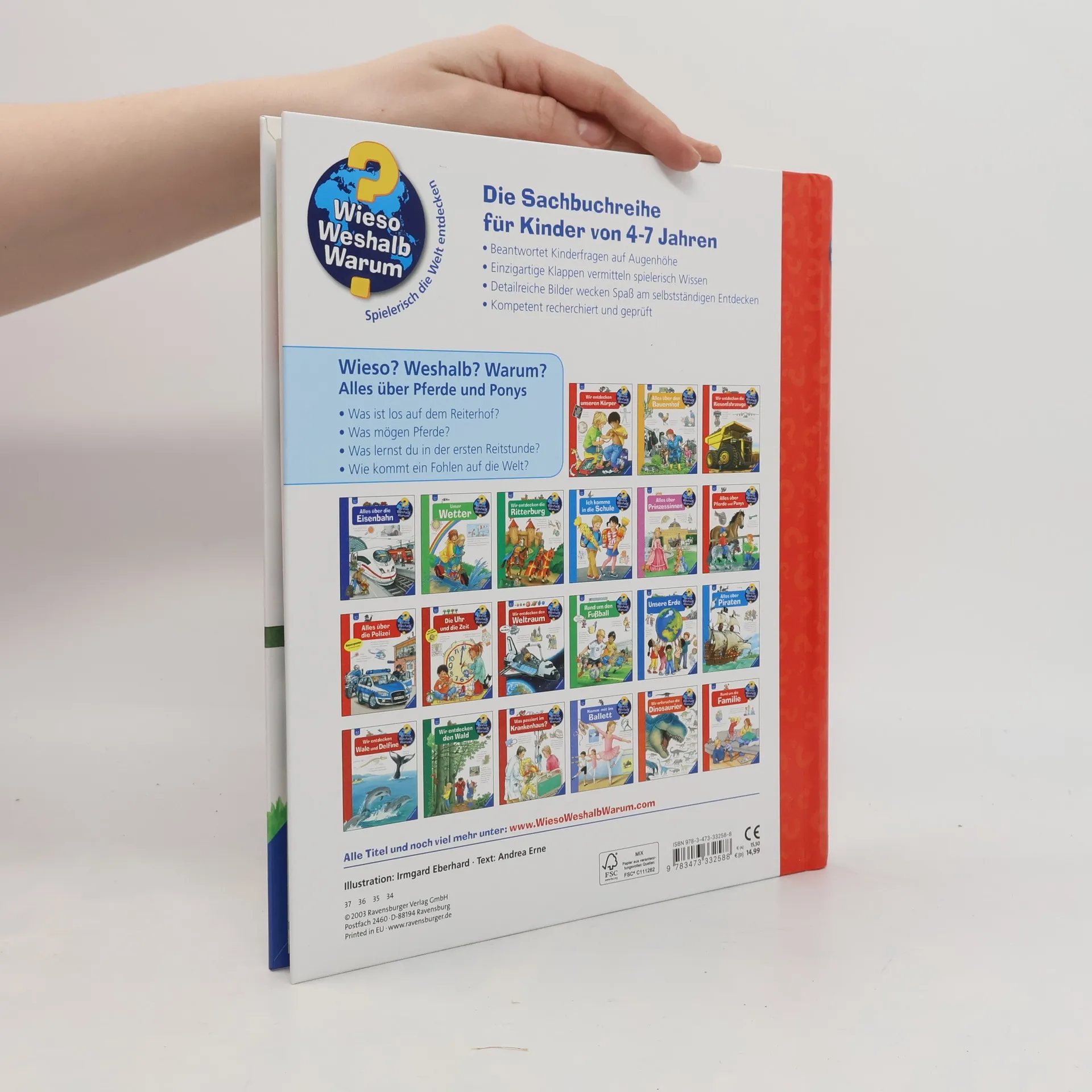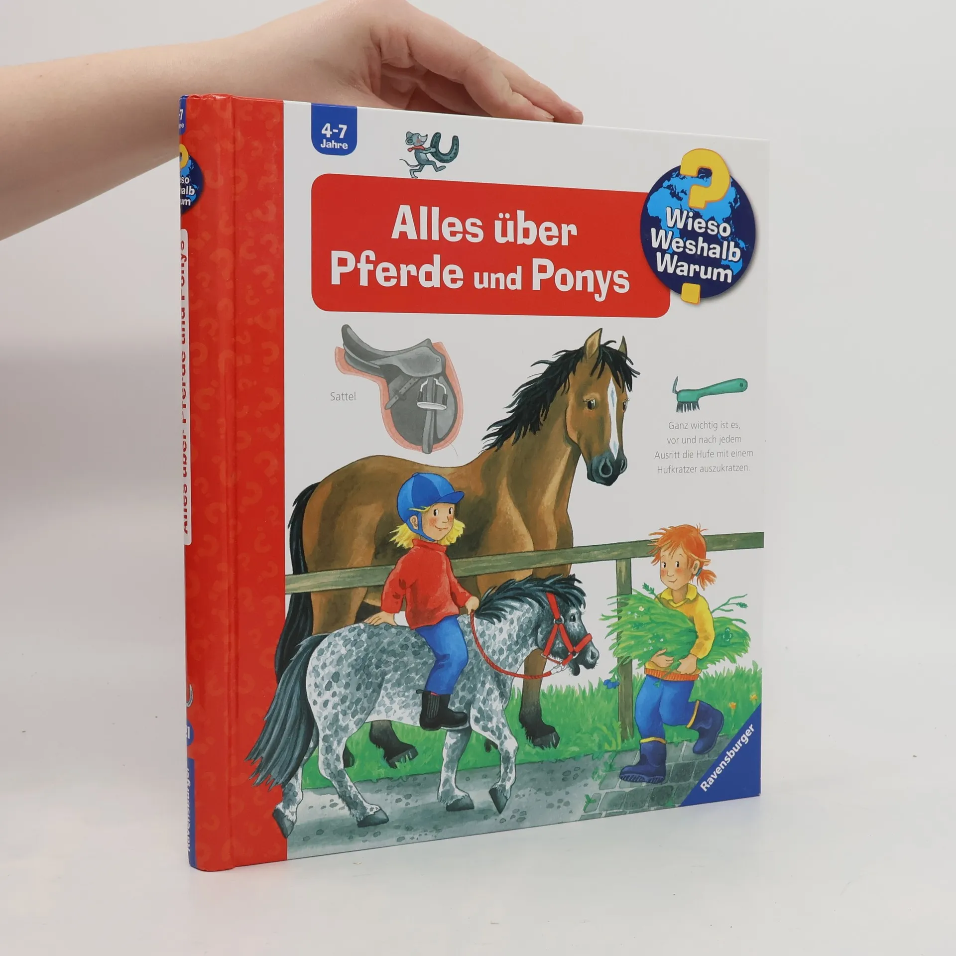 Das Glück der Erde liegt auf dem Rücken der Pferde! In diesem Buch werden zahlreiche Kinderfragen rund um die beliebten Tiere anhand von kindlichen Illustrationen und einfachen Texten beantwortet: Was fressen Pferde gern? Wie groß werden Ponys? Und wie sieht es auf dem Reiterhof aus? Kinder erfahren, wann sich Pferde wohlfühlen, welche Ausrüstung man zum Reiten braucht und wie ein Fohlen geboren wird. Hier bleiben garantiert keine Fragen offen. Wieso? Weshalb? Warum? Die Sachbuchreihe für Kinder von 4–7 Jahren Jeden Tag entdecken Kinder etwas Neues – da kommen viele Fragen auf. Warum sind die Dinosaurier ausgestorben? Wo ist die Sonne in der Nacht? Wozu brauchen wir das Blut? Die beliebte Sachbuchreihe Wieso? Weshalb? Warum? gibt Kindern Antworten auf Augenhöhe. Dabei werden die unterschiedlichsten Themen aus der Alltags- und Interessenswelt der Kinder altersgerecht und mit viel Liebe zum Detail unter die Lupe genommen. Detailreiche Bilder, verständliche Sachtexte und überraschende Klappen, die Bewegungen oder Abläufe veranschaulichen und hinter die Dinge blicken lassen, ermöglichen Kindern, sich ihre Themen selbst zu erschließen. Der Spaß am eigenhändigen Entdecken, die liebevolle Umsetzung und die qualitativ hochwertige Ausstattung garantieren langanhaltende Freude an jedem einzelnen Buch.