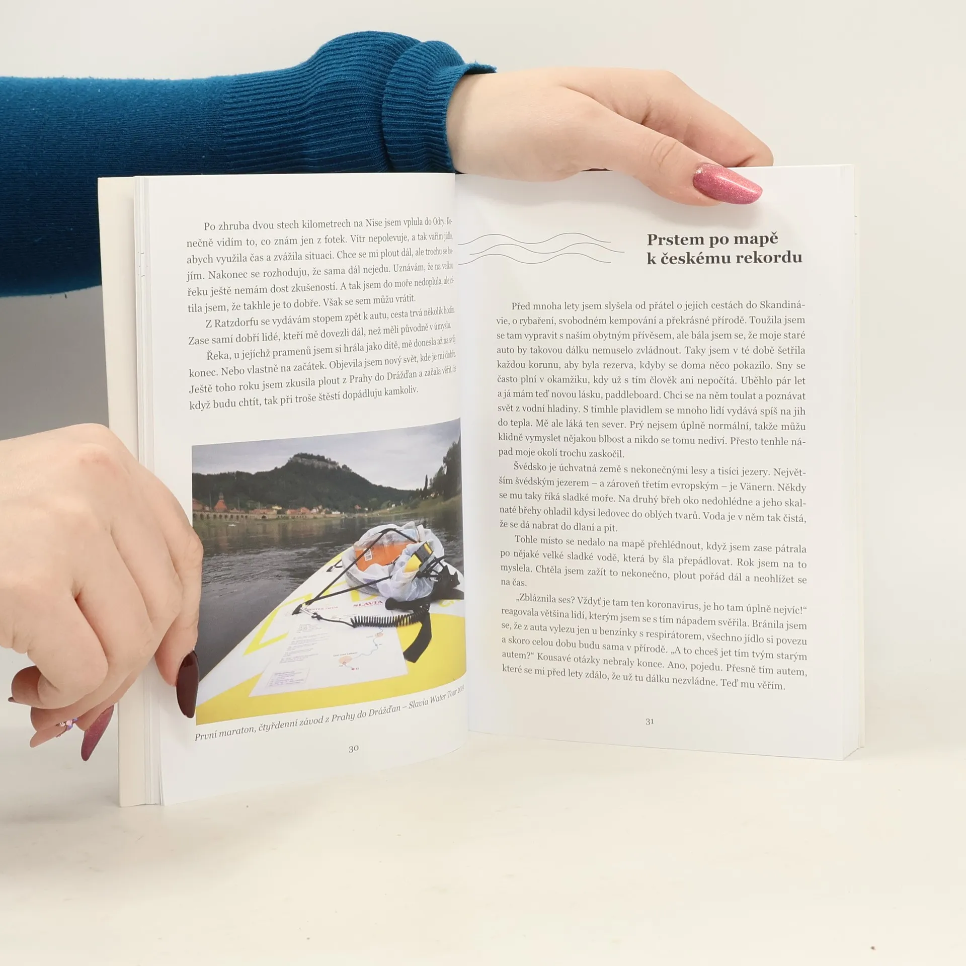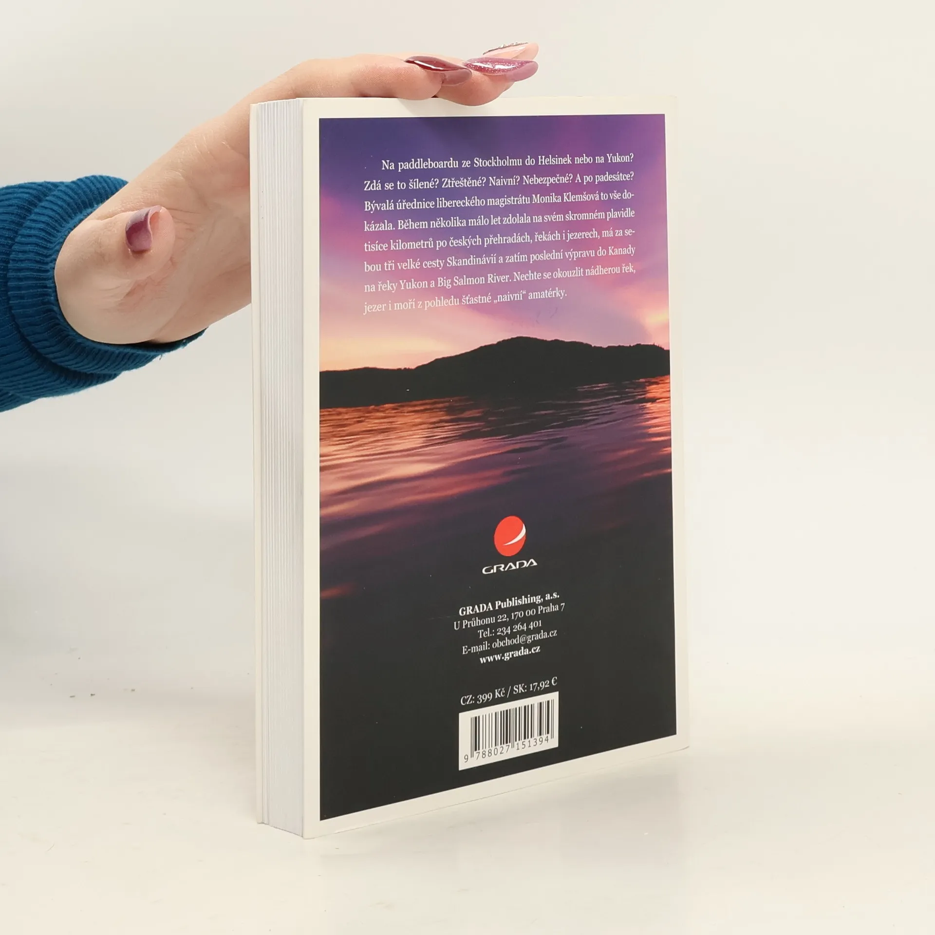 Na paddleboardu ze Stockholmu do Helsinek nebo na Yukon? Zdá se to šílené? Ztřeštěné? Naivní? Nebezpečné? A po padesátce? Bývalá úřednice libereckého magistrátu Monika Klemšová to vše dokázala. Během několika málo let zdolala na svém skromném plavidle tisíce kilometrů po českých přehradách, řekách i jezerech, má za sebou tři velké cesty Skandinávií, a zatím poslední výpravu do Kanady na řeky Yukon a Big Salmon River. Nechte se okouzlit nádherou řek, jezer i moří z pohledu šťastné "naivní" amatérky. Miluju vodu, často u ní jen tak sedím a tiše pozoruju všechno kolem. Je mi u ní dobře možná i proto, že jsem vyrostla u nádherné přehrady v Jizerských horách. Všude, kde najdu jezera, lesy a skály, se cítím tak trochu doma. Pořád znova se divím, kolik je v té vodě síly a energie. Jak umí pohladit tělo i duši, ale i ničit a brát, co se jí zlíbí. Pro někoho je drogou, pro jiného noční můrou, umí být vším, co si jen člověk dokáže představit. Taky se mi líbí pozorovat vodáky, kteří na lodích tančí ve vířících proudech a zpěněných vlnách. Tu jsou nahoře, tu dole, nápadně to připomíná divadlo o životě. Myslím, že voda se podobá i ženám a mužům. Vím, že pro mě se víc hodí klidná voda jezerní. Možná i moře nebo široké řeky. Občas mě potrápí, nakonec ale vždycky přijde to kouzelné zrcadlení zapadajícího slunce na hladině. Jsem za tyhle chvíle nesmírně vděčná. Monika Klemšová