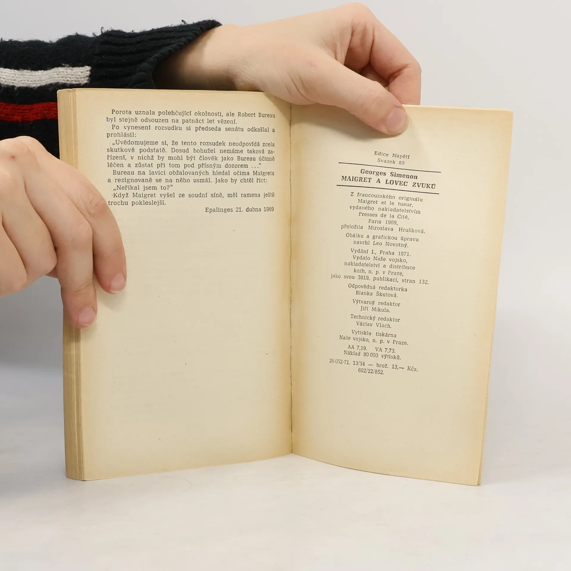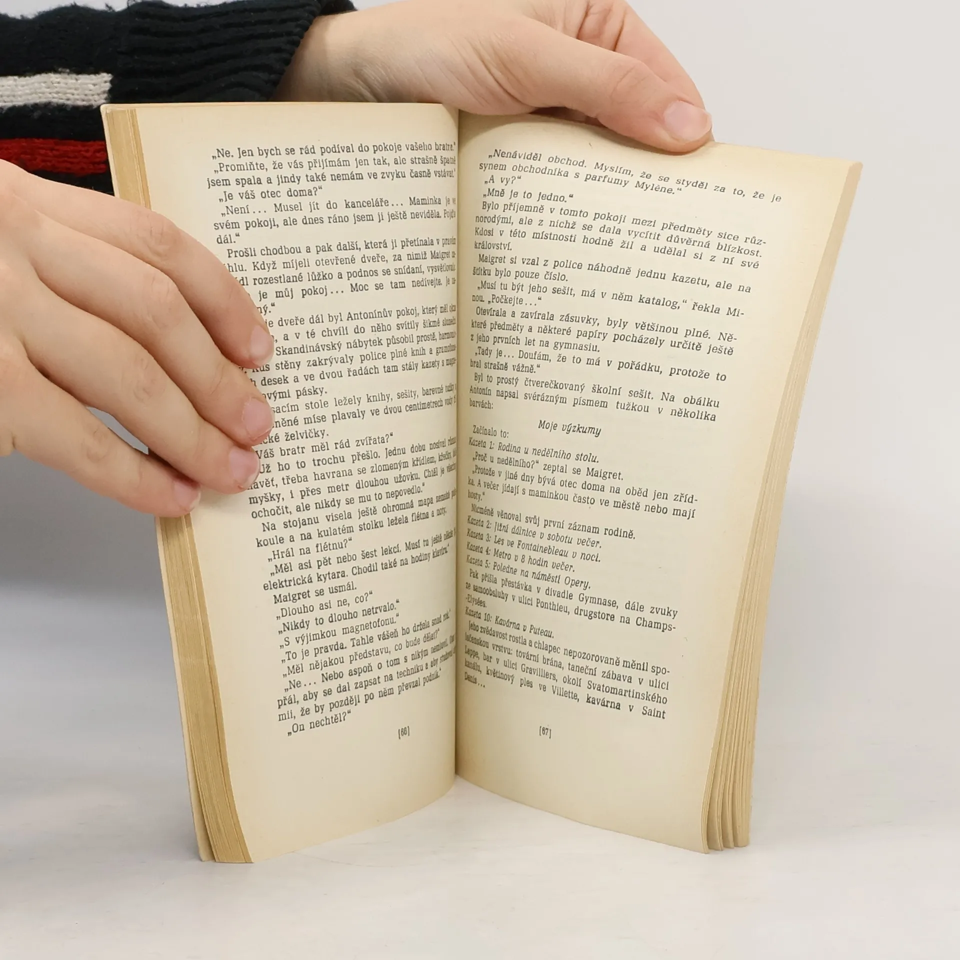 V detektivním, psychologicky laděném románě, dokončeném v r. 1969, umožňuje kazetový magnetofon ubodaného studenta, vášnivého lovce zvuku, analyzovat zvyky a záliby oběti a seznámit s prostředím vraždy na pařížském předměstí. Mistrný, psychologicky promyšlený postup komisaře Maigretapřivádí na stopu vraha a posléze ho donutí, aby se v raskolnikovsky laděné zpovědi doznal k dvěma vraždám.