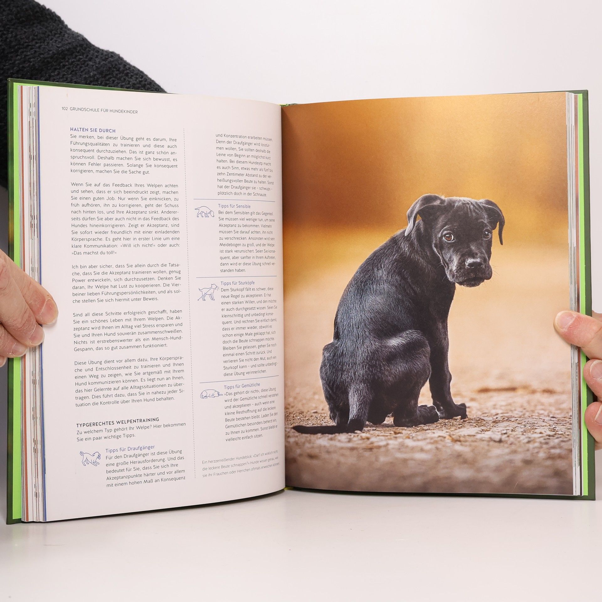 Welpe ist nicht gleich Welpe – deshalb sind auch nicht alle Übungen bei jedem Welpen gleichermaßen erfolgreich. Denn Welpen haben ihren eigenen Charakter und können deshalb unterschiedlich auf dieselben Trainingseinheiten reagieren. Während der eine das Leckerli aus der Hand klaut, weicht der andere ängstlich zurück. Deshalb ist es wichtig, im ersten Schritt den jeweiligen Typ des Welpen zu bestimmen, um dann die Ausführung der Übungen ideal und typgerecht anpassen zu können. Wie kaum ein anderer versteht es André Vogt, individuell auf die unterschiedlichen WelpenCharaktere einzugehen und den Hundebesitzern das richtige Vorgehen beim Training zu vermitteln. Seine Methode ist einfach, macht Spaß und zeigt sofortigen Effekt.