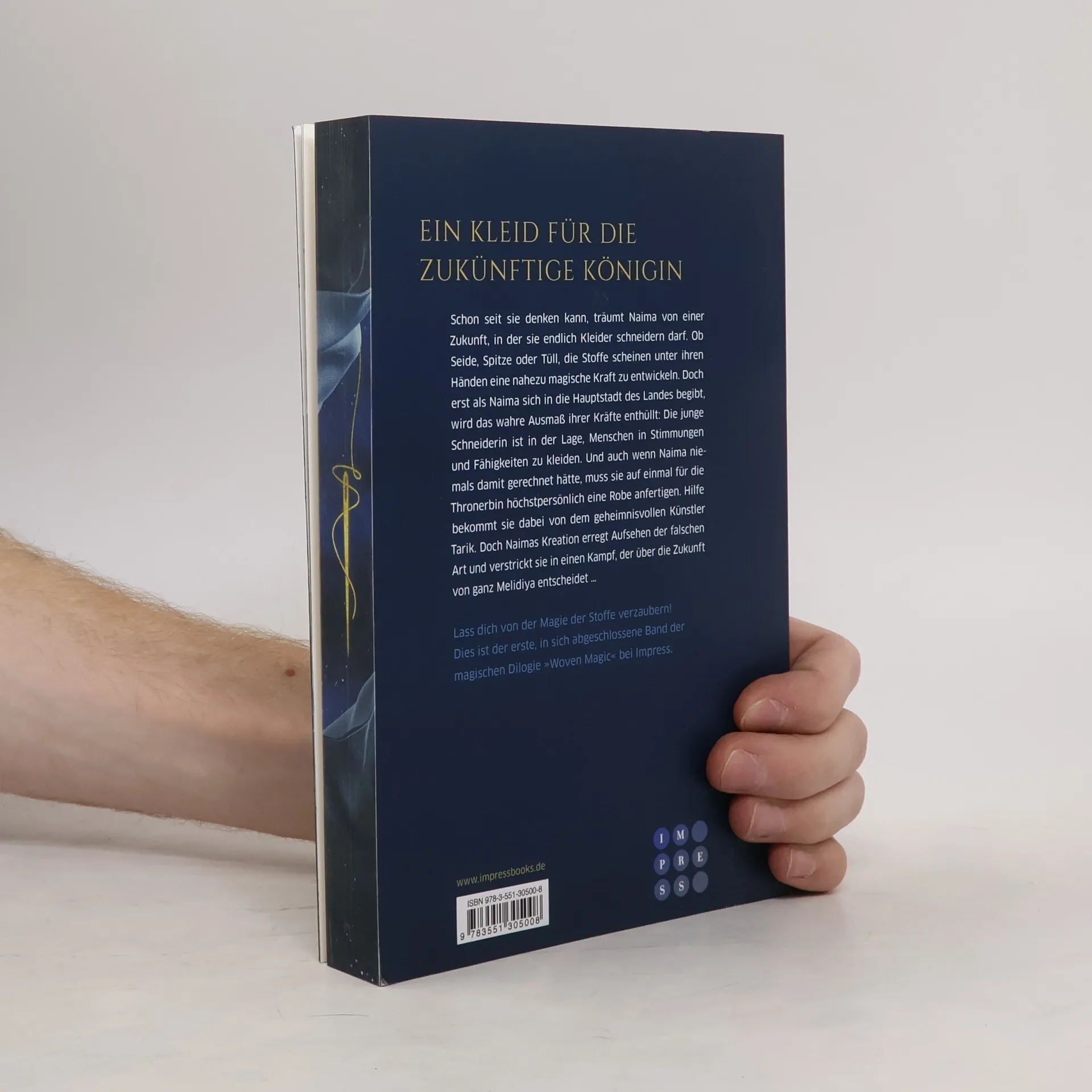 **Ein Kleid für die zukünftige Königin** Schon seit sie denken kann, träumt Naima von einer Zukunft, in der sie endlich Kleider schneidern darf. Ob Seide, Spitze oder Tüll, die Stoffe scheinen unter ihren Händen eine nahezu magische Kraft zu entwickeln. Doch erst als Naima sich in die Hauptstadt des Landes begibt, wird das wahre Ausmaß ihrer Kräfte enthüllt: Die junge Schneiderin ist in der Lage, Menschen in Stimmungen und Fähigkeiten zu kleiden. Und auch wenn Naima niemals damit gerechnet hätte, muss sie auf einmal für die Thronerbin höchstpersönlich eine Robe anfertigen. Hilfe bekommt sie dabei von dem geheimnisvollen Künstler Tarik. Doch Naimas Kreation erregt Aufsehen der falschen Art und verstrickt sie in einen Kampf, der über die Zukunft von ganz Melidiya entscheidet … Lass dich von der Magie der Stoffe bezaubern und begib dich in eine orientalische Welt, in der nichts ist, wie es scheint und eine uralte Prophezeiung über Krieg oder Frieden bestimmt! //Dies ist der erste, in sich abgeschlossene Band der magischen Dilogie »Woven Magic«. Alle Bände der Fantasy-Liebesgeschichte bei Impress: -- Die Magie der Mitternachtsrobe (Woven Magic 1) -- Der Fluch der Schicksalsrobe (Woven Magic 2) Jeder Roman der Serie ist in sich abgeschlossen und kann eigenständig gelesen werden.//