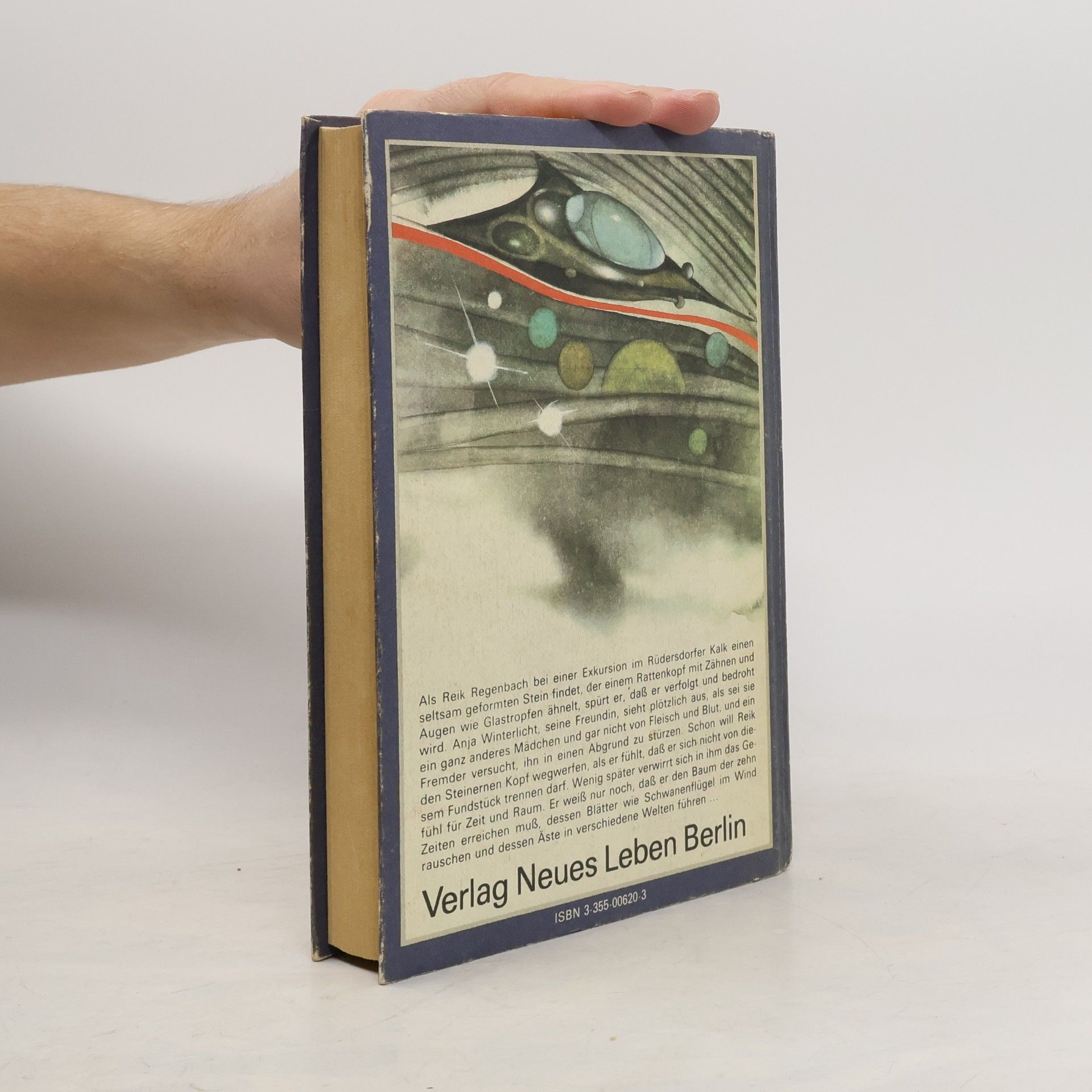 Als Reik Regenbach bei einer Exkursion im Rüdersdorfer Kalk einen seltsam geformten Stein findet, der einem Rattenkopf mit Zähnen und Augen wie Glastropfen ähnelt, spürt er, daß er verfolgt und bedroht wird. Anja Winterlicht, seine Freundin, sieht plötzlich aus, als sei sie ein ganz anderes Mädchen und gar nicht von Fleisch und Blut, und ein Fremder versucht, ihn in einen Abgrund zu stürzen. Schon will Reik den Steinernen Kopf wegwerfen, als er fühlt, daß er sich nicht von diesem Fundstück trennen darf. Wenig später verwirrt sich in ihm das Gefühl für Zeit und Raum. Er weiß nur noch, daß er den Baum der zehn Zeiten erreichen muß, dessen Blätter wie Schwanenflügel im Wind rauschen und dessen Äste in verschiedene Welten führen ... (Klappentext)