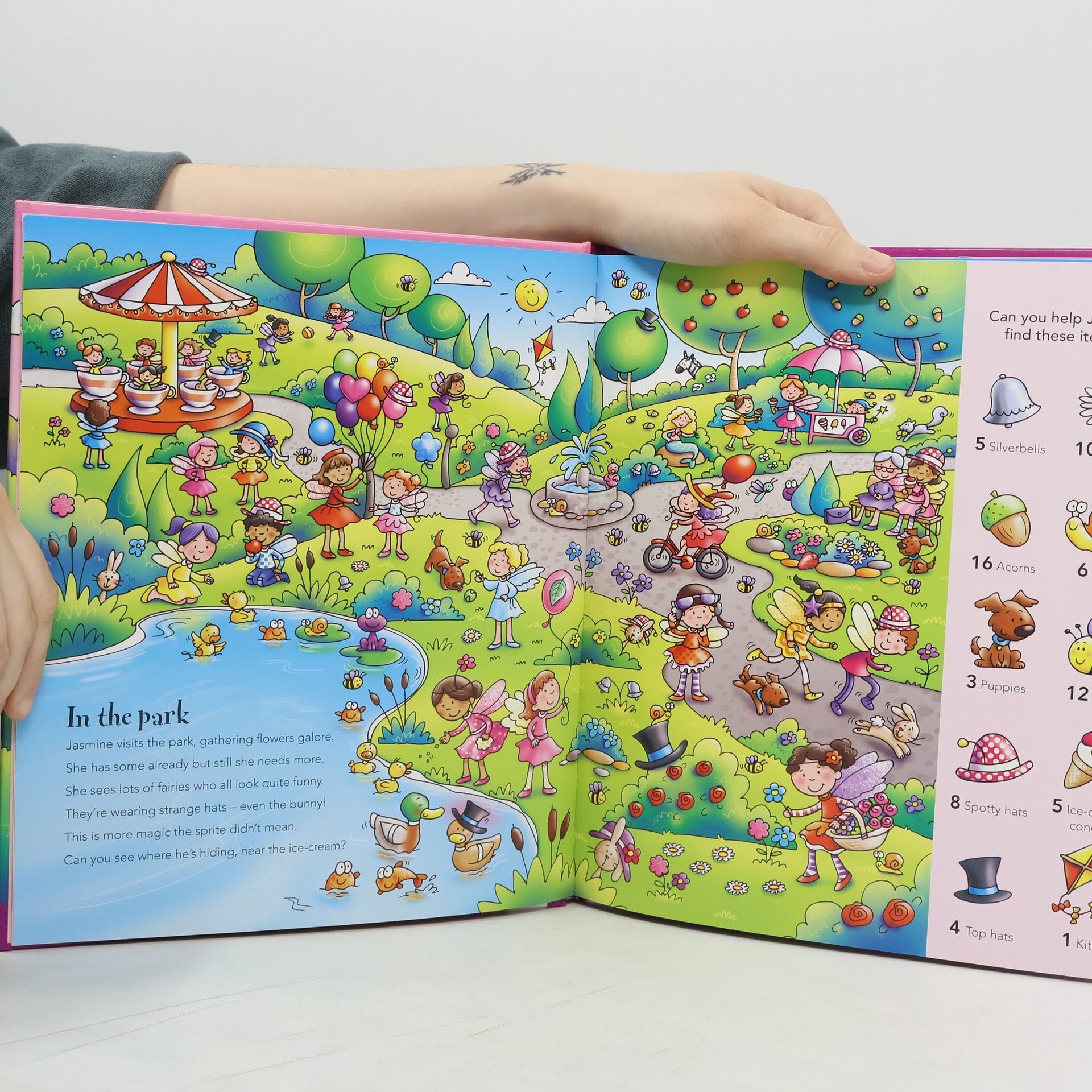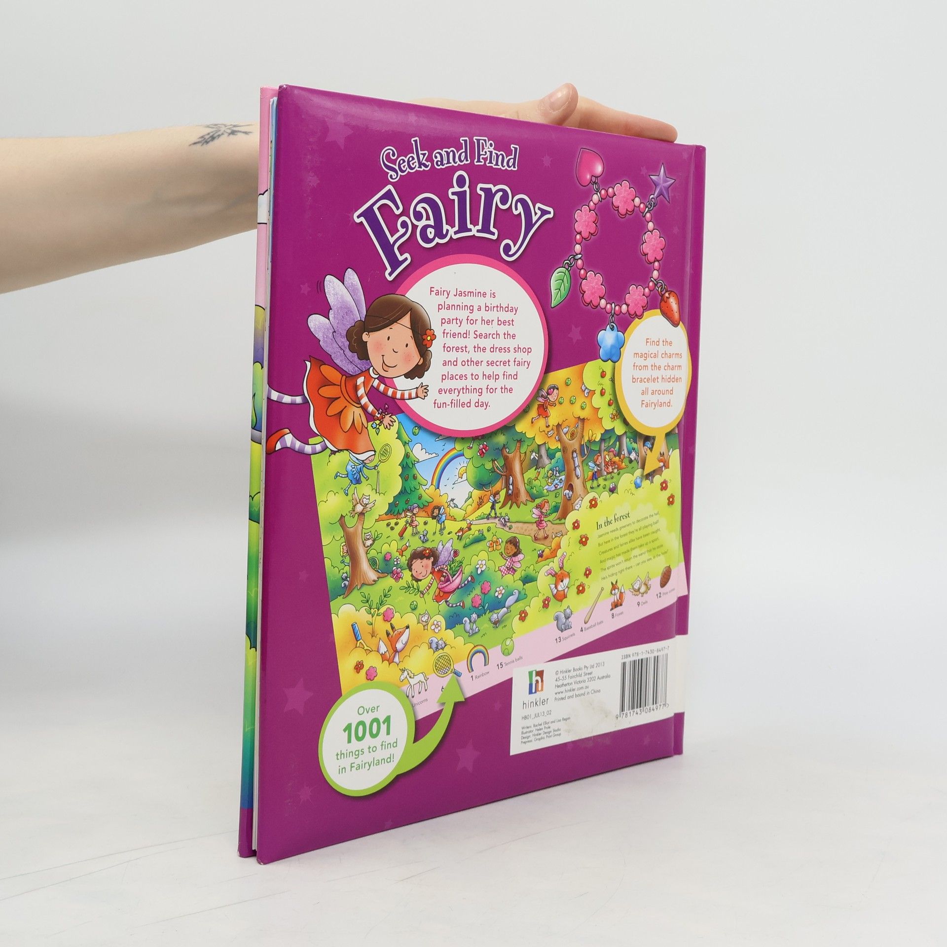 Fairy Jasmine is planning a birthday party for her best friend! Search the forest, the dress shop and other secret fairy places to help find everything for the little fun-filled day. Find the charms from the included bracelet throughout the book.