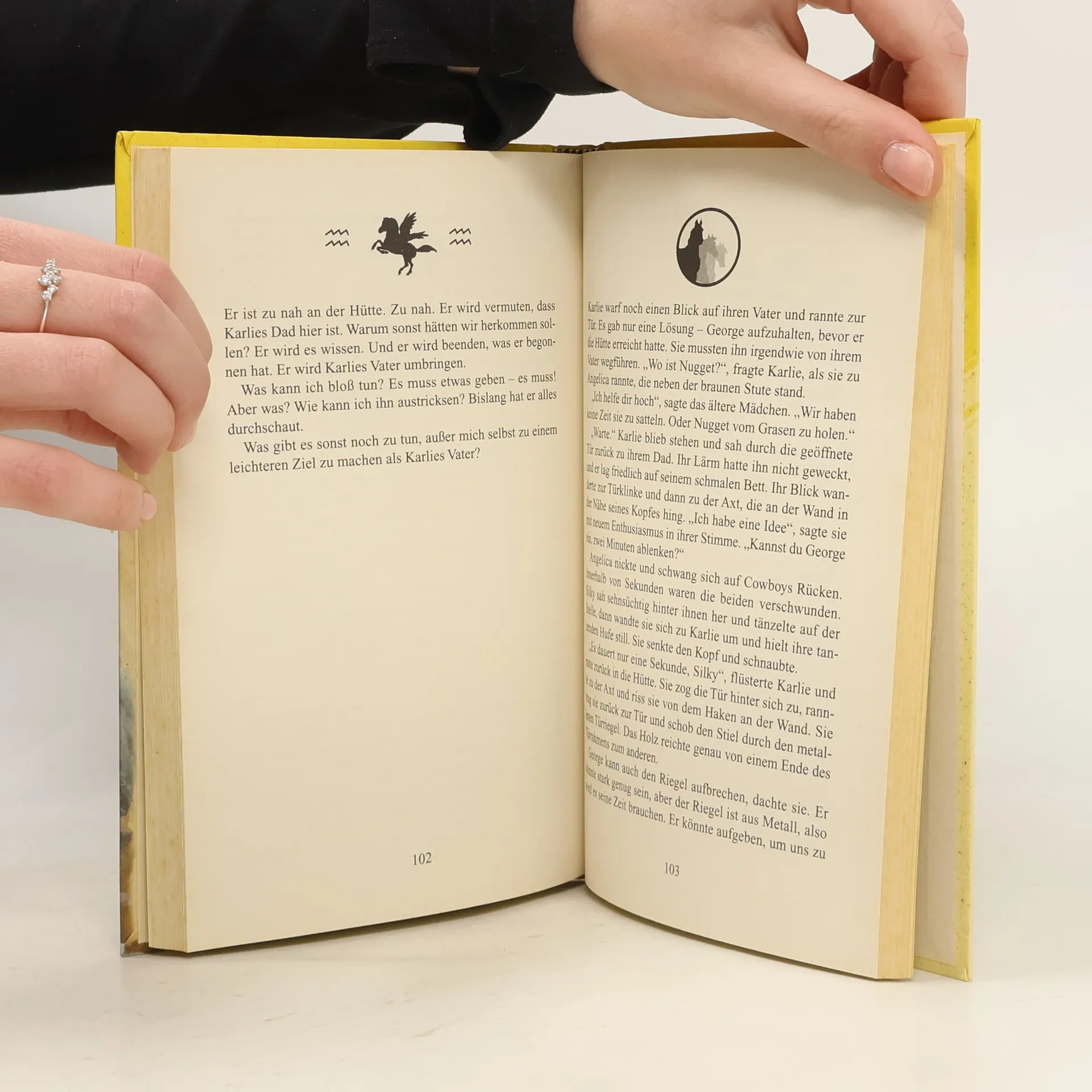 „Wir reiten in die falsche Richtung, Angelica“, sagte Karlie. Mit ihrer Energie kehrte auch ihre Verzweiflung zurück. „Wir müssen Dad finden. Er ist es, den George verfolgt. Und er ist verwundet. Wir müssen ihm helfen zu fliehen!“ Karlies Vater liegt verletzt in der Wildnis. Doch George, ein habgieriger Goldsucher, will unbedingt verhindern, dass Karlie ihm zu Hilfe kommt. Wenn nötig mit Waffengewalt! Karlies einzige Verbindung zur Außenwelt ist ein Funkgerät, doch gerade, als sie damit Hilfe hohlen will, kommt George ihr zuvor und zerstört das Gerät. Hat Karlie jetzt überhaupt noch eine Chance?