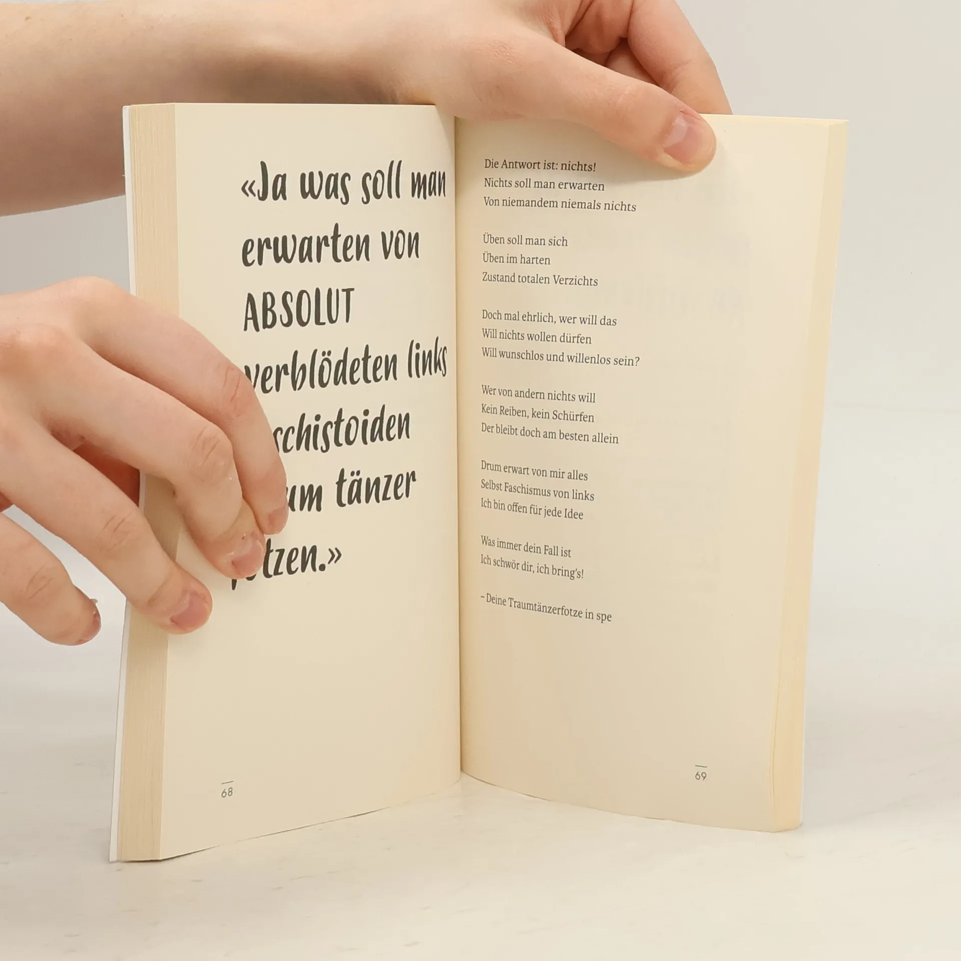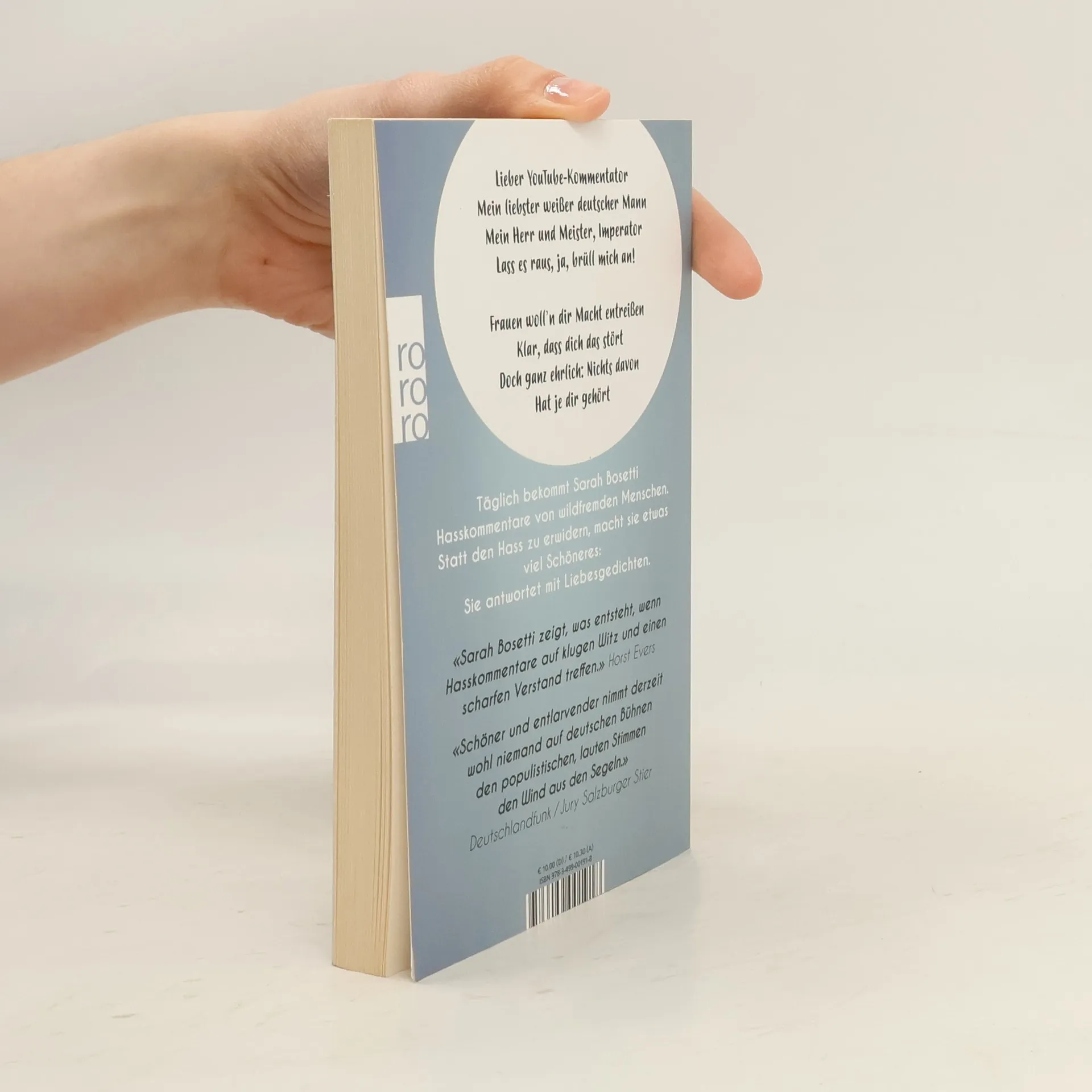 Als Frau, die sich am öffentlichen politischen Diskurs beteiligt, bekommt Sarah Bosetti fast täglich Hasskommentare im Internet. Doch die radioeins- und WDR2-Kolumnistin hasst nicht zurück, sondern nutzt den Hass als kreatives Rohmaterial und verwandelt ihn in seine schöne große Schwester: Liebe! In diesem Buch versammelt sie die schlimmsten Kommentare, macht aus ihnen pointierte, charmante Liebesgedichte – und setzt damit ein kluges, scharfzüngiges und sehr unterhaltsames Zeichen gegen den Hass in unserer Gesellschaft.