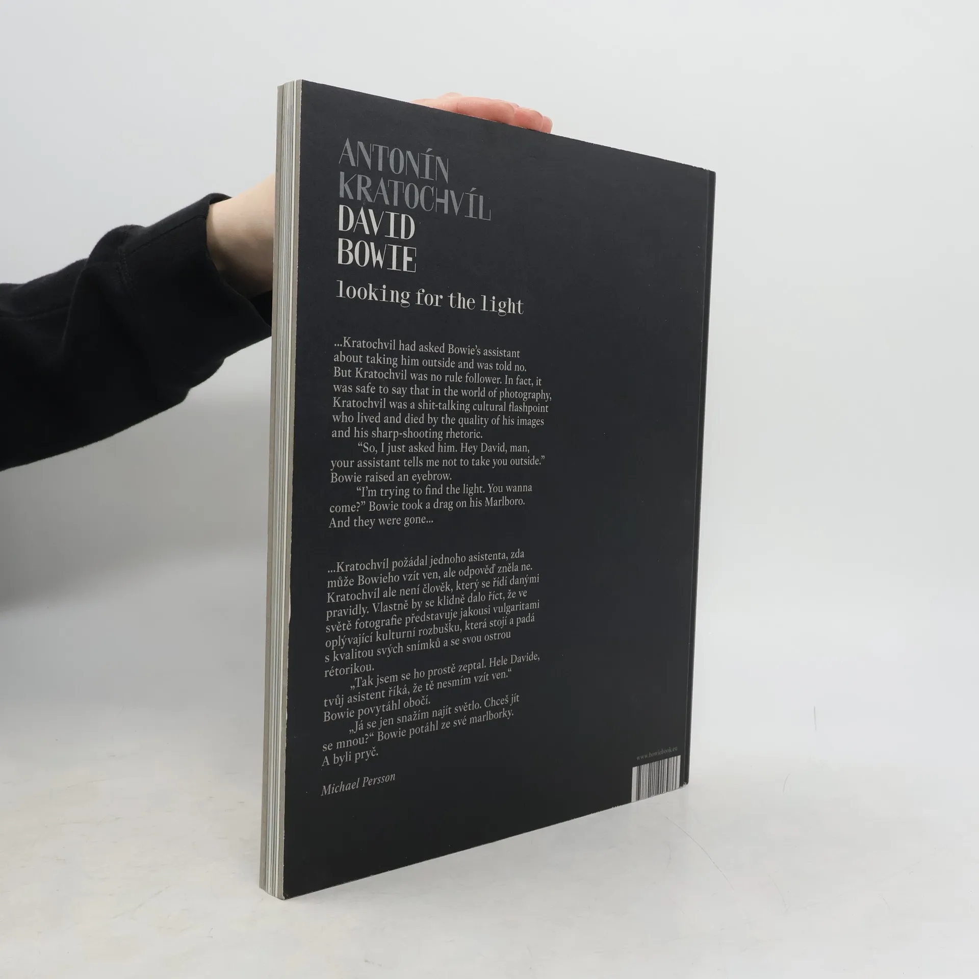 …Kratochvíl požádal jednoho asistenta, zda může Bowieho vzít ven, ale odpověď zněla ne. Kratochvíl ale není člověk, který se řídí danými pravidly. Vlastně by se klidně dalo říct, že ve světě fotografie představuje jakousi vulgaritami oplývající kulturní rozbušku, která stojí a padá s kvalitou svých snímků a se svou ostrou rétorikou. „Tak jsem se ho prostě zeptal. Hele Davide, tvůj asistent říká, že tě nesmím vzít ven.“ Bowie povytáhl obočí. „Já se jen snažím najít světlo. Chceš jít se mnou?“ Bowie potáhl ze své marlborky. A byli pryč...