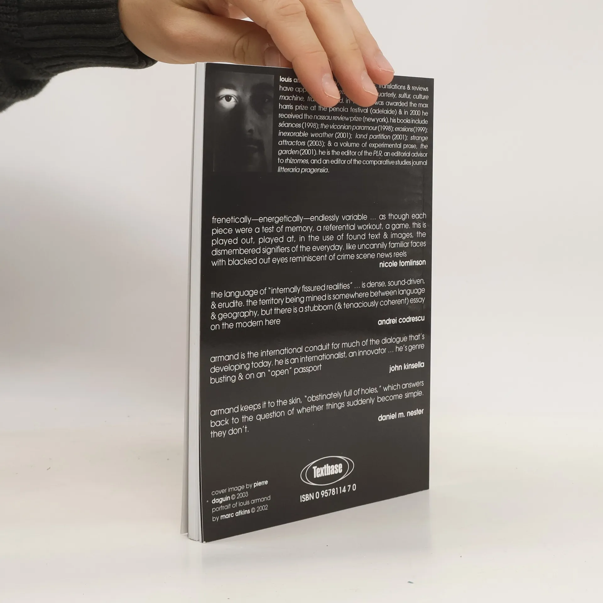 Armand is very much interested in the contemporary, and in this book he presents his reader with a bruising entourage of scenes, images and juxtapositions wrenched from combinations of everyday urban life and ideas --Michael Aikin, Cordite The suggestion, the promise of a narrative seems implicit in Armand’s work. ...As though each piece were a test of memory, a referential work out, a game. This is played out, played at, most obviously in the use of ... found images, the dismembered signifiers of the everyday. Uncannily familiar faces with blacked out eyes reminiscent of crime scene news reels ... --Nicole Tomlinson
