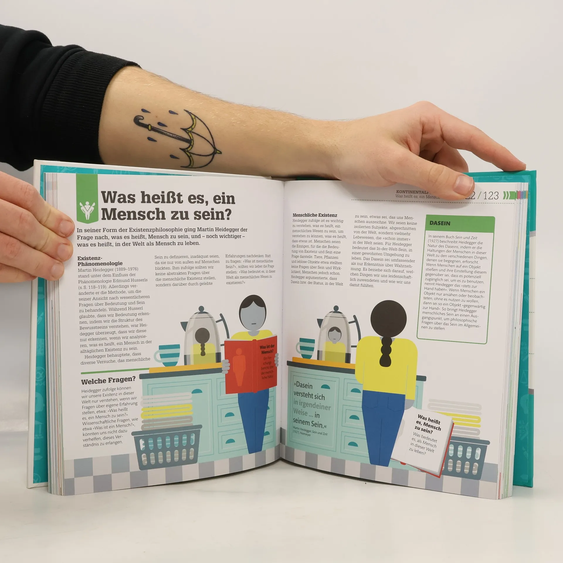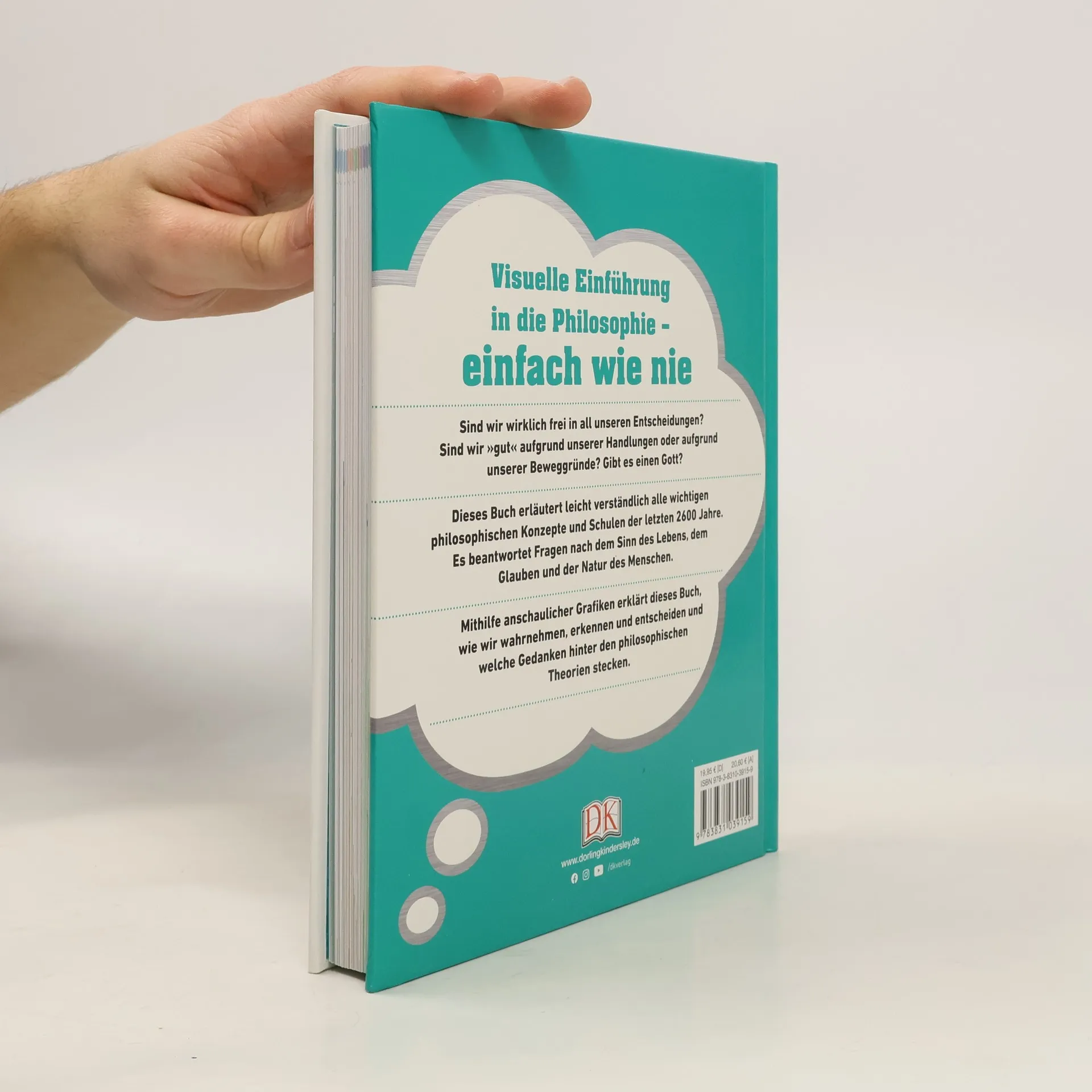 Spannende Philosophie-Themen verständlich erklärt! Sind wir wirklich frei in unseren Entscheidungen? Sind wir „gut“ aufgrund unserer Handlungen? Gibt es einen Gott? Leicht verständlich & anschaulich setzt sich dieses Philosophie-Buch mit den wichtigsten philosophischen Fragen auseinander: Innovative Grafiken erklären alle wichtigen philosophischen Konzepte der letzten 2.600 Jahre & erleichtern den Zugang zu komplexen Sachverhalten & Gedankengängen. Philosophische Fragen visuell aufbereitet: Durch die Kombination aus klaren Infografiken und leicht verständlichen Erläuterungen werden diese und noch viele weitere Fragen – u. a. auch zu brisanten ethischen Themen wie Euthanasie, Tierrechten oder Klonen – selbst für Laien greifbar und zugänglich. Von Platons Höhlengleichnis bis zum Einschätzen von Argumenten beleuchtet dieses originelle Philosophie-Buch ausführlich Theorien und Konzepte namhafter Philosophen aus den Bereichen Logik, Ethik, Erkenntnistheorie, Phänomenologie, Moral und Sprache. Spannende Philosophie-Themen in 7 großen Kapiteln: - Grundlagen. - Analytische Philosophie. - Kontinentalphilosophie. - Geistesphilosophie. - Richtig und Falsch. - Politische Philosophie. - Logik. Eine visuelle Reise in die Tiefen der Philosophie, um sich selbst besser zu verstehen. Das Buch eignet sich auch bestens als Nachschlagewerk für Schule oder Studium!