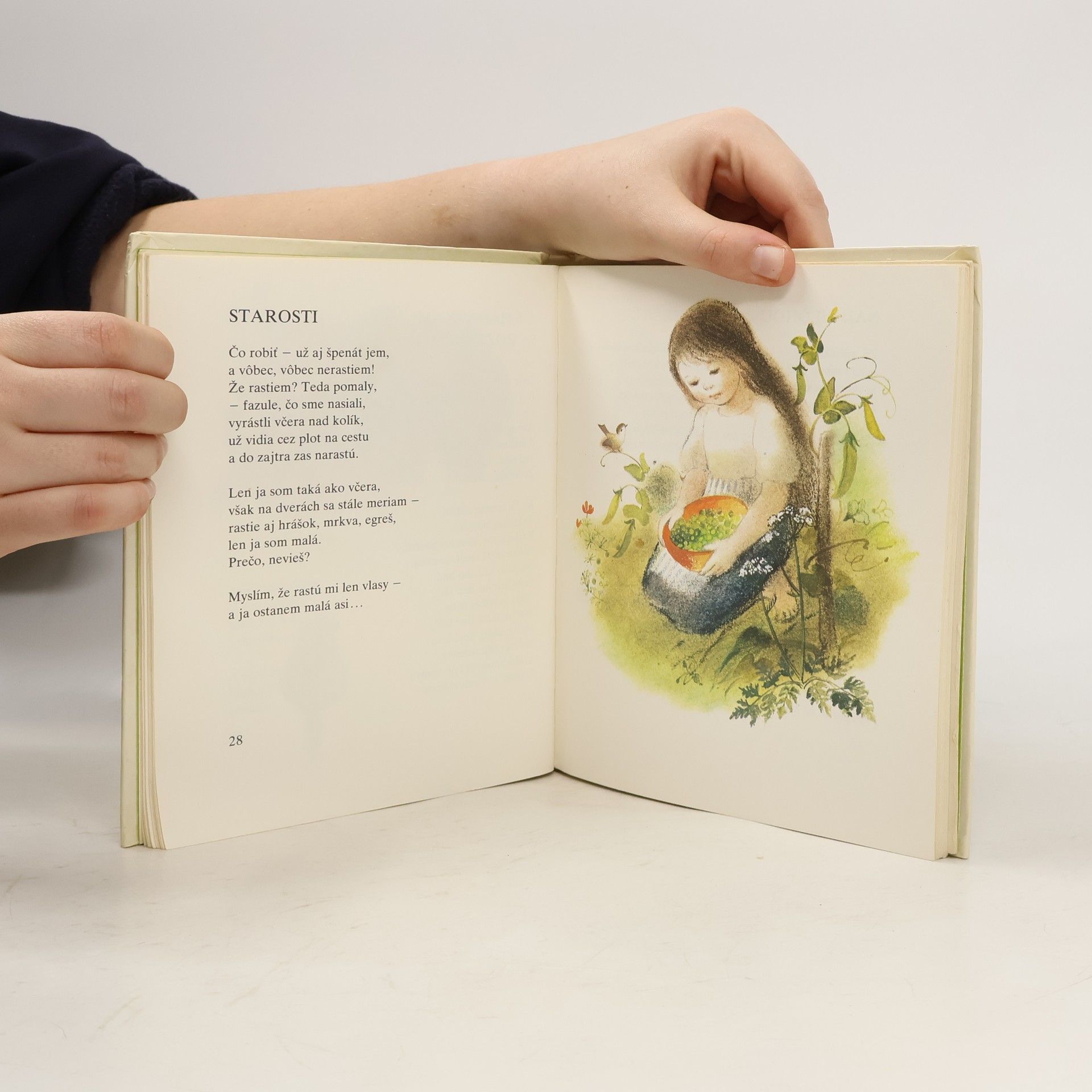 V knižke sa nachádza básnička Svieť, slniečko. Jej znenie: Svieť, slniečko, poľahučky, pozmetaj sneh z našej lúčky, veď snežienka poriadne bez tepláčkov prechladne! Len na vŕšok ešte nesvieť, zajtra hádam, ale nie hneď, na saniach sa zveziem rád z vŕška ešte zopárkrát! Všetky básničky v knižke: Zvedavý, Šťastie-Balónik, Odkiaľ sa berie, Maliny, Šťastie, Ráno na svete, List spoza mora, Prečo ?, Aj tú druhú, Schody, Večer s otcom, Na podstreší, Predstavte si..., Schody pre nás, Hádanka, Slnečnica, A ešte hádanka, Nad rozprávkou, Pretože, A s hádankami sa roztrhlo vrece, Starosti , Nad úlohou, Bager, Už viem čítať, Zvada, Sestrička, Svetlá, Zajtra ráno. Žabka na autostráde-Nanuk, To je dačo pre slimáka, Povedala žabka žabke, Hostina, Za Smolíčkom, Bosý syslík, Záhradník, Maco-spáč, Pred cestou, Mne je doma dobre, Labute, Vetrík a vetrík, Keď som sa hral na motýľa, A vy ešte... ?, Pod jelšami. Pri studni-Víly, Drevenička, U starej mamy, Briezka, V lejaku, Na piesku, Plno zlata, List, Orechy, Strašiak, Jabĺčka, Zatras, vetrík, Čo nevidela lastovička, Kamaráti, Vetrík, Jarok, Autobus, Pred zimou, Večer, Pred spaním, Padá sniežik, Prvá vločka, Nad klziskom, Nespokojný, Bojazlivý snehuliak, Snežienka, Snehuliaci, Idú smriečky, Svieť, slniečko, Premeny, Čo je báseň, Ticho. Prvé vydanie. Cena knihy v čase vydania: 20.- Kčs.