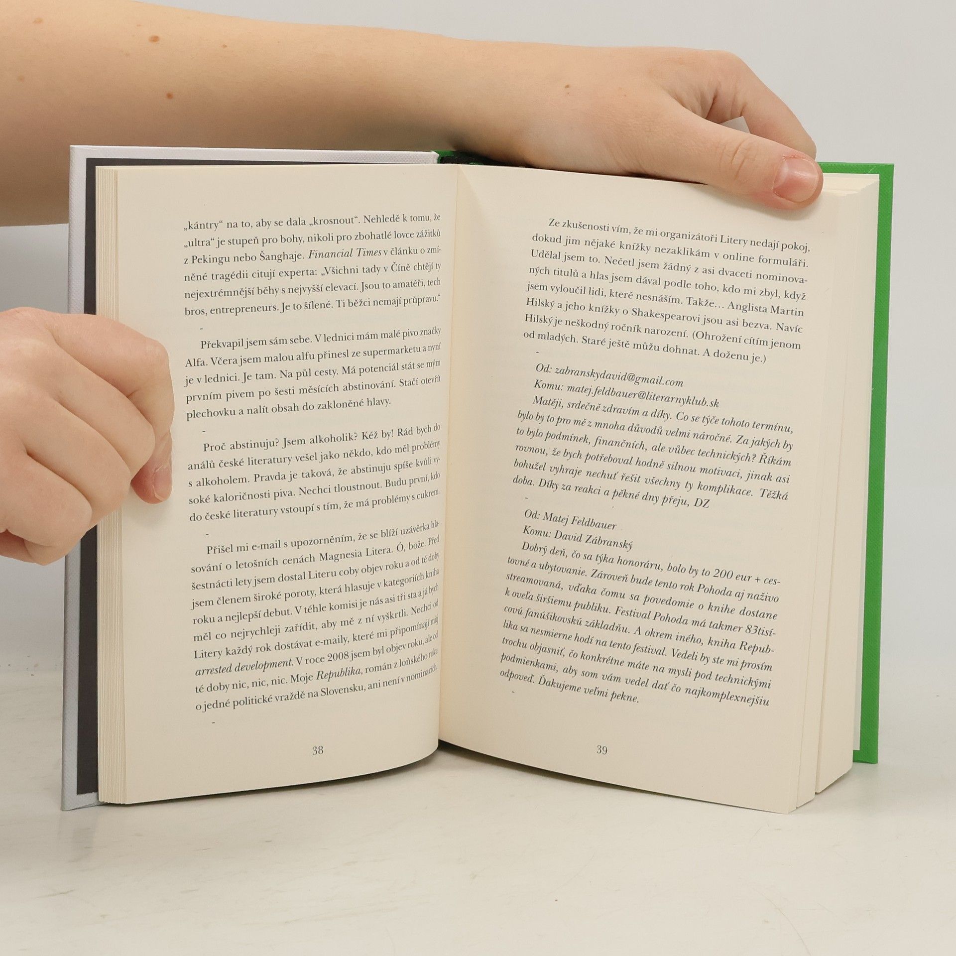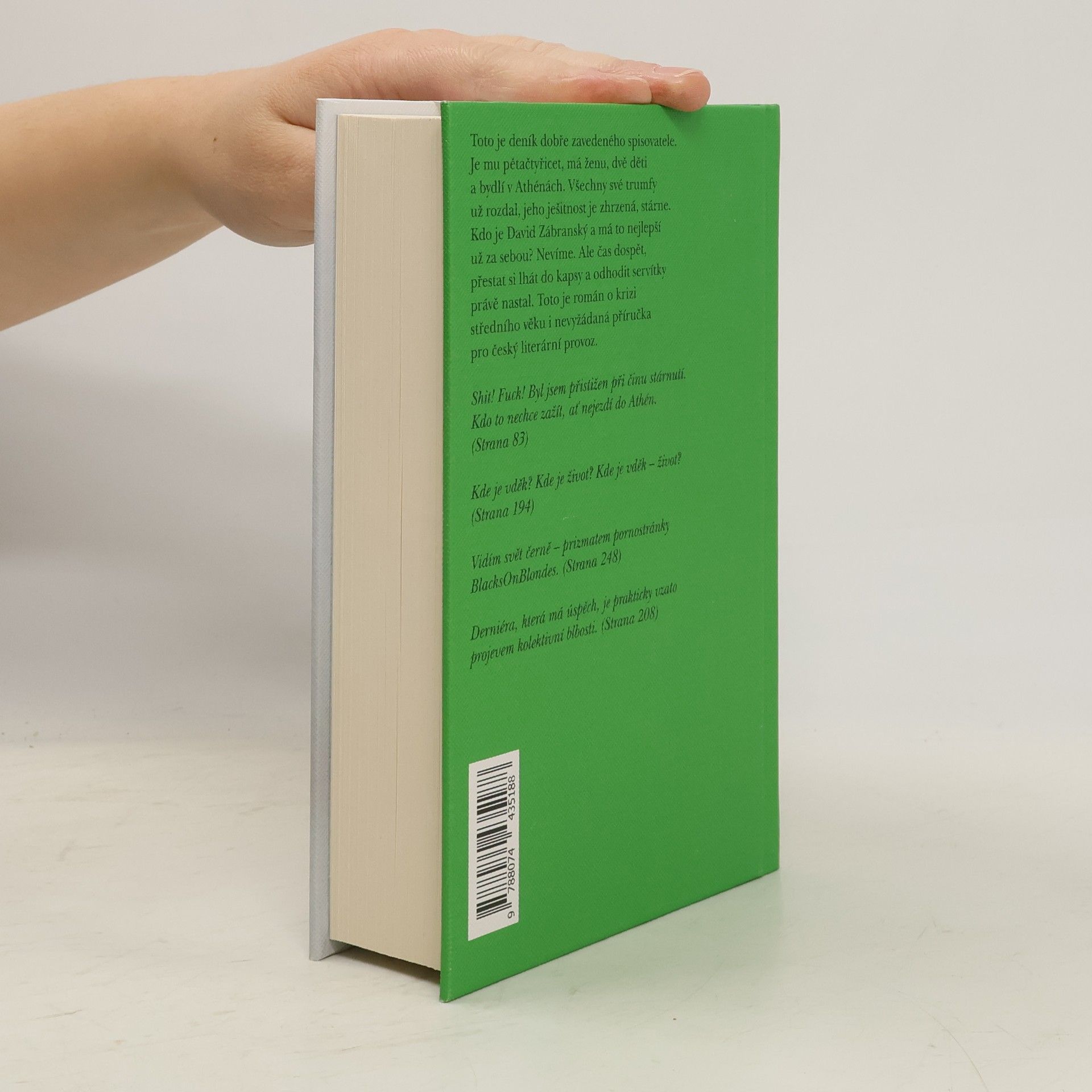 Toto je deník dobře zavedeného spisovatele. Je mu pětačtyřicet, má ženu, dvě děti a bydlí v Athénách. Všechny své trumfy už rozdal, jeho ješitnost je zhrzená, stárne. Kdo je David Zábransky a má to nejlepší už za sebou? Nevíme. Ale čas dospět, přestat si lhát do kapsy a odhodit servítky právě nastal. Toto je román o krizi středního věku i nevyžádaná přírucka pro česky literární provoz. Shit! Fuck! Byl jsem přistižen při činu stárnutí. Kdo to nechce zažít, ať nejezdí do Athén. (Strana 83) Kde je vděk? Kde je život? Kde je vděk – život? (Strana 194) Vidím svět černě – prizmatem pornostránky BlacksOnBlondes. (Strana 248) Derniéra, která má úspěch, je prakticky vzato projevem kolektivní blbosti. (Strana 208)