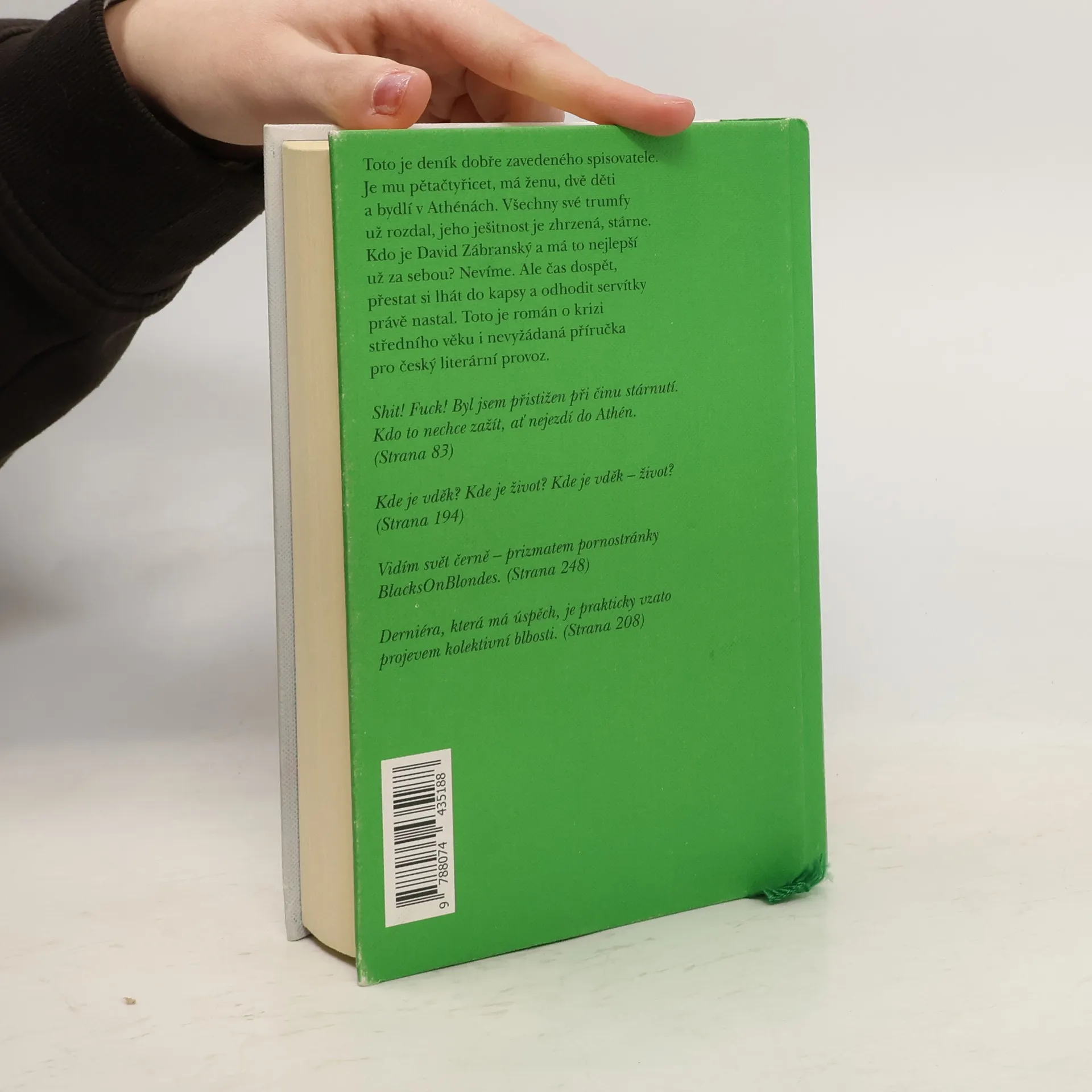 Toto je deník dobře zavedeného spisovatele. Je mu pětačtyřicet, má ženu, dvě děti a bydlí v Athénách. Všechny své trumfy už rozdal, jeho ješitnost je zhrzená, stárne. Kdo je David Zábransky a má to nejlepší už za sebou? Nevíme. Ale čas dospět, přestat si lhát do kapsy a odhodit servítky právě nastal. Toto je román o krizi středního věku i nevyžádaná přírucka pro česky literární provoz. Shit! Fuck! Byl jsem přistižen při činu stárnutí. Kdo to nechce zažít, ať nejezdí do Athén. (Strana 83) Kde je vděk? Kde je život? Kde je vděk – život? (Strana 194) Vidím svět černě – prizmatem pornostránky BlacksOnBlondes. (Strana 248) Derniéra, která má úspěch, je prakticky vzato projevem kolektivní blbosti. (Strana 208)