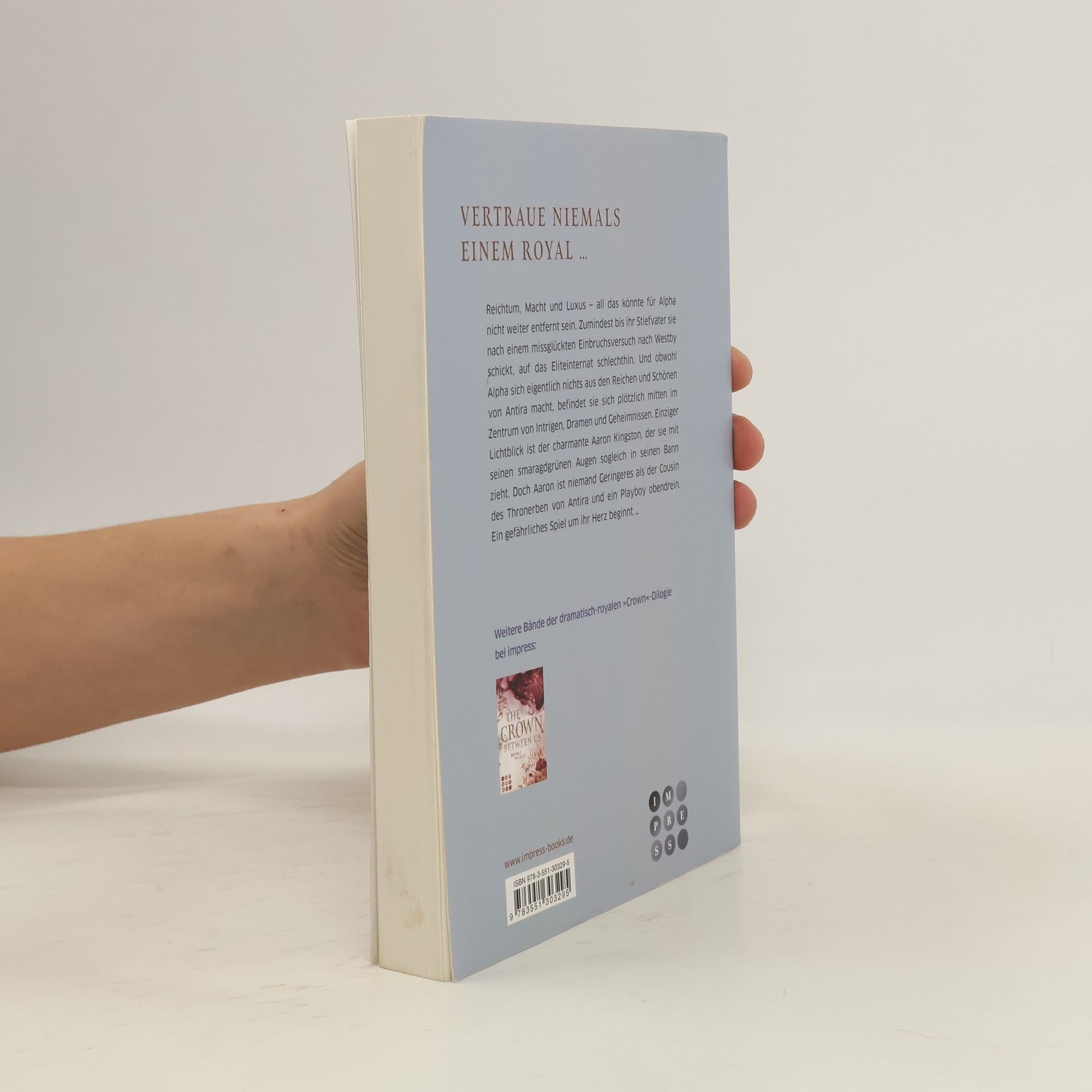 **Vertraue niemals einem Royal ...** Reichtum, Macht und Luxus – all das könnte für Alpha nicht weiter entfernt sein. Zumindest bis ihr Stiefvater sie nach einem missglückten Einbruchsversuch nach Westby schickt, auf das Eliteinternat schlechthin. Und obwohl Alpha sich eigentlich nichts aus den Reichen und Schönen von Antira macht, befindet sie sich plötzlich mitten im Zentrum von Intrigen, Dramen und Geheimnissen. Einziger Lichtblick ist der charmante Aaron Kingston, der sie mit seinen smaragdgrünen Augen sogleich in seinen Bann zieht. Doch Aaron ist niemand Geringeres als der Cousin des Thronerben von Antira und ein Playboy obendrein. Ein gefährliches Spiel um ihr Herz beginnt ... Pflicht oder Liebe? Ein royales Geheimnis, ein königlicher Bad Boy und eine starke Frau, in der mehr steckt, als sie ahnt. Knisternd und herzzerreißend spannend bis zur letzten Seite! Persönliche Leseempfehlung von Julia, der bekannten Bloggerin von July_reads: »Ich war völlig sprachlos, fasziniert und absolut mitgerissen von diesem Buch.« //Dies ist der erste Band der dramatisch-royalen »Crown«-Dilogie. Alle Romane der fesselnden Lovestory bei Impress: -- The Crown Between Us. Royales Geheimnis -- The Crown Between Us. Royale Pflicht (Februar 2021)//