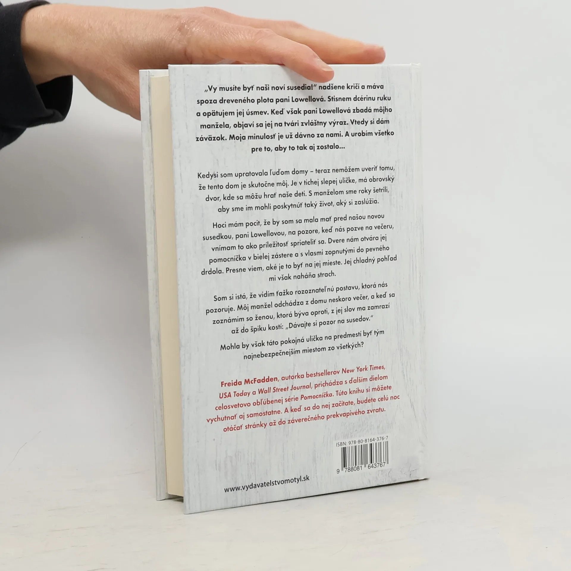 „Vy musíte byť naši noví susedia!“ nadšene kričí a máva pani Lowellová. Stisnem dcérinu ruku a opätujem jej úsmev, no keď zbadá môjho manžela, na jej tvári sa objaví zvláštny výraz. Vtedy si dávam záväzok: moja minulosť je za mnou a urobím všetko pre to, aby to tak aj zostalo. Kedysi som upratovala domy, a teraz nemôžem uveriť, že tento dom je môj. S manželom sme roky šetrili, aby sme našim deťom poskytli lepší život. Hoci mám pocit, že by som sa mala pred pani Lowellovou mať na pozore, jej pozvanie na večeru vnímam ako príležitosť spriateliť sa. Dvere nám otvára jej pomocníčka v bielej zástere, ktorej chladný pohľad ma desí. Zrazu si všimnem postavu, ktorá nás pozoruje. Môj manžel odchádza neskoro večer a keď sa zoznamujem so ženou z protiľahlého domu, jej slová ma zamrazia: „Dávajte si pozor na susedov.“ Môže byť táto pokojná ulička na predmestí najnebezpečnejším miestom zo všetkých? Freida McFadden, autorka bestsellerov, prichádza s ďalším dielom v obľúbenej sérii Pomocníčka. Kniha sa dá vychutnať aj samostatne a keď sa do nej začítate, budete otáčať stránky až do záverečného zvratu.