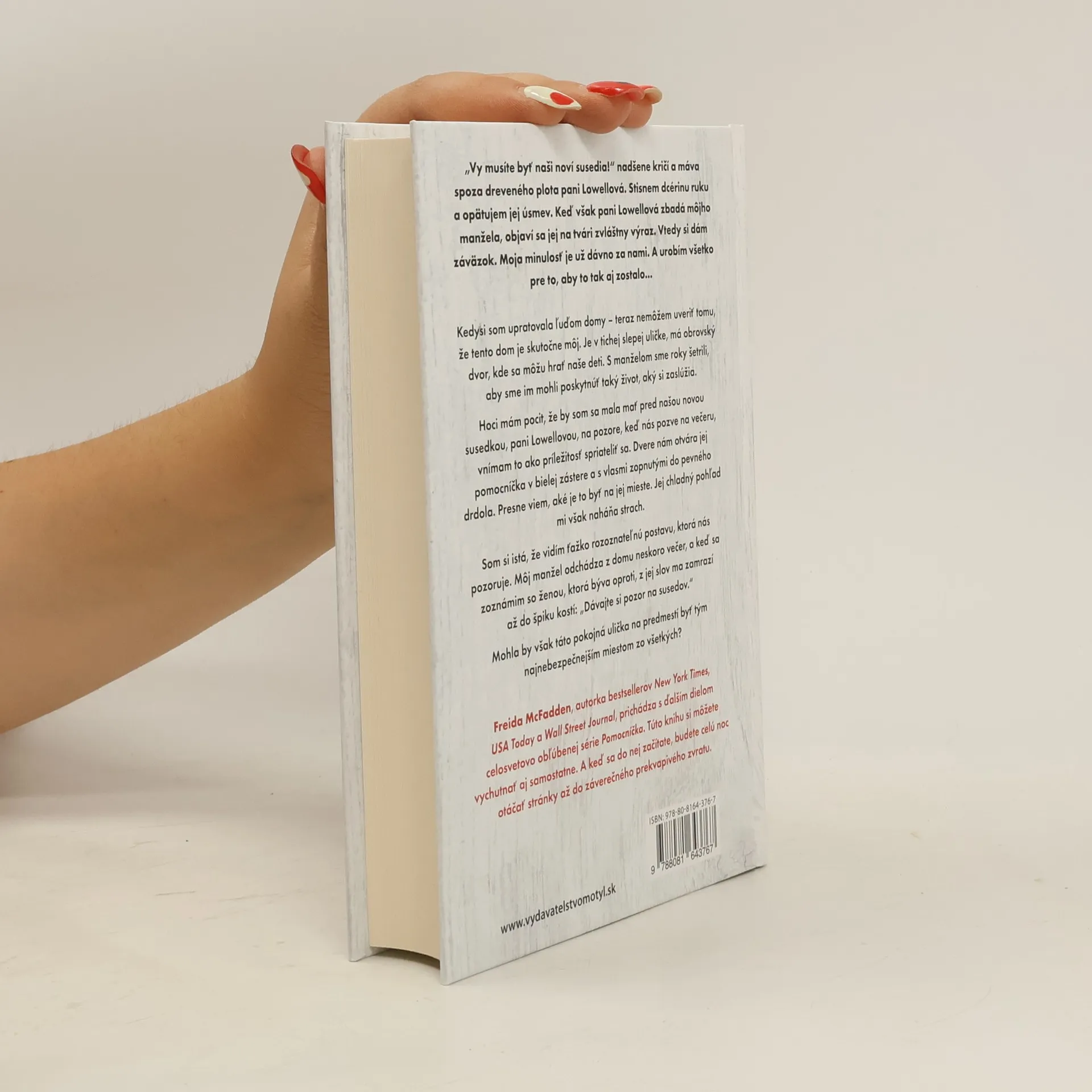 „Vy musíte byť naši noví susedia!“ nadšene kričí a máva pani Lowellová. Stisnem dcérinu ruku a opätujem jej úsmev, no keď zbadá môjho manžela, na jej tvári sa objaví zvláštny výraz. Vtedy si dávam záväzok: moja minulosť je za mnou a urobím všetko pre to, aby to tak aj zostalo. Kedysi som upratovala domy, a teraz nemôžem uveriť, že tento dom je môj. S manželom sme roky šetrili, aby sme našim deťom poskytli lepší život. Hoci mám pocit, že by som sa mala pred pani Lowellovou mať na pozore, jej pozvanie na večeru vnímam ako príležitosť spriateliť sa. Dvere nám otvára jej pomocníčka v bielej zástere, ktorej chladný pohľad ma desí. Zrazu si všimnem postavu, ktorá nás pozoruje. Môj manžel odchádza neskoro večer a keď sa zoznamujem so ženou z protiľahlého domu, jej slová ma zamrazia: „Dávajte si pozor na susedov.“ Môže byť táto pokojná ulička na predmestí najnebezpečnejším miestom zo všetkých? Freida McFadden, autorka bestsellerov, prichádza s ďalším dielom v obľúbenej sérii Pomocníčka. Kniha sa dá vychutnať aj samostatne a keď sa do nej začítate, budete otáčať stránky až do záverečného zvratu.