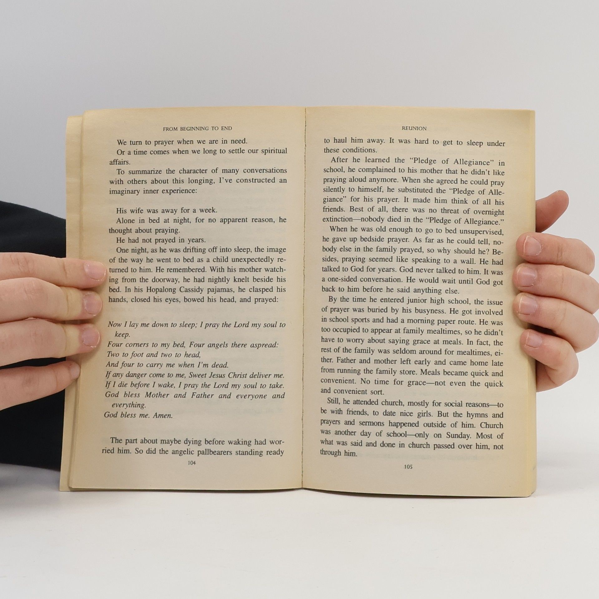 FROM BEGINNING TO END Why "rituals"? My thinking was set in motion by those who, knowing I was a parish minister for many years, have asked me for advice about ceremonies and celebrations. They wanted words to use at graduations, funerals, and the welcoming of children. They inquired about grace at family meals, the reaffirmation of wedding vows, and ways to heal wounds suffered in personal conflict. People requested help with the rituals of solitude, such as meditation, prayer, and contemplation. . . . Rituals do not always involve words, occasions, officials, or an audience. Rituals are often silent, solitary, and self-contained. The most powerful rites of passage are reflective--when you look back on your life again and again, paying attention to the rivers you have crossed and the gates you have opened and walked on through, the thresholds you have passed over. I see ritual when people sit together silently by an open fire. Remembering. As human beings have remembered for thousands and thousands of years. FULGHUM