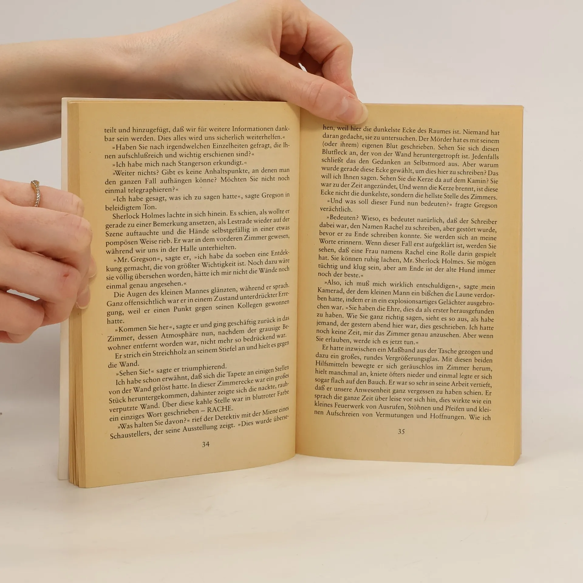 Durch die Vermittlung eines alten Bekannten lernt Dr. Watson, der sich nach seiner Rückkehr aus den Kolonien wieder in London aufhält, Sherlock Holmes kennen, einen Sonderling, dessen Verhalten, aber auch Wissen Watson immer wieder verblüfft. Sherlock Holmes, der studiert, beobachtet und deduziert, bezieht mit dem vom Afghanistanfeldzug und der darauffolgenden Typhuserkrankung geschwächten Watson eine Wohnung in der Baker Street, den Ausgangspunkt für etliche Abenteuer, in die beide verstrickt werden. Watson, seines Zeichens Militärarzt, und der penible Detektiv werden bald nach ihrem Kennenlernen in einen höchst mysteriösen Fall verwickelt, der mit einem Mord und dem mit Blut geschriebenen Wort „Rache“ beginnt. Waren Anarchisten am Werk? Wurde eine Fehde vom Festland in England ausgetragen? Wem gehörte der Ring vom Tatort? Fragen über Fragen… Kann Sherlock Holmes den Fall lösen?