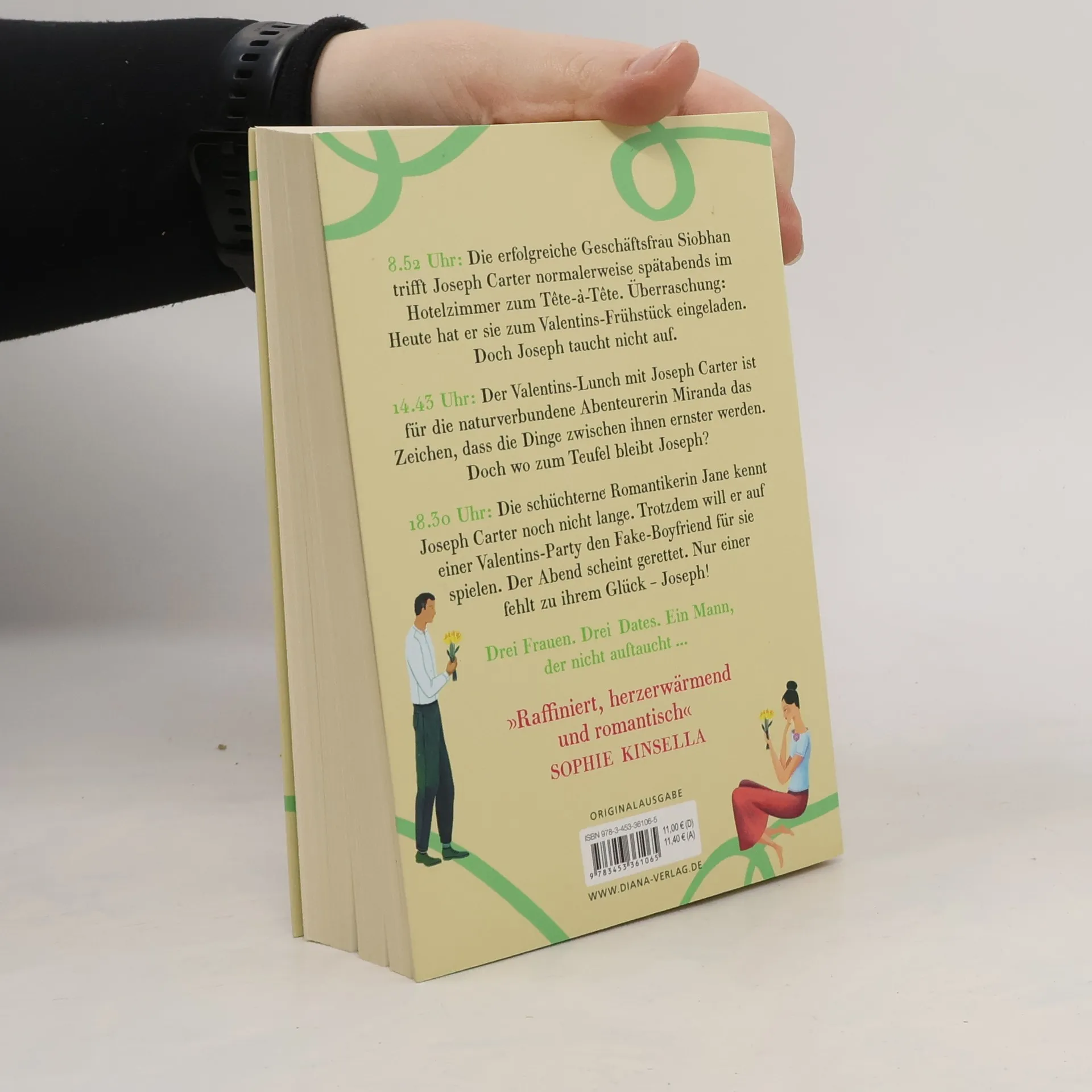 Drei Frauen. Drei Dates. Ein Mann, der nicht auftaucht … 8.52 Uhr: Siobhan ist mit Joseph Carter zum Frühstück verabredet. Sie war überrascht, als er das Date vorschlug – sonst trifft sie ihn spät abends im Hotelzimmer. Frühstück mit Joseph am Valentinstag bedeutet sicherlich etwas. Aber wo bleibt er nur? 14.43 Uhr: Der Valentins-Lunch mit Joseph Carter ist für Miranda das Zeichen, dass die Dinge zwischen ihnen ernster werden. Wann er wohl endlich kommt? 18.30 Uhr: Auf einer Verlobungsparty will Joseph Carter für Jane den Fake-Boyfriend spielen. Sie kennen sich noch nicht lange, aber ihre Verbindung ist schnell der beste Teil von Janes neuem Leben in Winchester geworden. Joseph hat versprochen, ihren Abend zu retten. Aber er ist nicht hier …