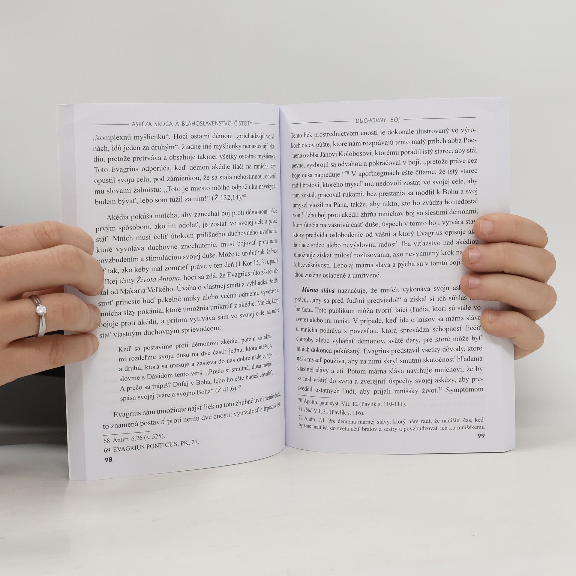 Predkladaná kniha Askéza srdca a blahoslavenstvo čistoty nás vovádza do aktívneho duchovného boja o čistotu srdca. Autor knihy na základe učenia púštnych otcov a asketických autorov oboznamuje čitateľa s ôsmimi zlými myšlienkami a liekmi, ktoré nám pomáhajú ich spoznať a zápasiť s nimi. Nechýbajú témy ako napr. rozlišovanie duchov, druhy oklamania, učenie sýrskych otcov o potrebe dosiahnuť čistotu srdca a priezračnú lásku. Askéza srdca je autorom predkladaná ako cesta k blahoslavenstvu čistoty srdca. Kniha tiež obsahuje dve prílohy, ktoré nadväzujú na obsahovú tému publikácie, a síce traktát O modlitbe od Evagria Pontského; a homíliu O svätosti a panenstve od sýrskeho mnícha a biskupa Martyria-Sahdonu. Kniha nie je určená len pre mníchov a mníšky, keďže mníšska skúsenosť predstavuje samé srdce kresťanského života, je možné predložiť ju všetkým veriacim ako vzorovú. Preto ponúka hlboký duchovný pokrm pre všetkých kresťanov, v ich každodennom úsilí o posvätenie života. Lebo askéza srdca nezahŕňa v sebe iba telesnú askézu a askézu mysle, ale aj vnemov, pocitov a naše vnútorné rozhodnutia, pretože srdce v biblickom význame vyjadruje hĺbku ľudskej bytosti.