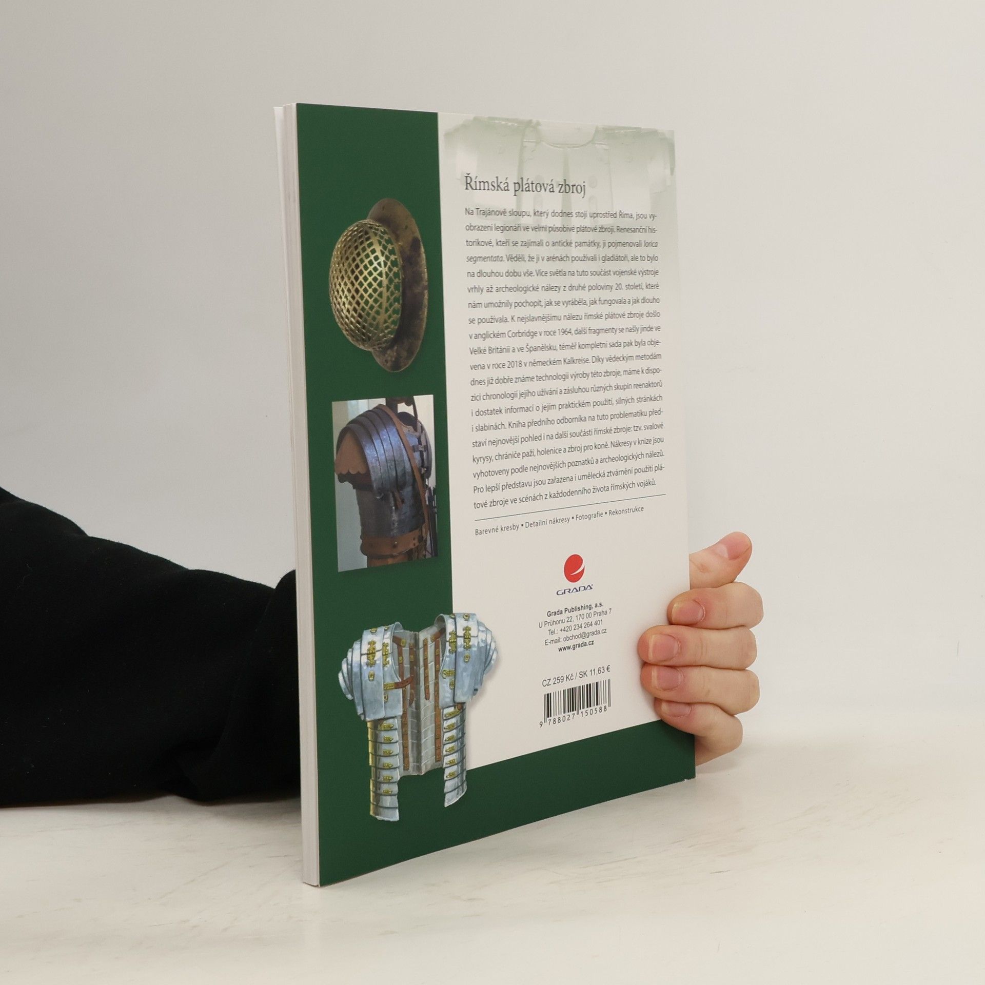 Na Trajánově sloupu, který dodnes stojí uprostřed Říma, jsou vyobrazeni legionáři ve velmi působivé plátové zbroji. Renesanční historikové, kteří se zajímali o antické památky, ji pojmenovali lorica segmentata. Věděli, že ji v arénách používali i gladiátoři, ale to bylo na dlouhou dobu vše. Více světla na tuto součást vojenské výstroje vrhly až archeologické nálezy z druhé poloviny 20. století, které nám umožnily pochopit, jak se vyráběla, jak fungovala a jak dlouho se používala. K nejslavnějšímu nálezu římské plátové zbroje došlo v anglickém Corbridge v roce 1964, další fragmenty se našly jinde ve Velké Británii a ve Španělsku, téměř kompletní sada pak byla objevena v roce 2018 v německém Kalkreise. Díky vědeckým metodám dnes již dobře známe technologii výroby této zbroje, máme k dispozici chronologií jejího užívání a zásluhou různých skupin reenaktorů i dostatek informací o jejím praktickém použití, silných stránkách i slabinách. Kniha předního odborníka na tuto problematiku představí nenovější pohled i na další součásti římské zbroje: tzv. svalové kyrysy, chrániče paží, holenice a zbroj pro koně. Nákresy v knize jsou vyhotoveny podle nejnovějších poznatků a archeologických nálezů. Pro lepší představu jsou zařazena i umělecká ztvárnění použití plátové zbroje ve scénách z každodenního života římských vojáků.